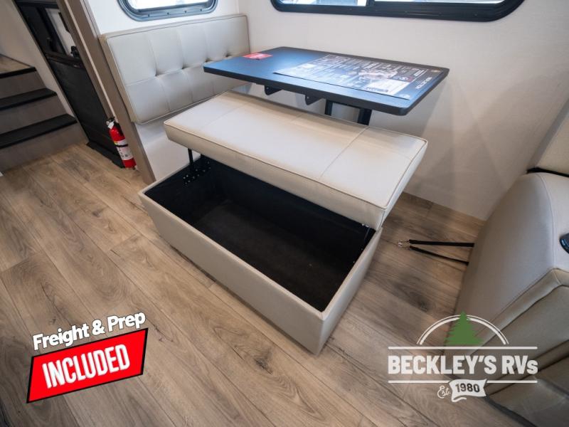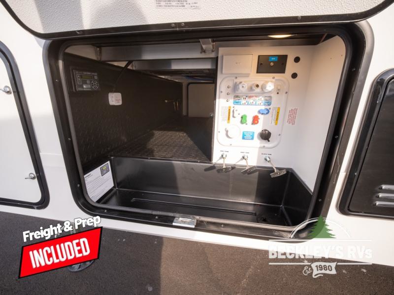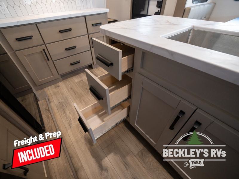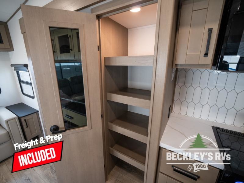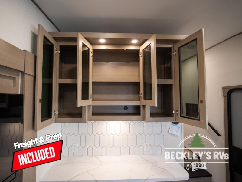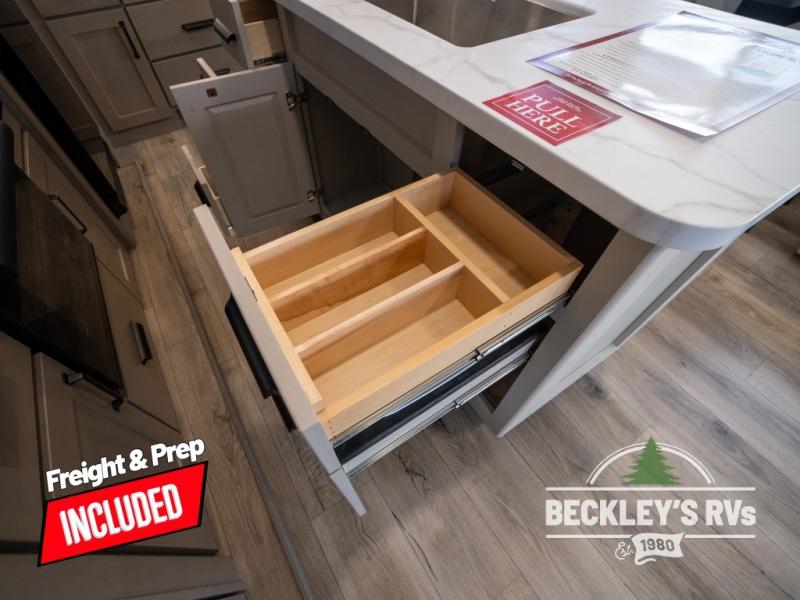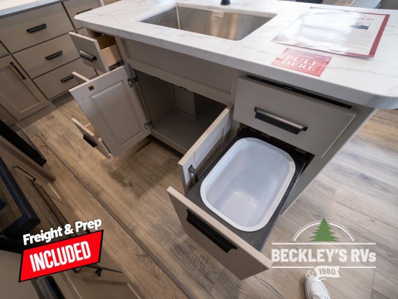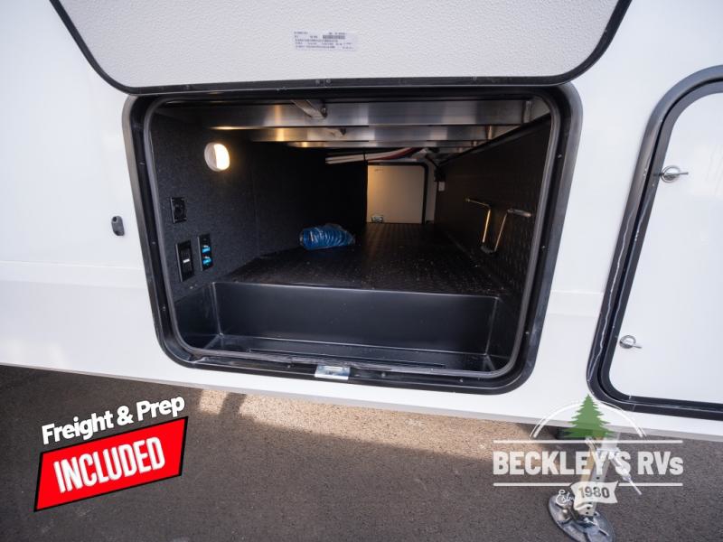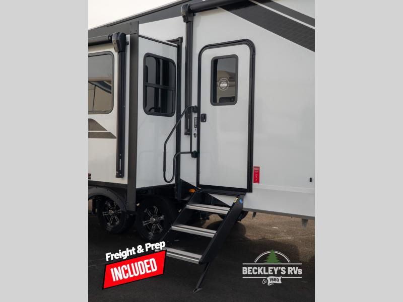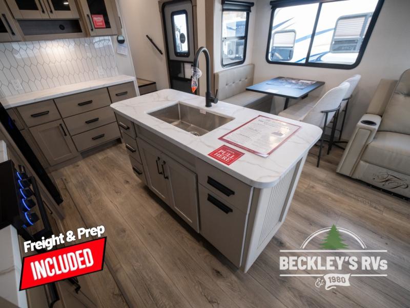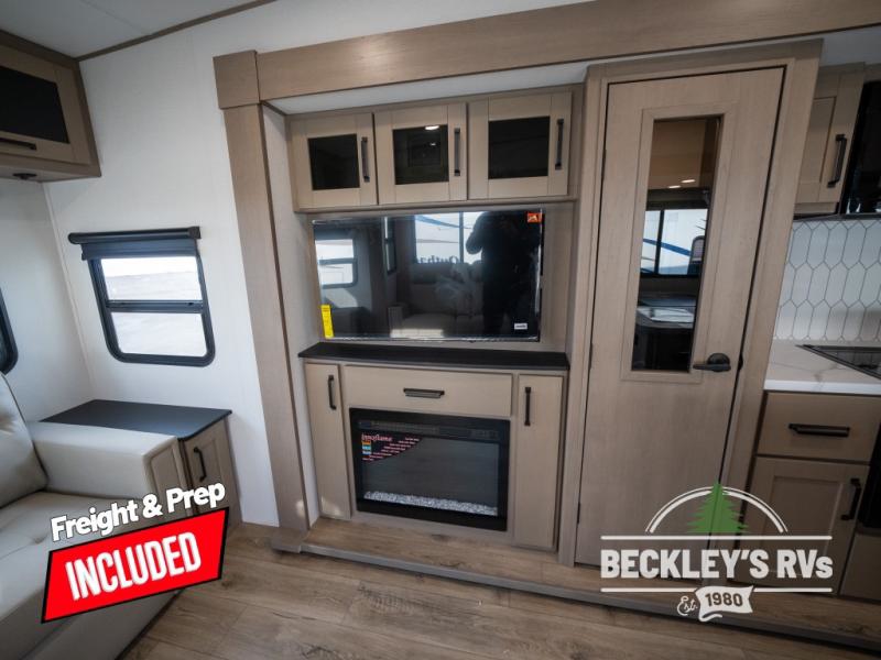 Get ready to enjoy everything the campgrounds and surrounding area has to offer when you are setup to camp in this fifth wheel! The two electric awnings offer protected areas creating outdoor living spaces; just grab your camping chairs from the unobstructed pass-through storage. And the interior offers a spacious living area and kitchen combination with dual opposing slides for maximum space. You can sit on the tri-fold sofa or the dinette to lounge back and rest after a day of adventure. The hutch and kitchen island offer counter space to prepare and serve meals, and there is a large pantry for goodies. The 40" LED HDTV with a fireplace below provides entertainment before bedtime or on a rainy day. And the front bedroom offers privacy, a walk-around queen bed, and plenty of storage!