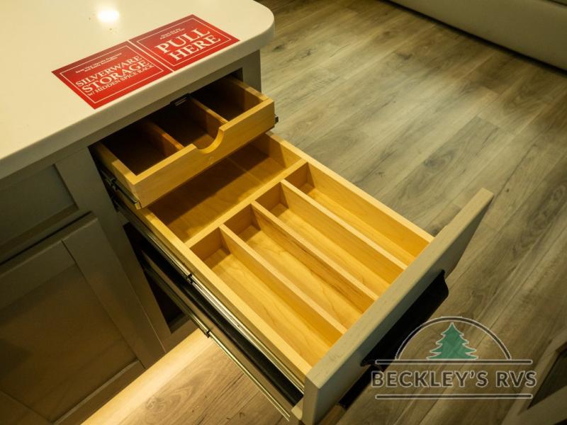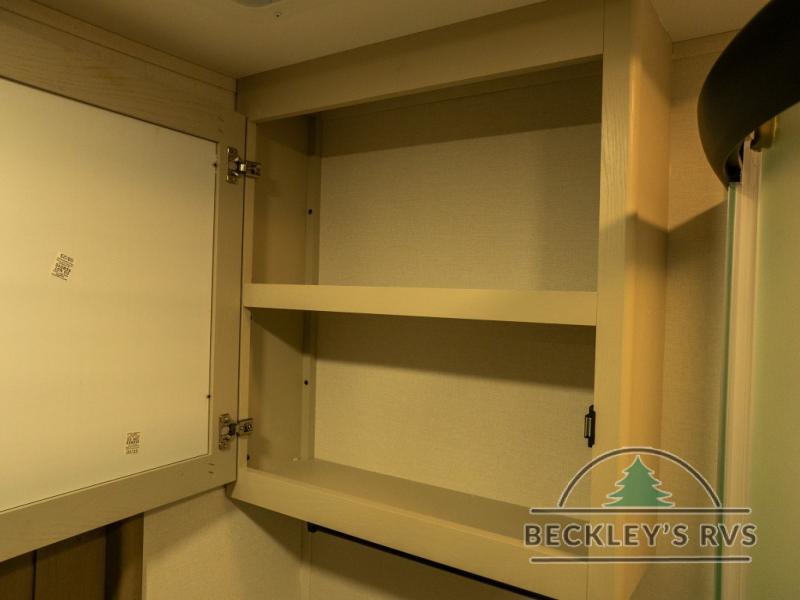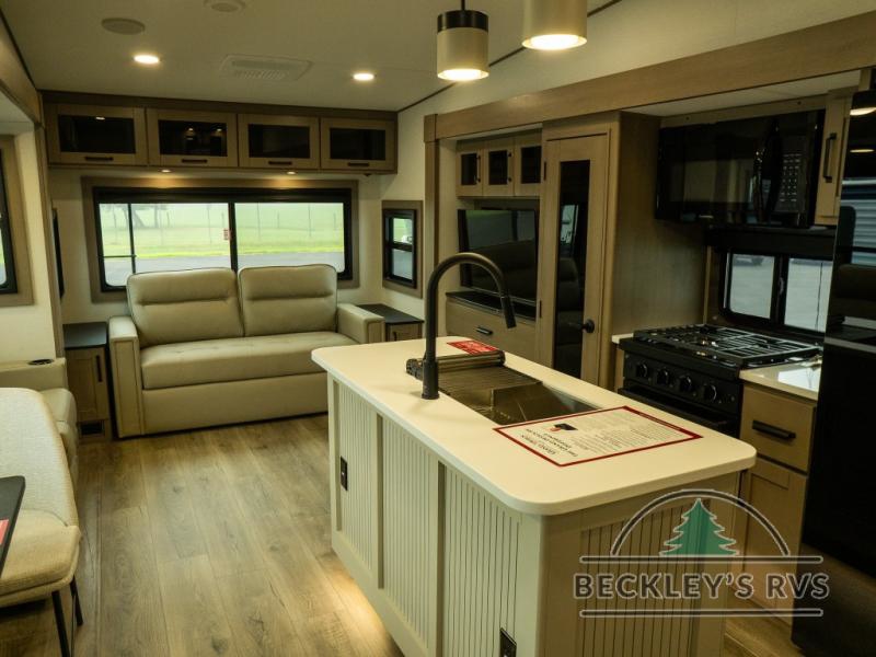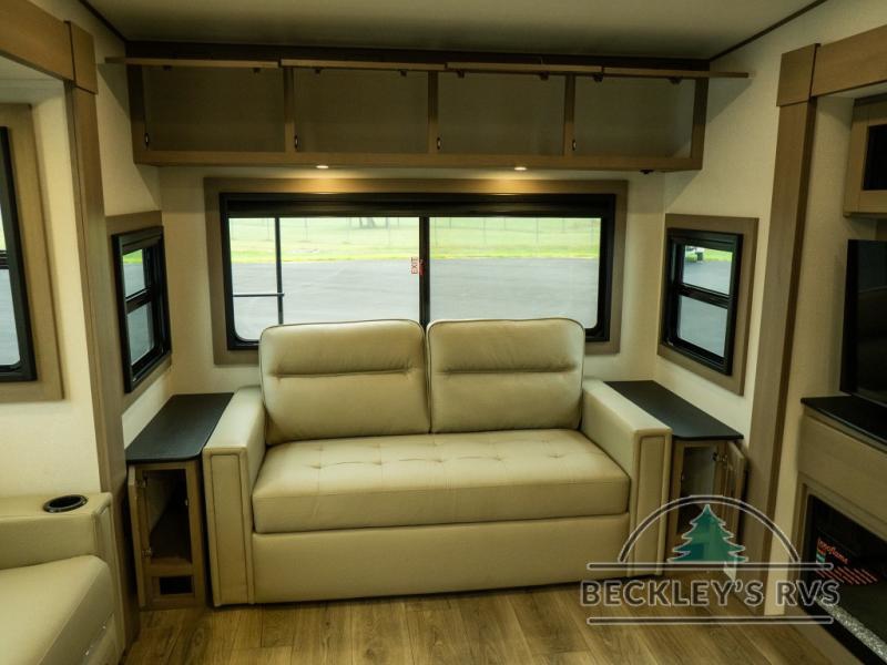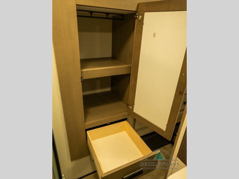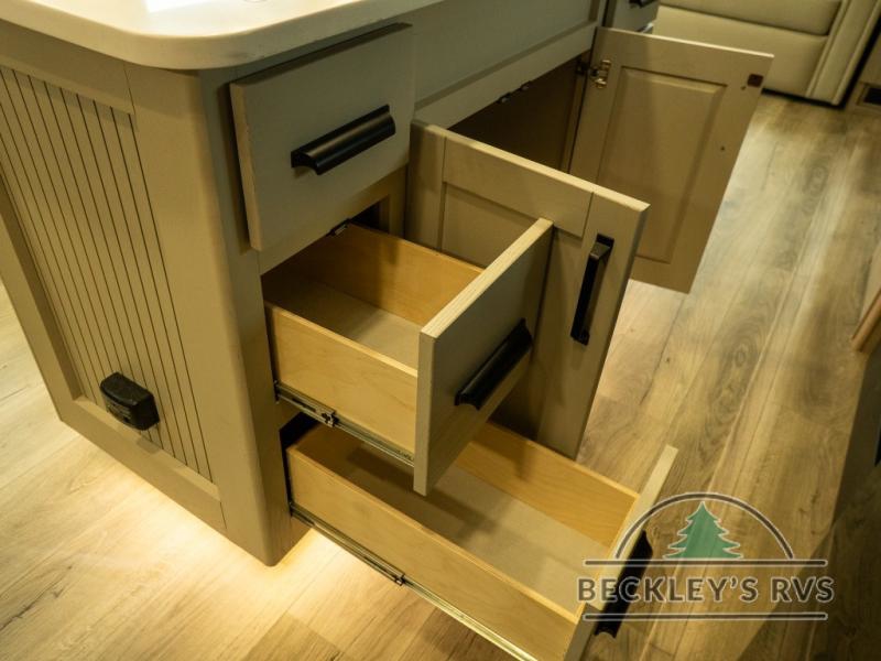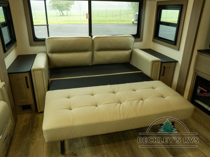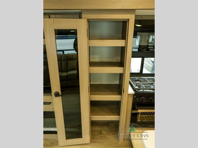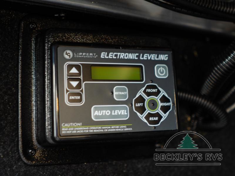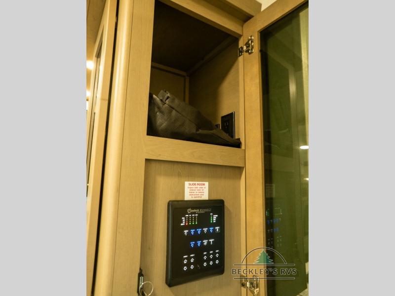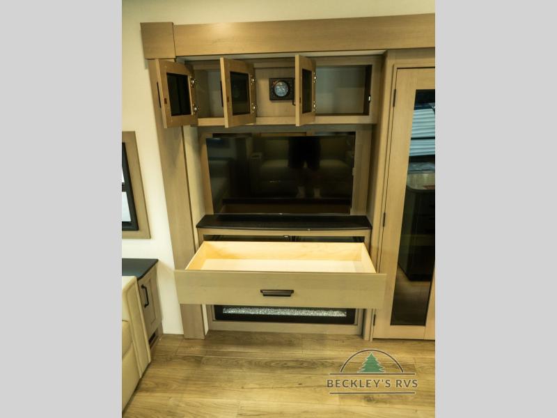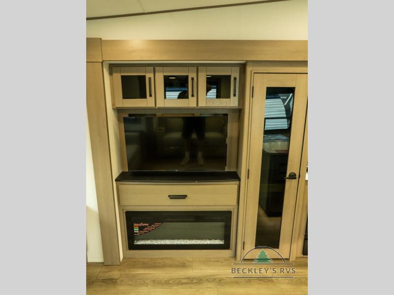 Whether you travel for pleasure or work, you will love the spacious main living and kitchen area with a rear tri-fold sofa that doubles as extra sleeping space, and the theater seating directly across from the entertainment center with a 40" LED HDTV and a fireplace below. The kitchen island will make meal prepping and drying the dishes easier and the hutch is the perfect place to place your picture frames, nice dishes, and extra cooking items. There is even a pantry that is big enough to store all of your favorite snacks, dry ingredients and such. Outside you can enjoy two electric awnings that provide protection from the elements as you relax and visit with other RVers, and your camping chairs can easily be stored in the pass-through compartment. The double entry bathroom is convenient especially at night when you can slide the door to enter from the front master bedroom. You will find plenty of storage for your clothing and gear, plus the bedroom slide out gives you drawers and linen storage that stretches into the full bathroom.