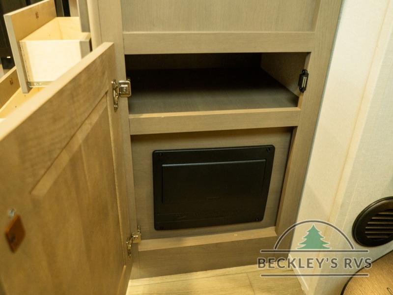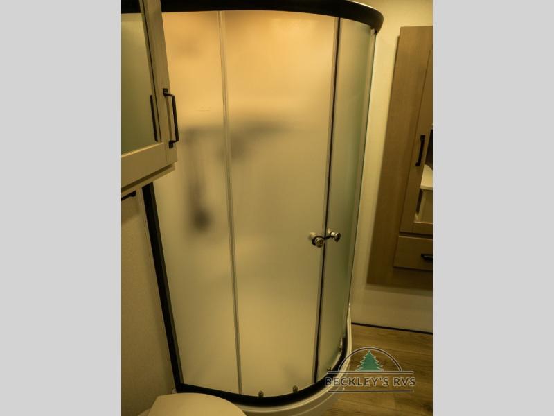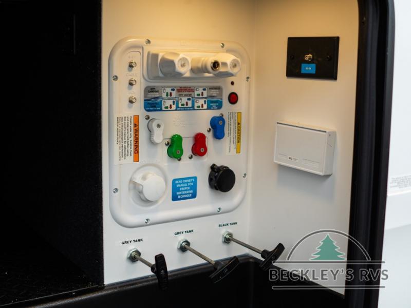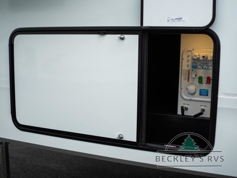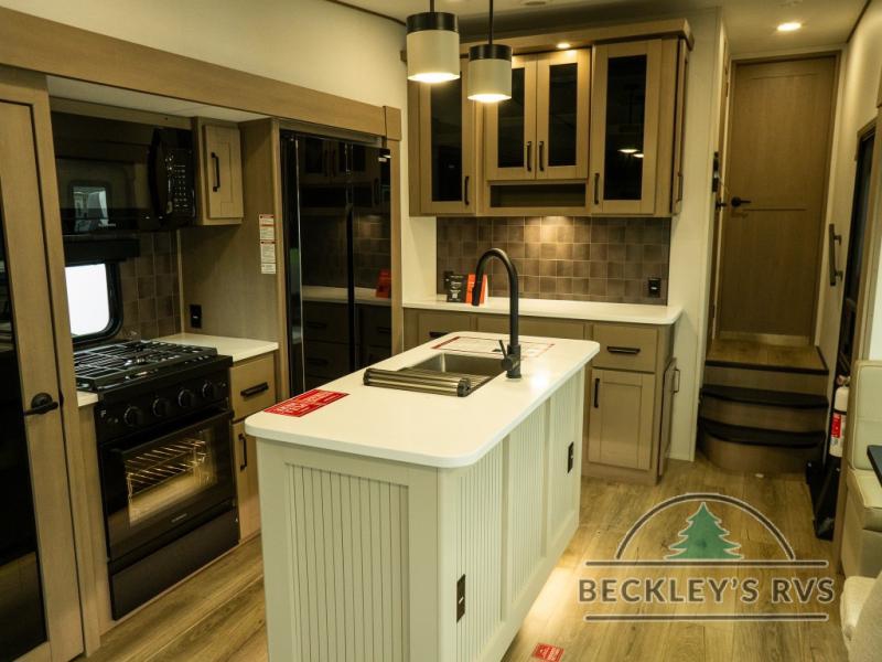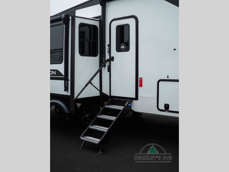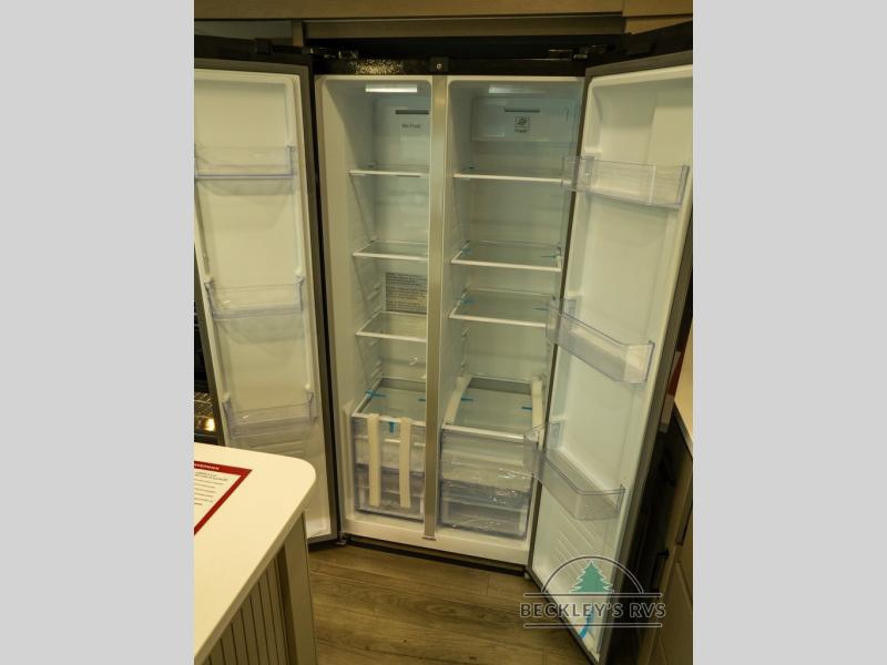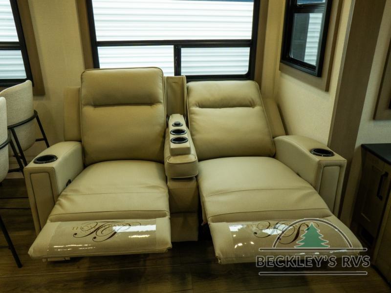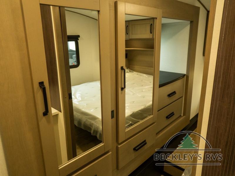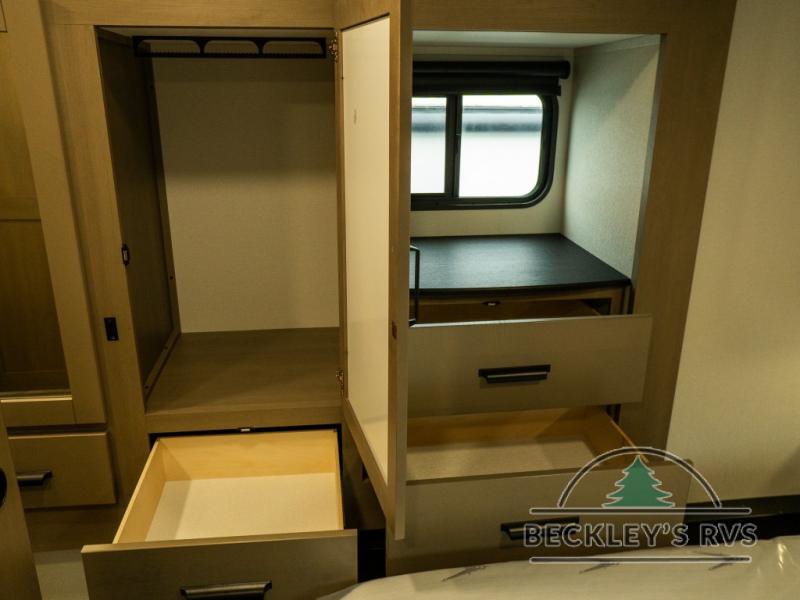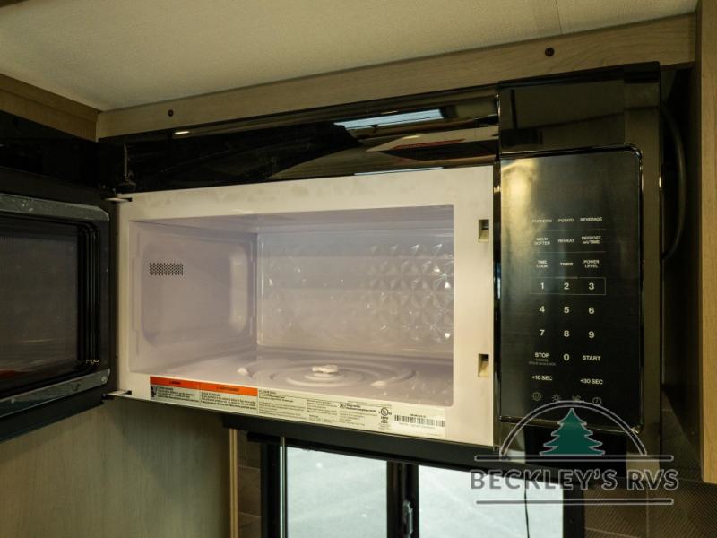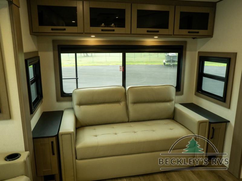 Whether you travel for pleasure or work, you will love the spacious main living and kitchen area with a rear tri-fold sofa that doubles as extra sleeping space, and the theater seating directly across from the entertainment center with a 40" LED HDTV and a fireplace below. The kitchen island will make meal prepping and drying the dishes easier and the hutch is the perfect place to place your picture frames, nice dishes, and extra cooking items. There is even a pantry that is big enough to store all of your favorite snacks, dry ingredients and such. Outside you can enjoy two electric awnings that provide protection from the elements as you relax and visit with other RVers, and your camping chairs can easily be stored in the pass-through compartment. The double entry bathroom is convenient especially at night when you can slide the door to enter from the front master bedroom. You will find plenty of storage for your clothing and gear, plus the bedroom slide out gives you drawers and linen storage that stretches into the full bathroom.