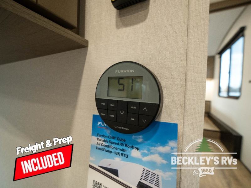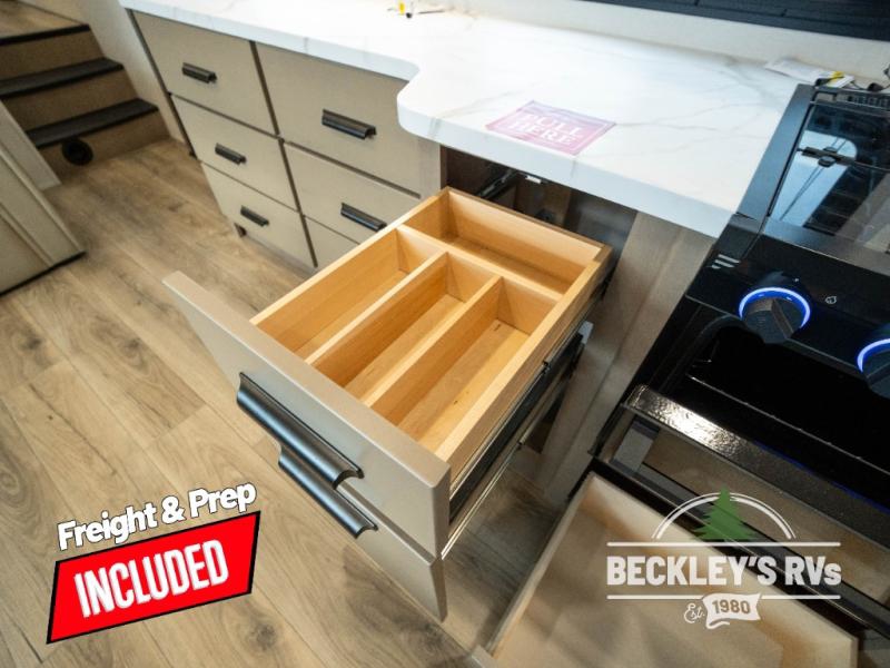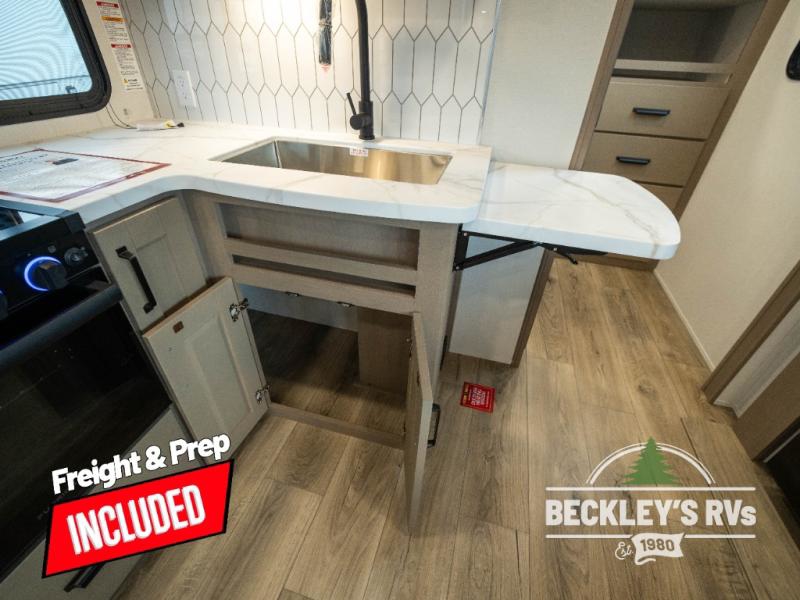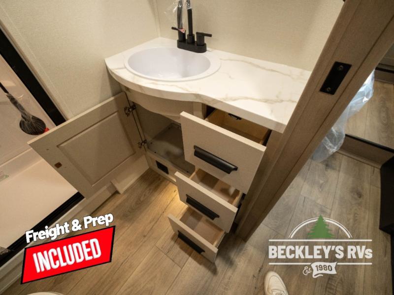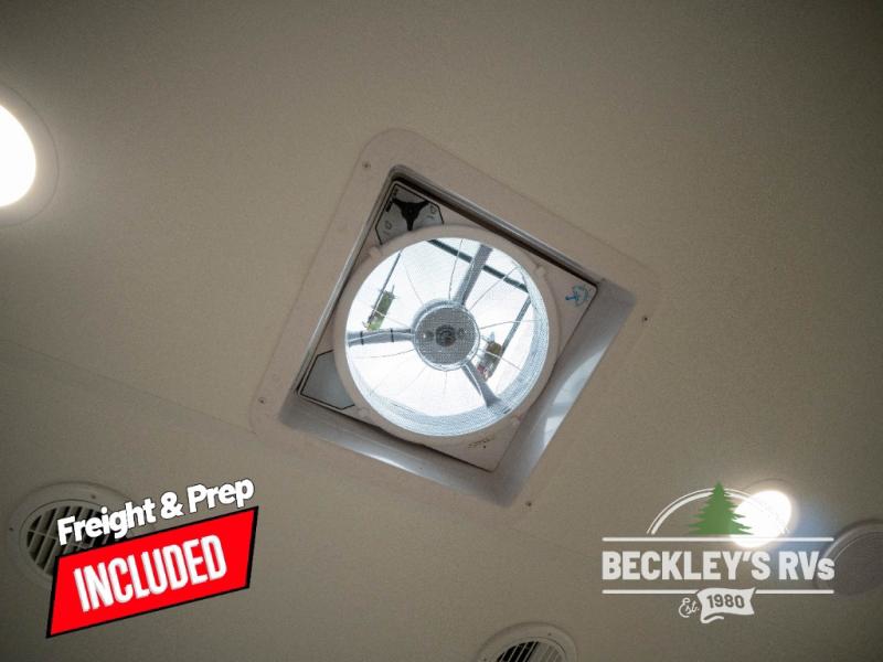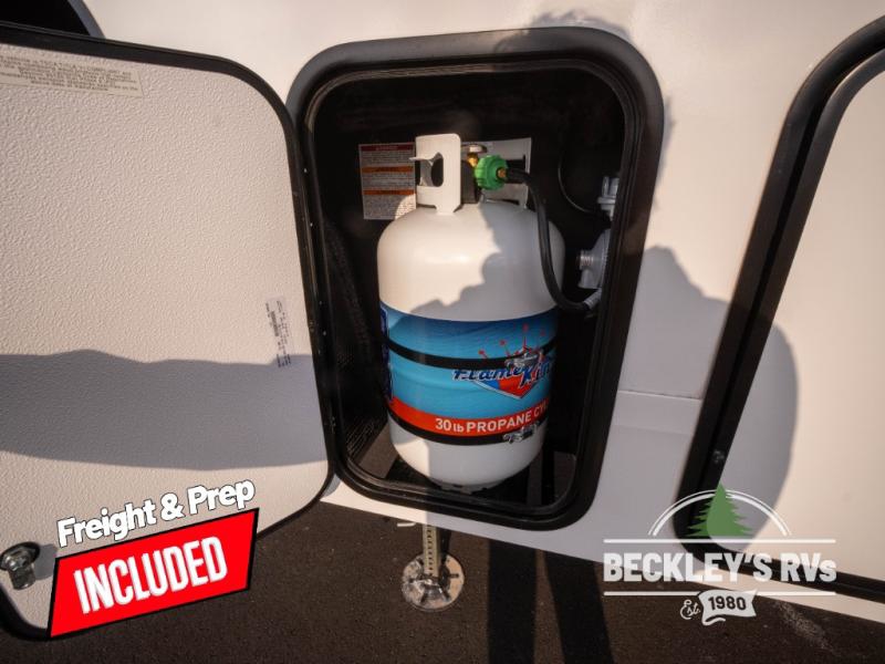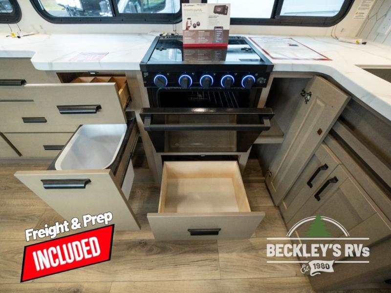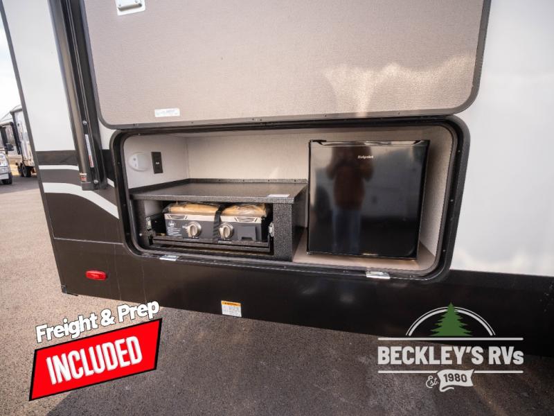 The whole family will enjoy camping in this fifth wheel! The kiddos will love having their own privacy with the rear private bunkhouse that has a 30" top bunk above a set of drawers, a 34" top bunk above a 48" lower bunk, and a TV prep area. You will enjoy having your own private retreat too with a front private bedroom that has a queen bed for a good night's rest and a wardrobe for your hang up clothes. You could even transform the U-shaped dinette and tri-fold sofa into extra sleeping spaces, and the dinette could be switched out for the optional 78" theater seating. The chef will have an easy time preparing their best dishes with the three-burner cooktop and flip-up countertop or they can breathe in some fresh air while they cook on the outside griddle and refrigerator for a cold beverage!