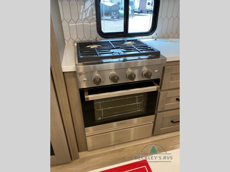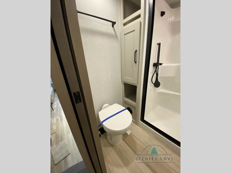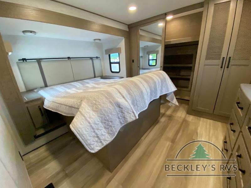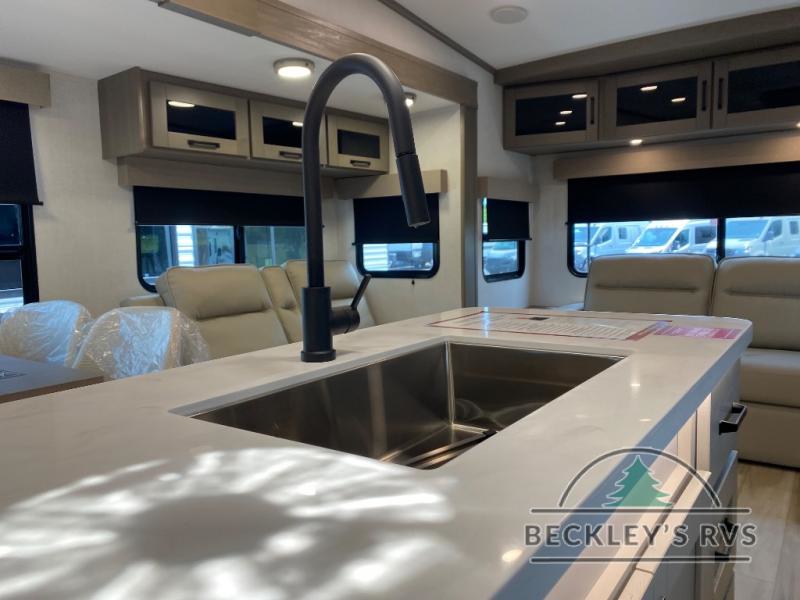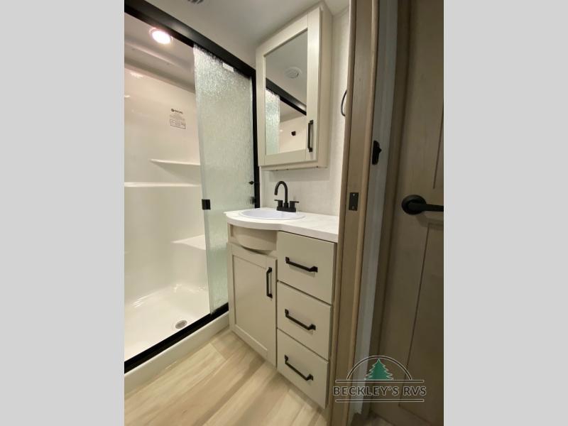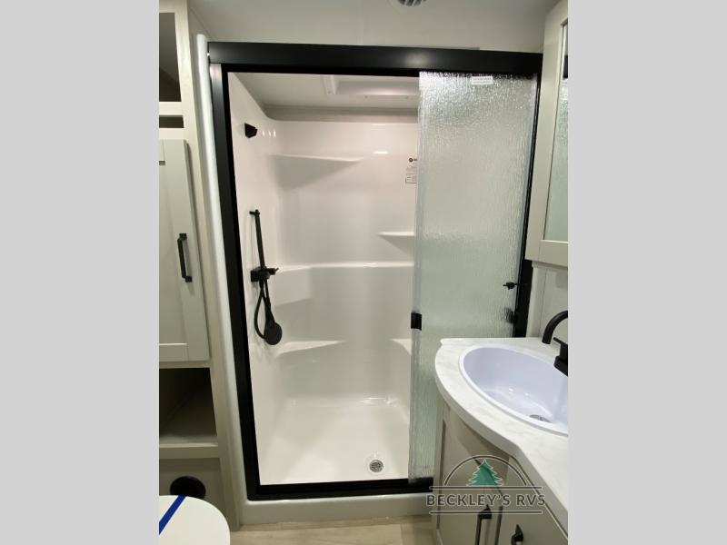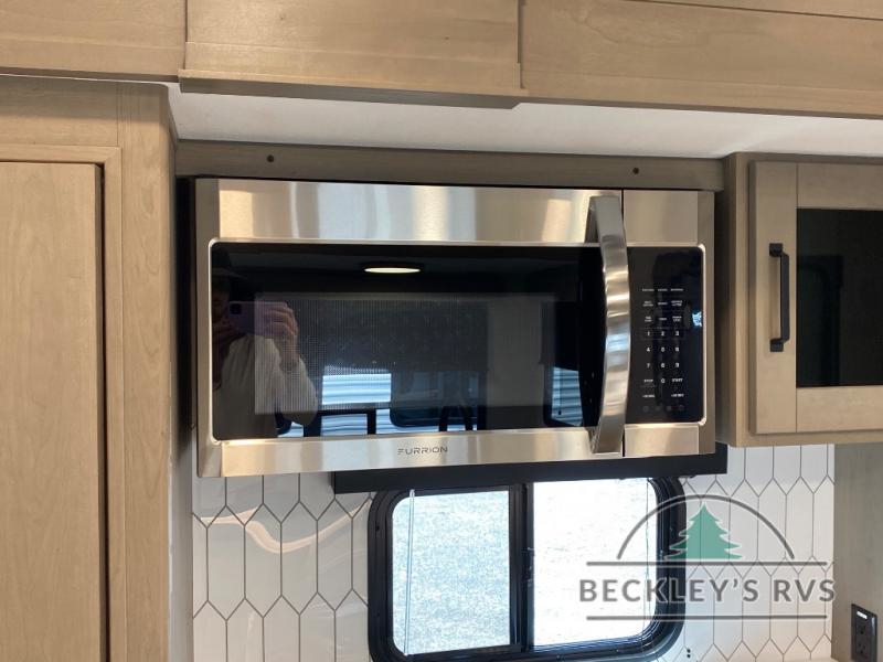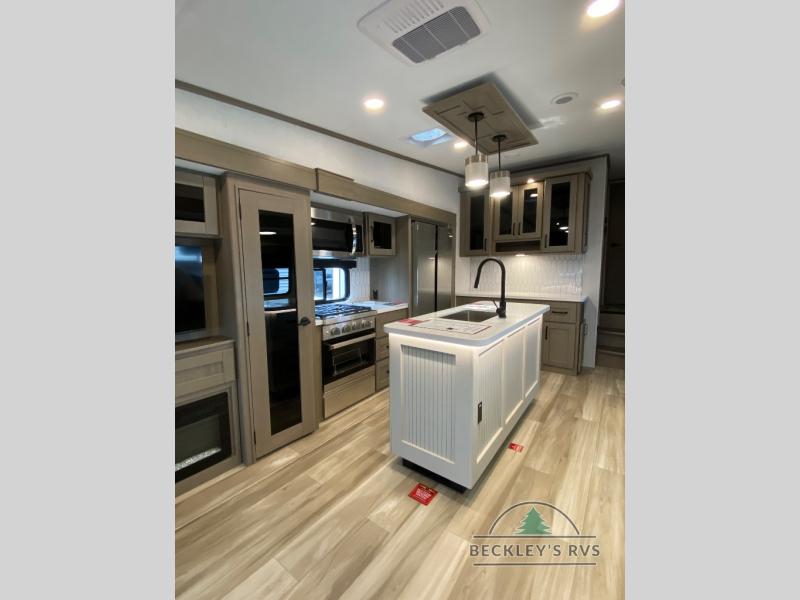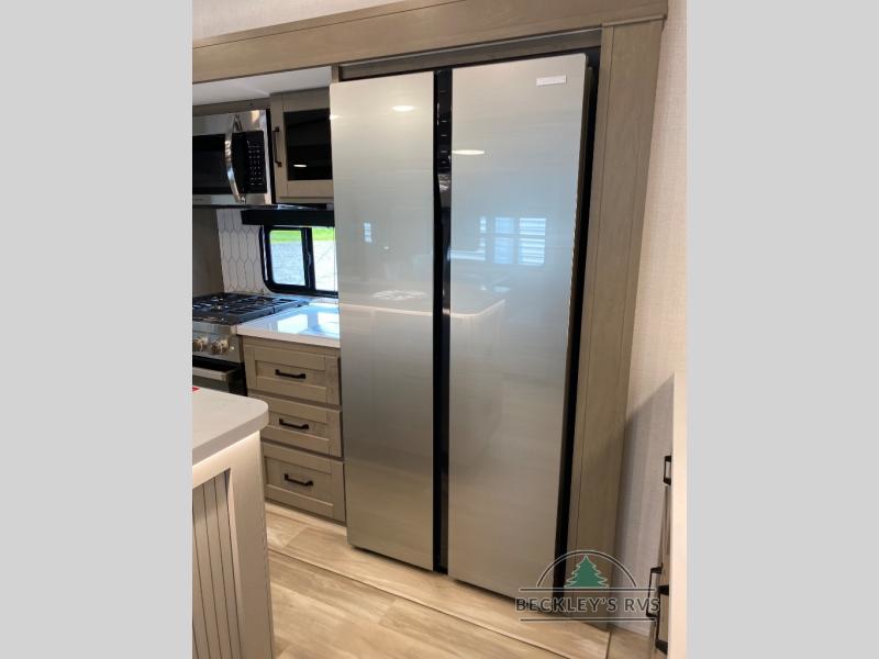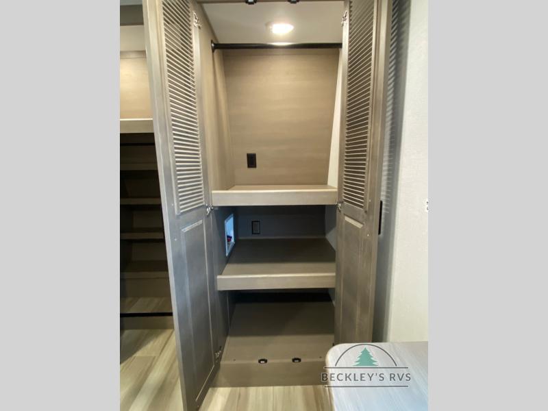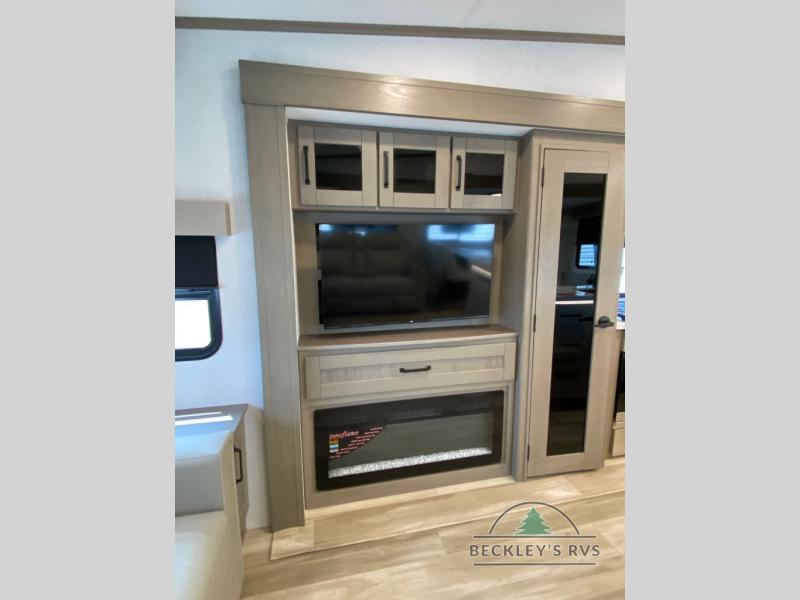 You can enjoy a spacious rear living area in this RV with dual opposing slides offering you entertainment, kitchen amenities, seating and windows for great views! The rear tri-fold sofa also converts into extra sleeping space for an extra guest or two, just like the booth dinette does. Yet you might like to add the swivel dinette option. There are theater seats to enjoy while you place your drinks in the cupholders and watch the entertainment center with a 40" LED HDTV and fireplace. The pantry is big enough to store your favorite snacks, and the kitchen island will make meal prepping easier, plus there is a 16 cu. ft. refrigerator to store any leftovers. The full bathroom has a 30" x 48" fiberglass shower and a linen closet to store your towels. The front private bedroom has a comfortable queen bed slide that can be switched out for the optional king bed, a dresser with overhead cabinets, and a full wall wardrobe that is prepped to add the optional washer and dryer so that you can extend your camping trip with clean clothes!