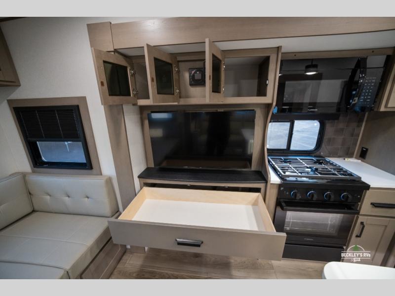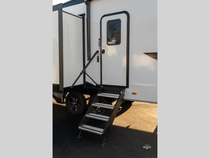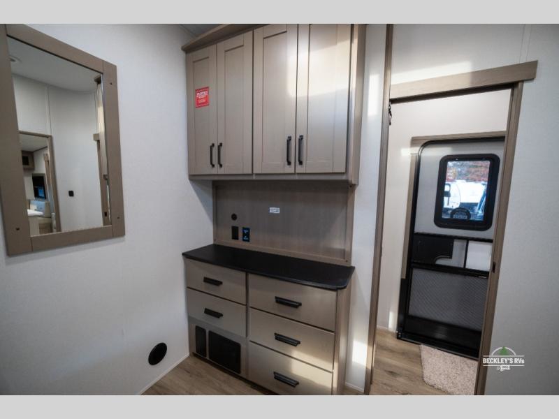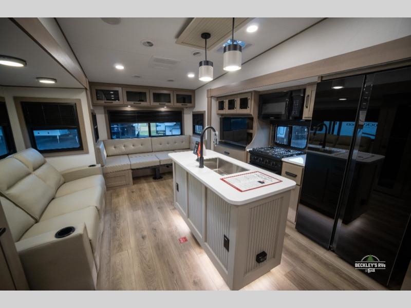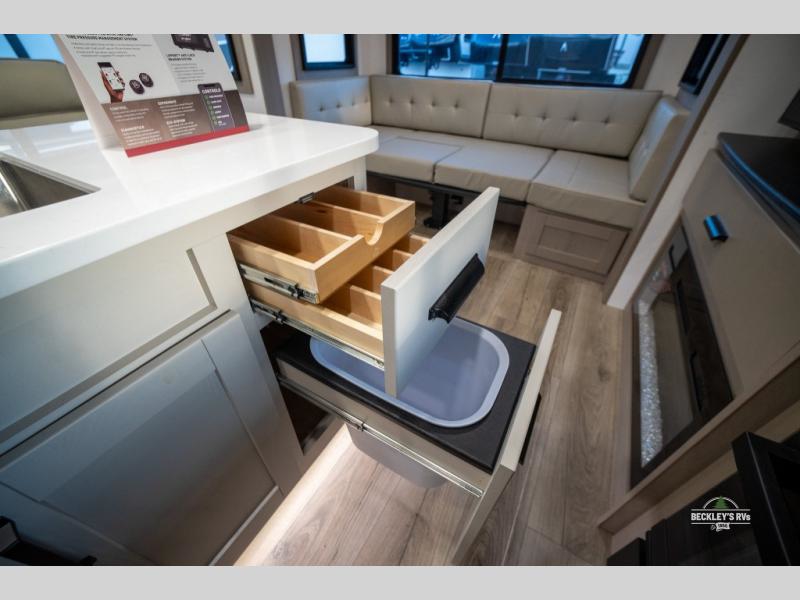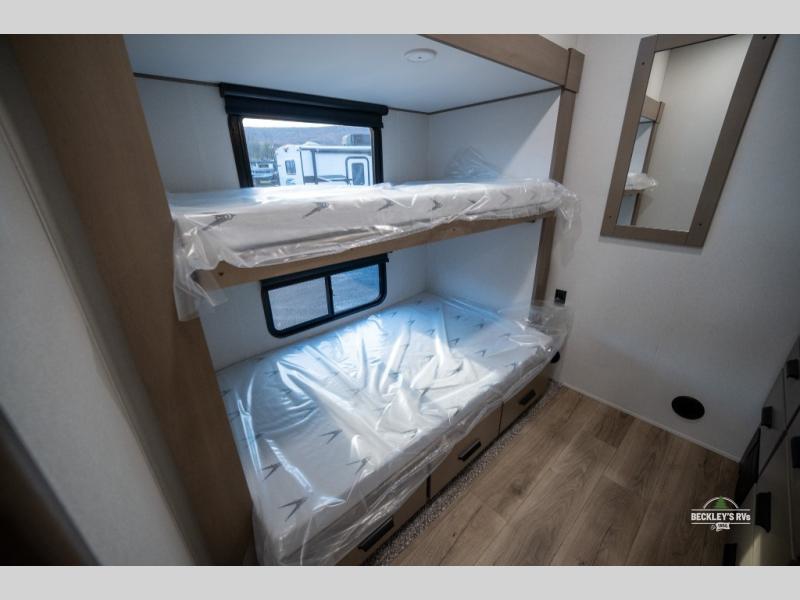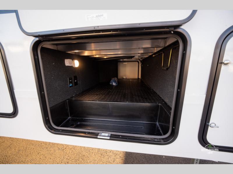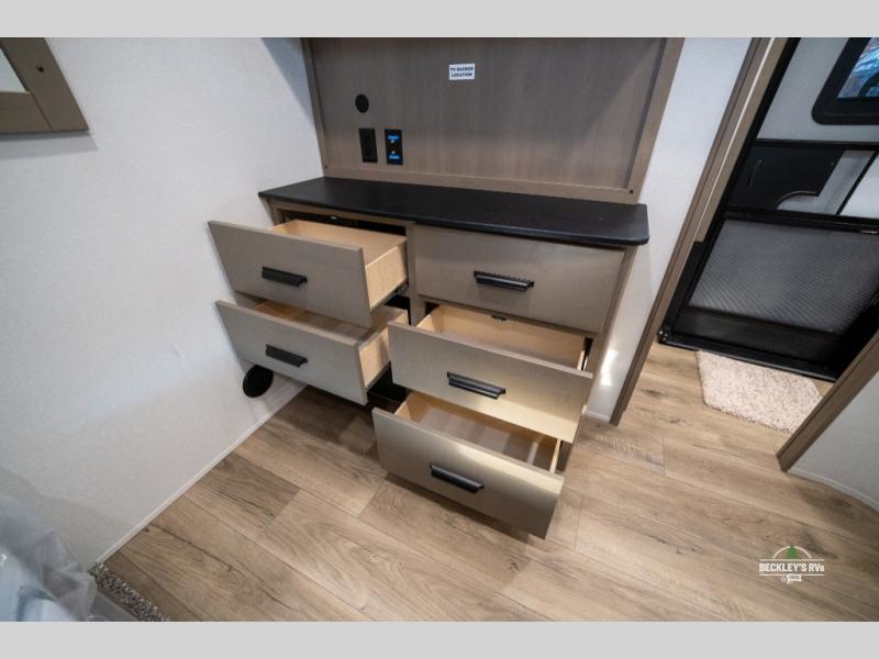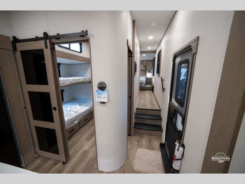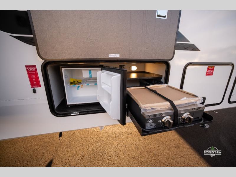 When you are looking for a versatile extra room for either a second bedroom or living area as well as an office, this middle bunkhouse might just work! There is a slide out with two bunks and drawers plus a dresser. You can sleep like a queen on the walk-around bed in the front private bedroom that offers more clothing storage and windows for views. The rear main living and kitchen area provides plenty of seating on the a 78" triple person theater seats, and on the 92" U-shaped lounge with table with windows within the slide for natural lighting and great views. The kitchen island gives the cook more space to make and serve meals, and the gourmet kitchen includes a 16 cu. ft. refrigerator, plus a pantry for dry goods. There is an exterior outside kitchen with a griddle and a 1.6 cu. ft. refrigerator for beverages and such, plus you will find an LP quick connect, Coax TV hookup, and a spray port to wash off your dirty shoes.