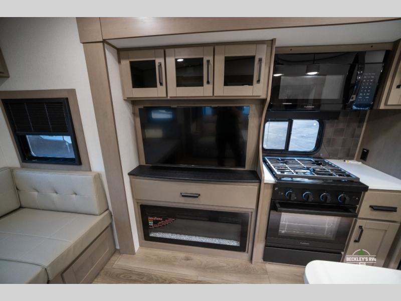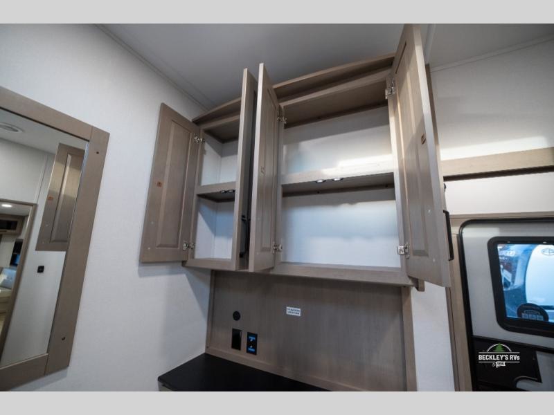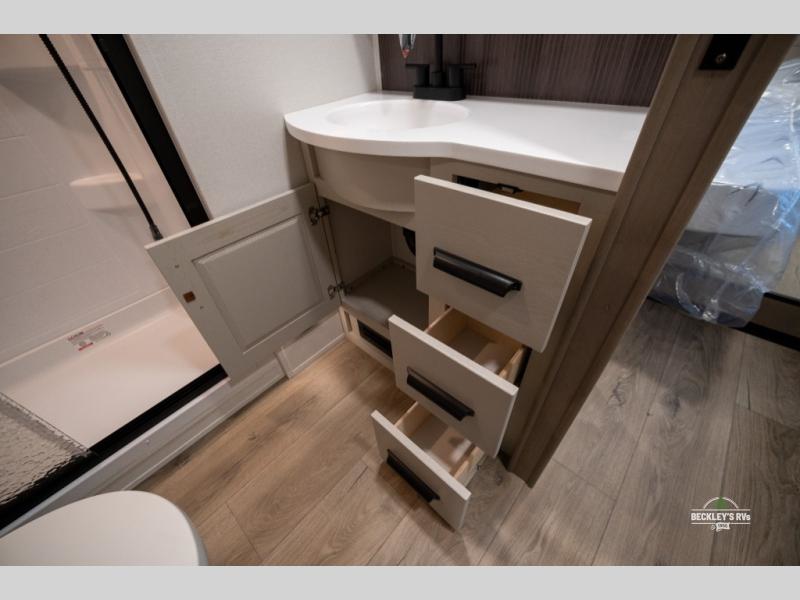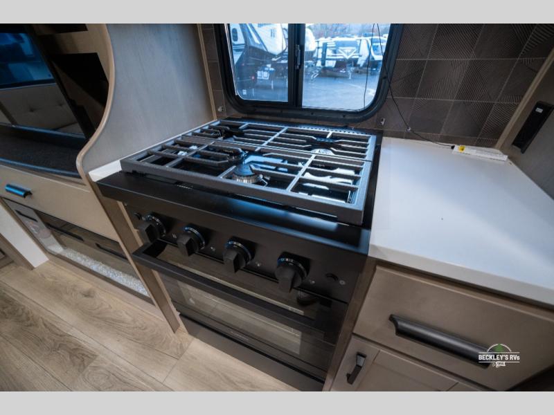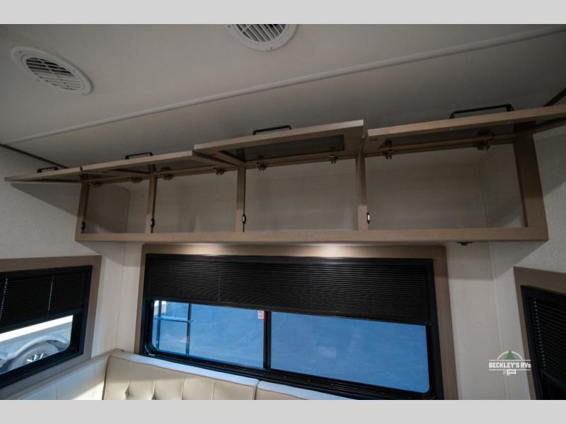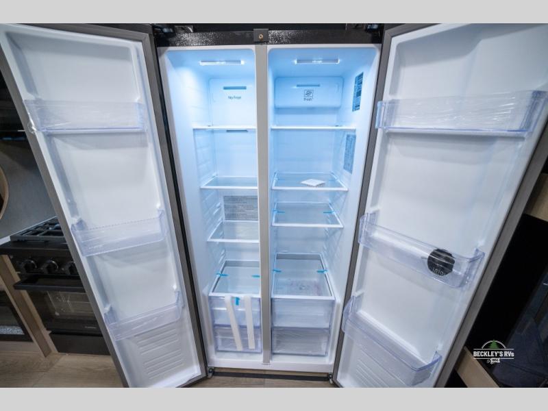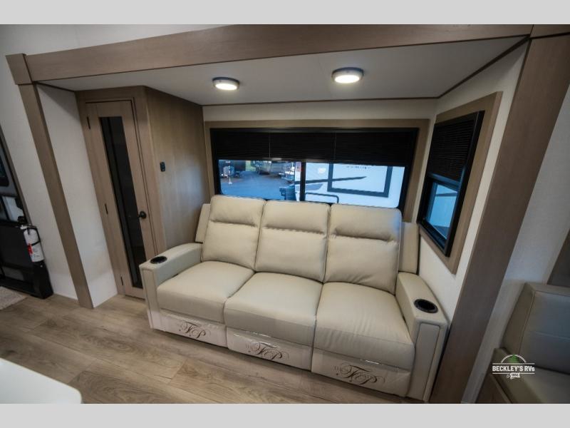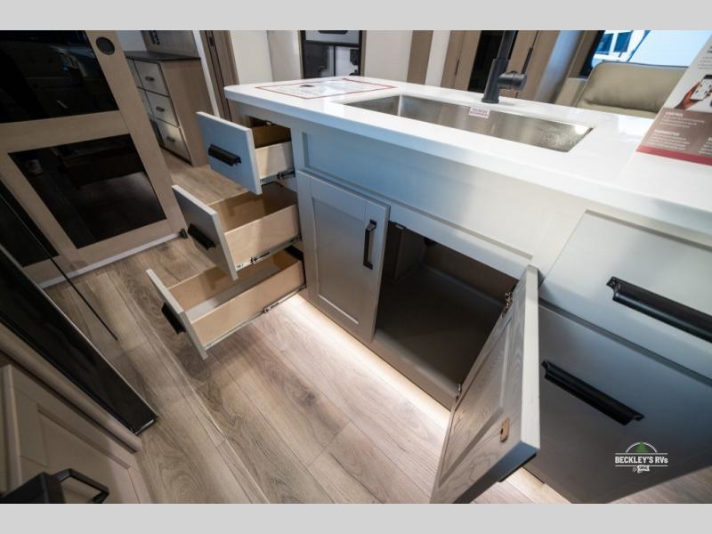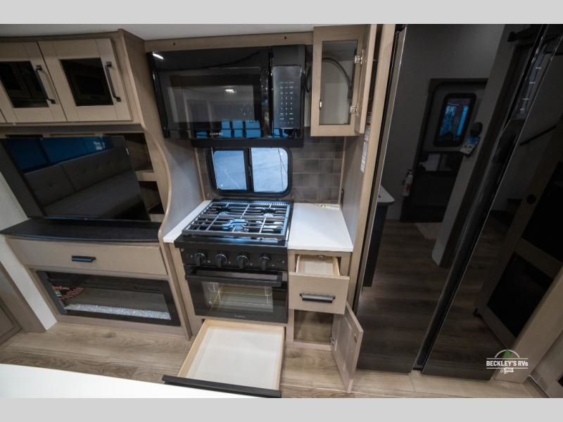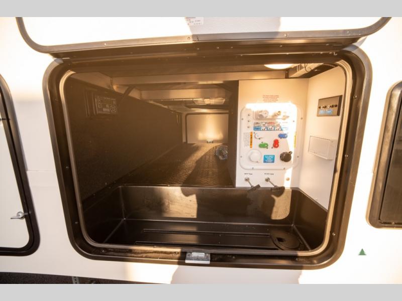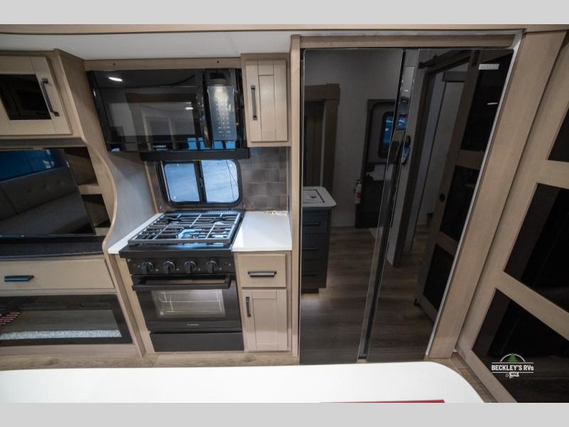 When you are looking for a versatile extra room for either a second bedroom or living area as well as an office, this middle bunkhouse might just work! There is a slide out with two bunks and drawers plus a dresser. You can sleep like a queen on the walk-around bed in the front private bedroom that offers more clothing storage and windows for views. The rear main living and kitchen area provides plenty of seating on the a 78" triple person theater seats, and on the 92" U-shaped lounge with table with windows within the slide for natural lighting and great views. The kitchen island gives the cook more space to make and serve meals, and the gourmet kitchen includes a 16 cu. ft. refrigerator, plus a pantry for dry goods. There is an exterior outside kitchen with a griddle and a 1.6 cu. ft. refrigerator for beverages and such, plus you will find an LP quick connect, Coax TV hookup, and a spray port to wash off your dirty shoes.