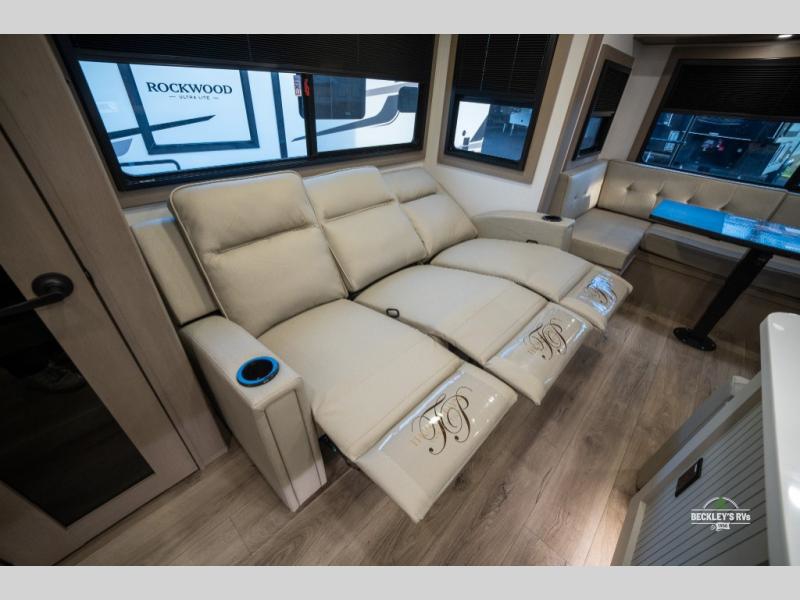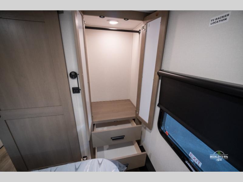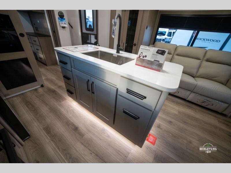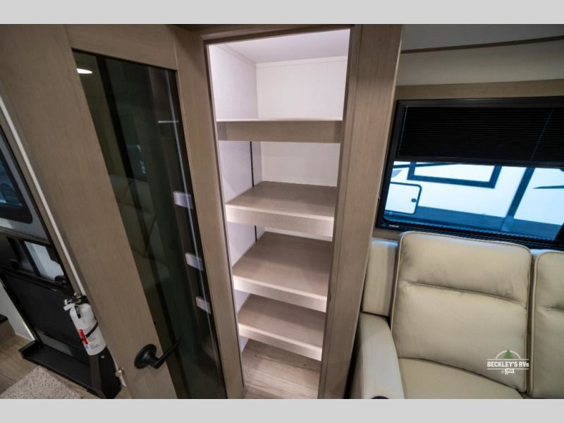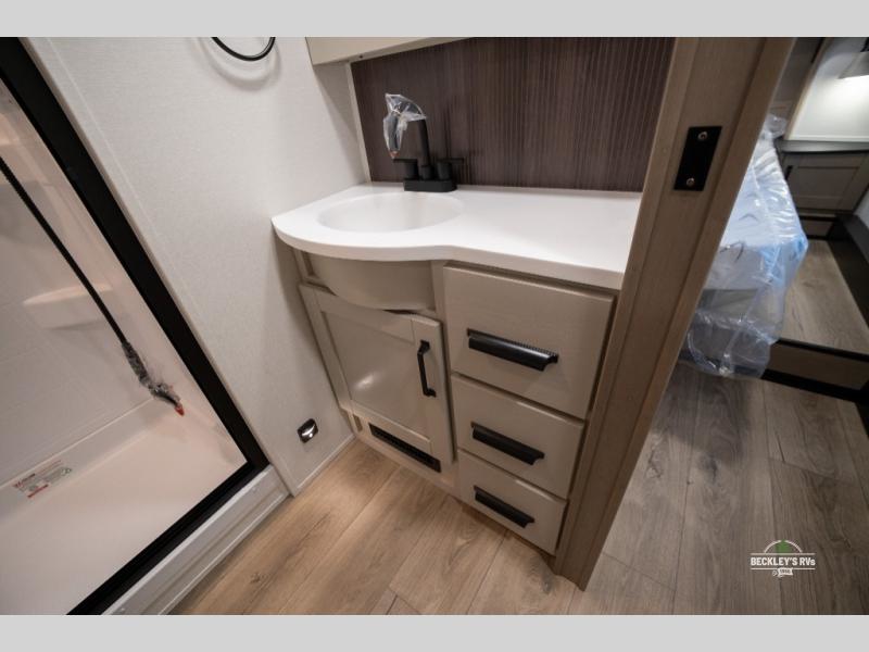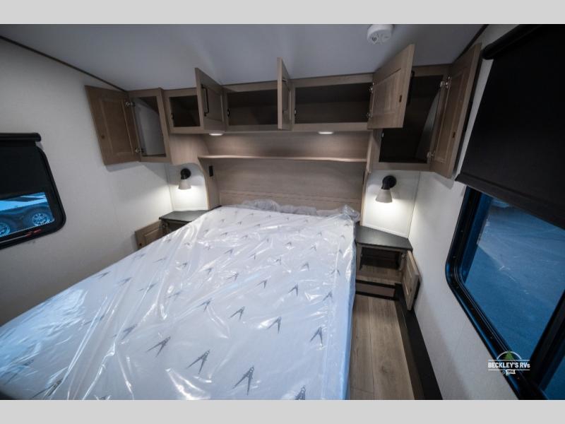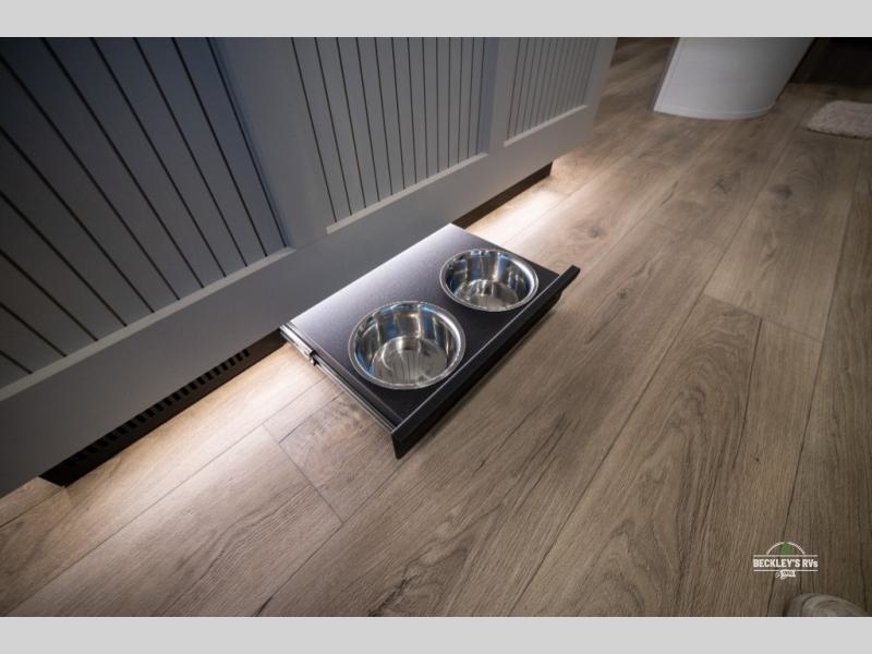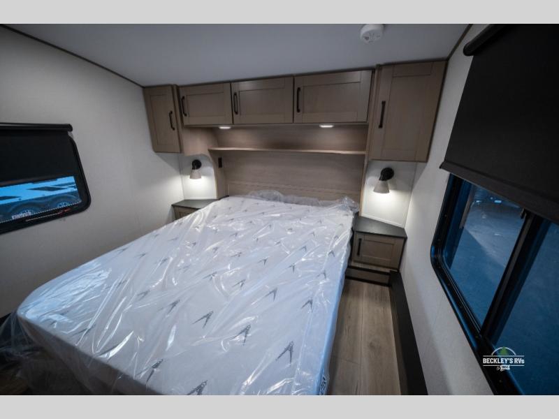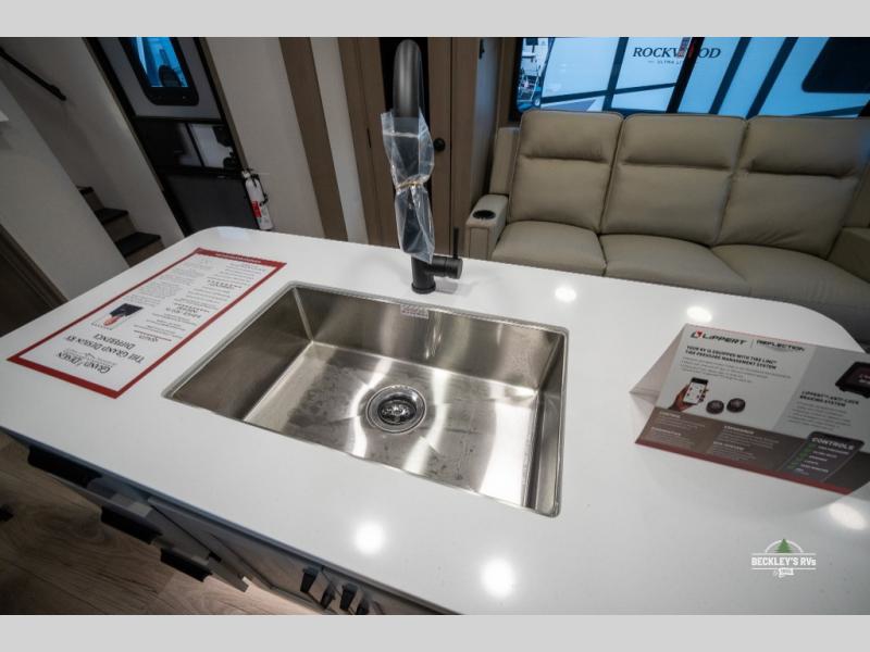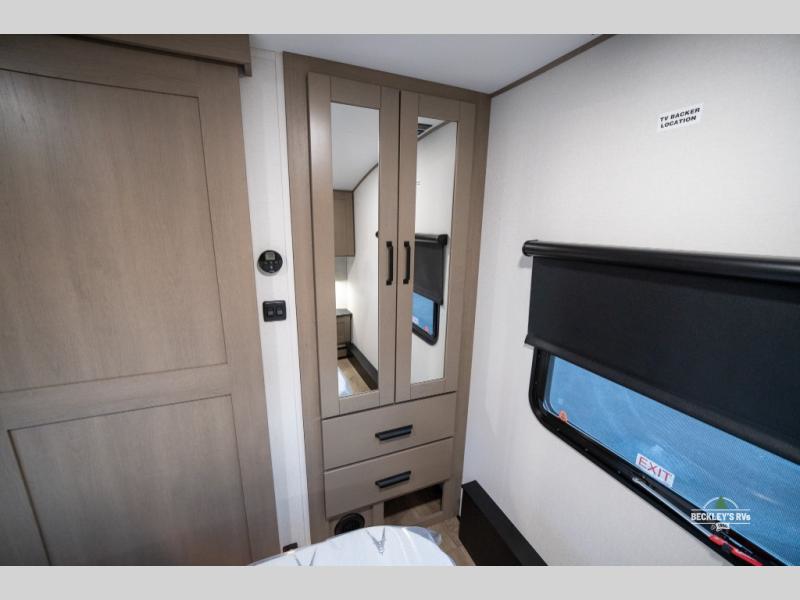 When you are looking for a versatile extra room for either a second bedroom or living area as well as an office, this middle bunkhouse might just work! There is a slide out with two bunks and drawers plus a dresser. You can sleep like a queen on the walk-around bed in the front private bedroom that offers more clothing storage and windows for views. The rear main living and kitchen area provides plenty of seating on the a 78" triple person theater seats, and on the 92" U-shaped lounge with table with windows within the slide for natural lighting and great views. The kitchen island gives the cook more space to make and serve meals, and the gourmet kitchen includes a 16 cu. ft. refrigerator, plus a pantry for dry goods. There is an exterior outside kitchen with a griddle and a 1.6 cu. ft. refrigerator for beverages and such, plus you will find an LP quick connect, Coax TV hookup, and a spray port to wash off your dirty shoes.