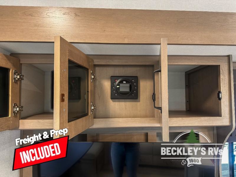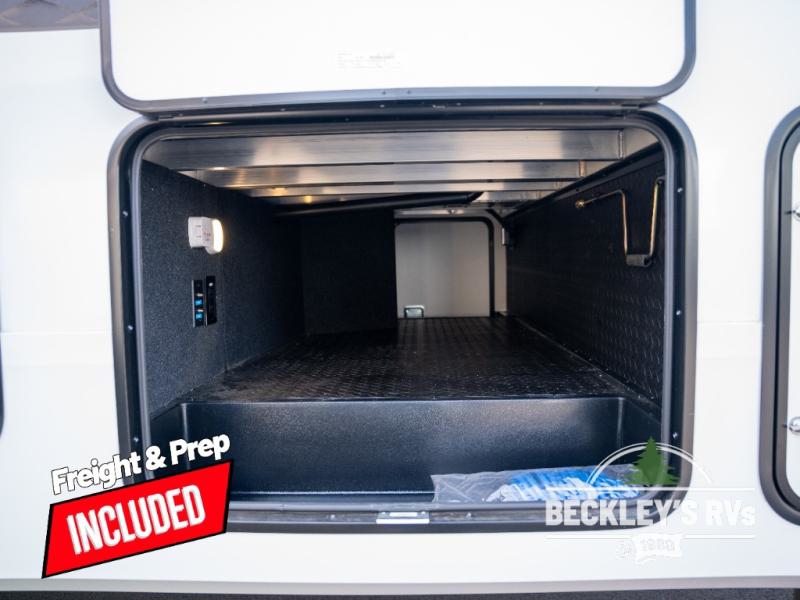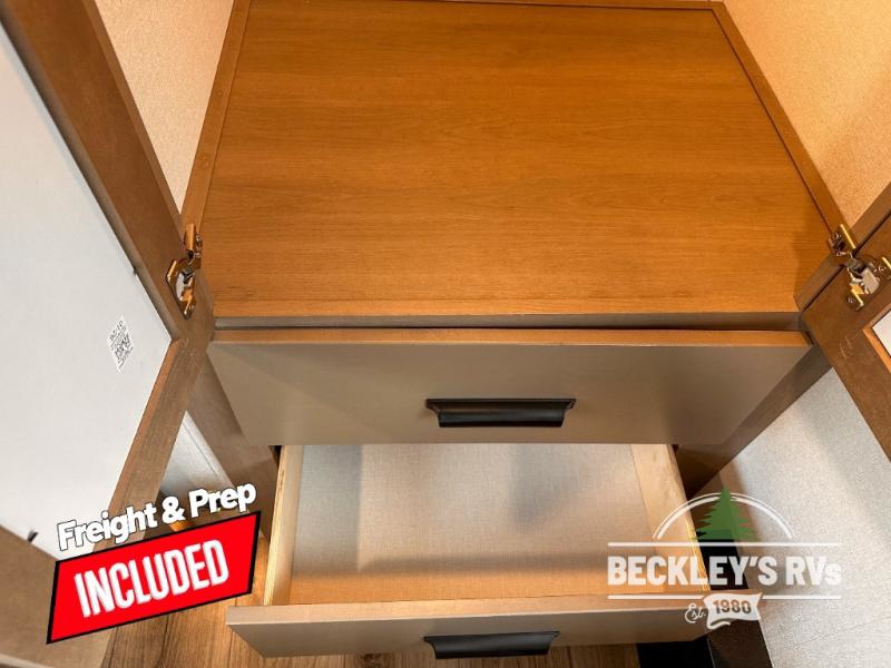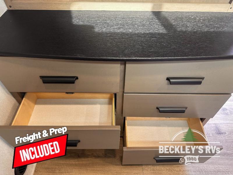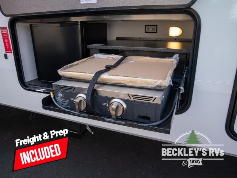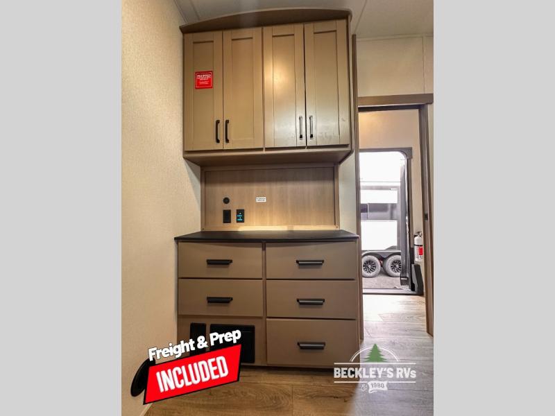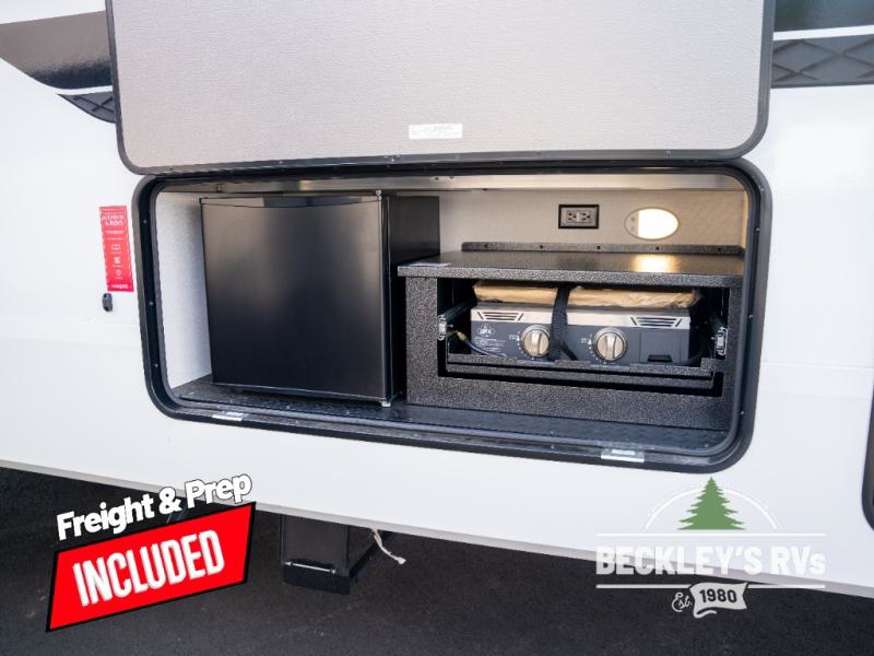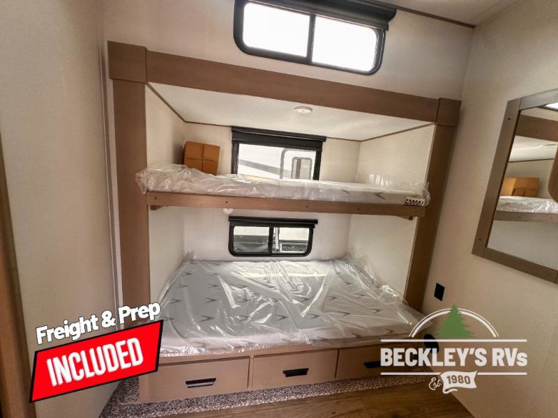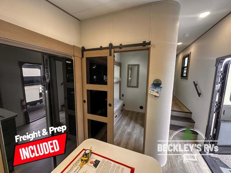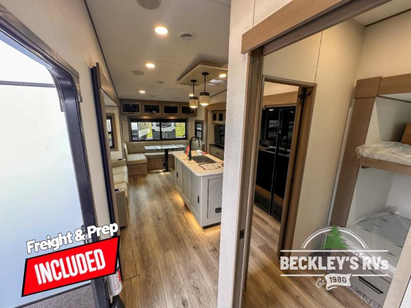 When you are looking for a versatile extra room for either a second bedroom or living area as well as an office, this middle bunkhouse might just work! There is a slide out with two bunks and drawers plus a dresser. You can sleep like royalty on the walk-around queen bed in the front private bedroom that offers more clothing storage and windows for views. The rear main living and kitchen area provides plenty of seating on the 78" theater seats, and on the 92" U-shaped lounge. The kitchen island gives the cook more space to make and serve meals, and the gourmet kitchen includes a 16-cu. ft. refrigerator, plus a pantry for dry goods. There is an exterior outside kitchen with a griddle and a 1.6 cu. ft. refrigerator for beverages and such, plus you will find an LP quick connect, Coax TV hookup, and a spray port to wash off your dirty shoes.