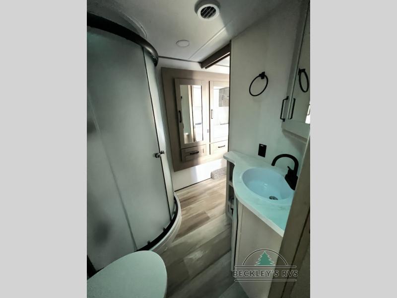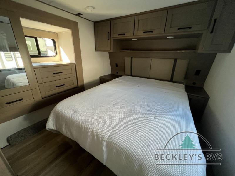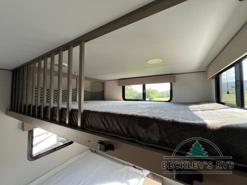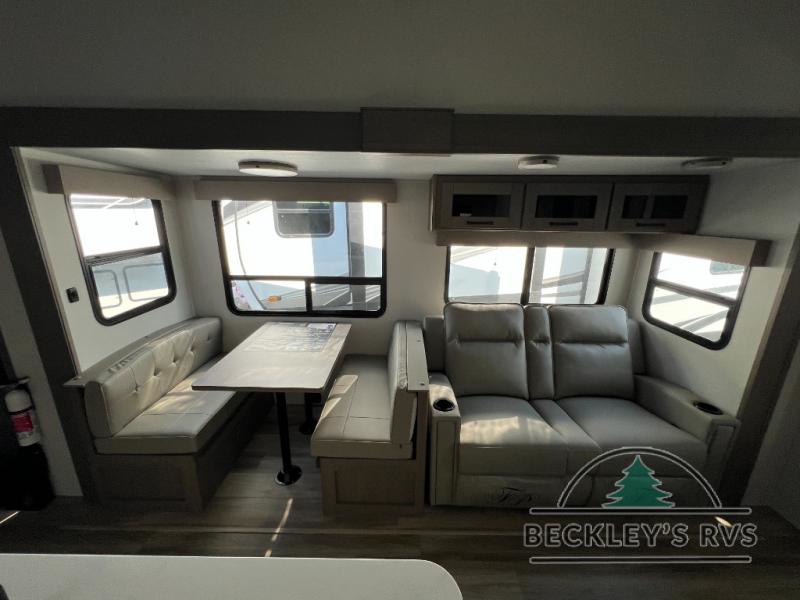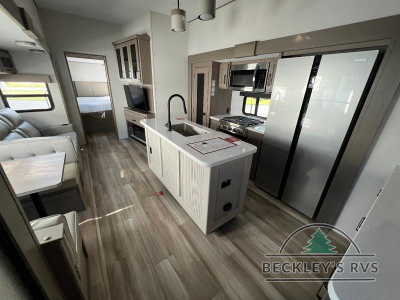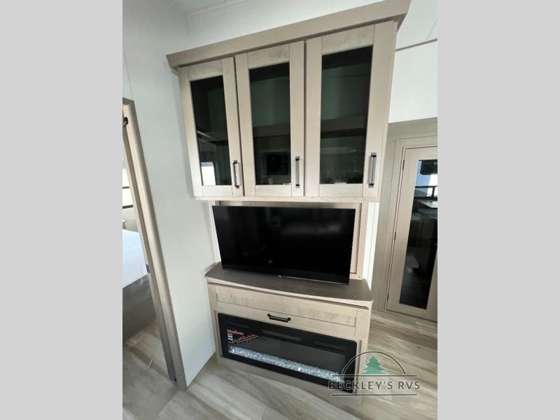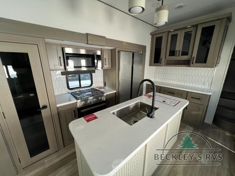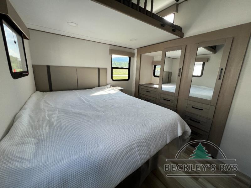 There is a whole lot to love about this fifth wheel! The front private bedroom has a queen bed to lay your head on at night, a slide with drawers and a linen closet, and even an entrance into the dual entry bathroom. The second private bedroom has a 54" x 74" top bed above a queen bed, a slide with a closet and drawers, and its very own half bathroom. The chef will have an easy time preparing delicious home cooked meals with the kitchen island, plus there is an outside kitchen complete with a 4.1 cu. ft. refrigerator to enjoy a cold beverage while you grill on the griddle. Enjoy a relaxing evening indoors either playing games at the booth dinette or on the theater seating across from the entertainment center with a fireplace and 40" TV. You could even switch out the seating for an optional tri-fold sofa or the dinette for an optional swivel dinette!