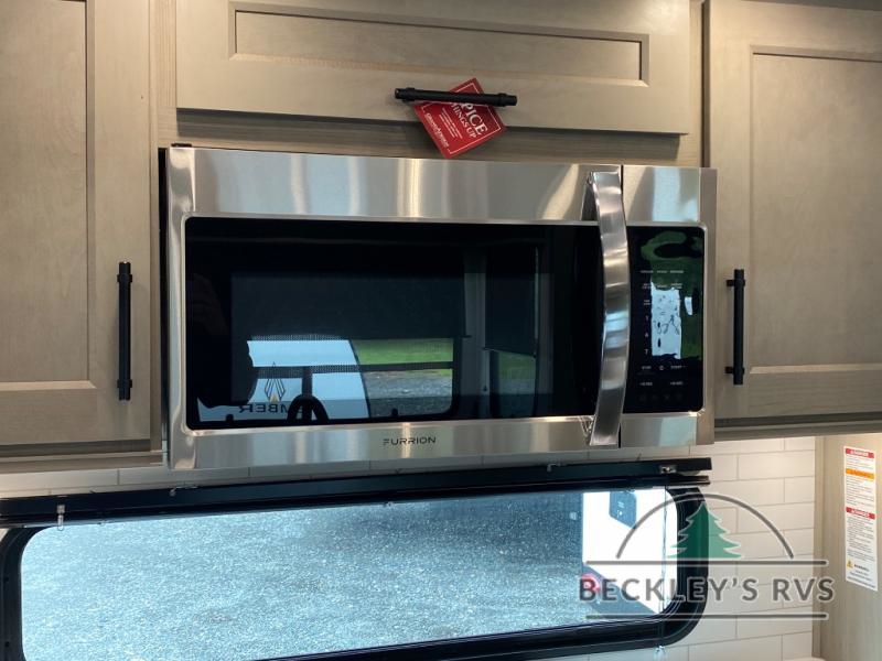 A perfect fifth wheel featuring triple slides and a tri-fold sofa for overnight guests! You will love the spacious interior thanks to the dual opposing slides in the main living and kitchen area. Here you will find a kitchen island in the center and plenty of seating with a free standing dinette, theater seating for movie night opposite the fireplace and entertainment center, as well as a tri-fold sofa. The kitchen offers all of the amenities just like home, a 16 cu. ft. 12-volt refrigerator for your perishables, and a hutch with an electronics drawer to keep your gadgets organized. There is even a pet dish under the refrigerator for your furry friends. The spacious full bath includes a 48" x 30" shower, dual linen closets, and an accessory drawer for necessities. You'll love the front bedroom with its queen bed slide out, slide top dresser, front wardrobe with washer and dryer prep, plus a pass-thru clothes hamper between the bedroom and bath; how convenient!
