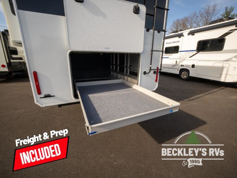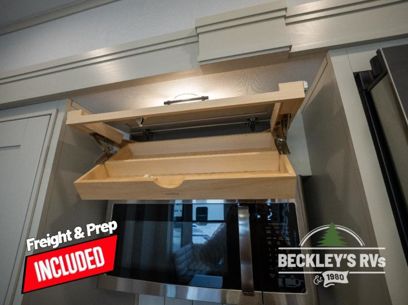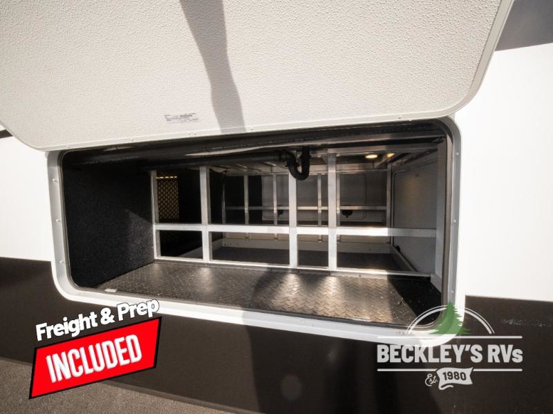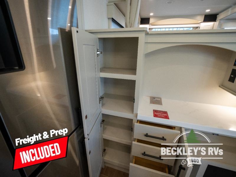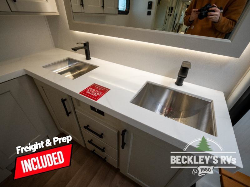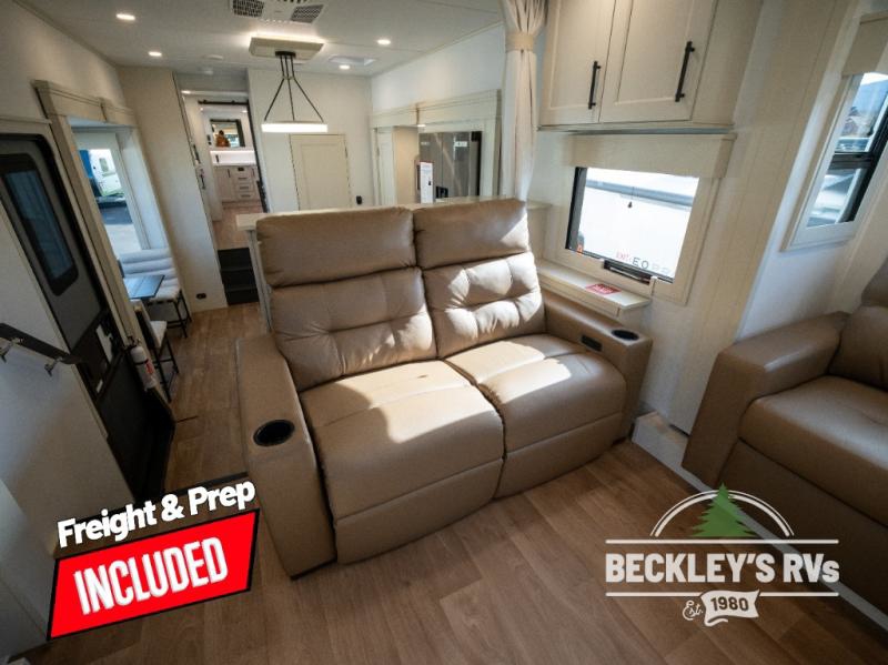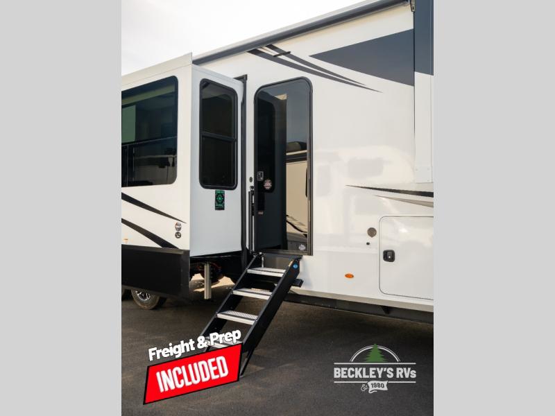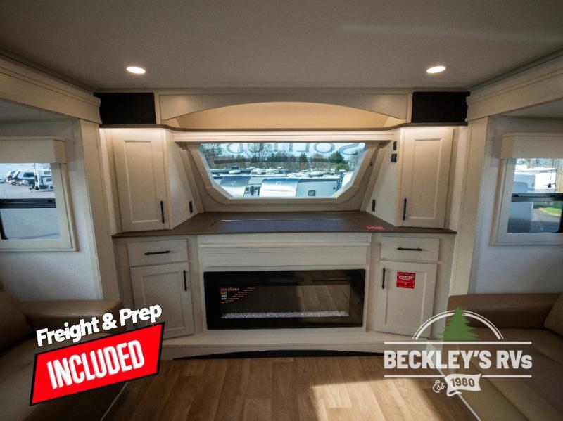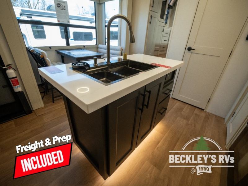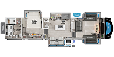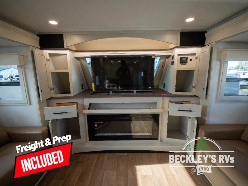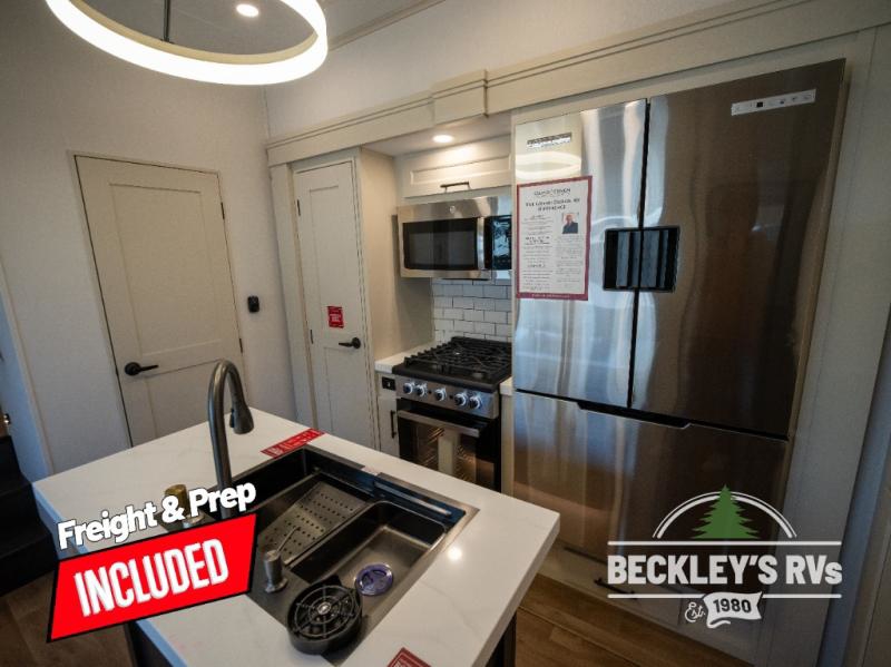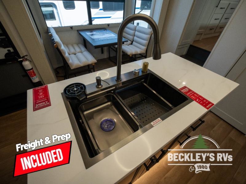 Five slide outs, a full bathroom with dual sinks, a half bath off of the kitchen, and a separate front living room and entertainment area are a few reasons you will enjoy your time spent in this fifth wheel! The separate kitchen is a dream with stainless steel appliances including a built-in oven, a pantry and hutch with counter space, a kitchen island plus a free-standing dinette slide with windows for great views. The entertainment center offers an LED Smart TV with a fireplace below and storage, and the dual opposing tri-fold sofas provide added sleeping space at night. The master bedroom includes a queen bed plus space savings sliding doors that lead you to the rear full bathroom with dual sinks, linen storage, and washer/dryer prep. The exterior has several storage choices as well including a pass-through storage compartment for fishing poles and such, plus the unique sliding tray in the rear allows you to bring along larger items such as camping tables, portable grills, golf clubs, totes and more.