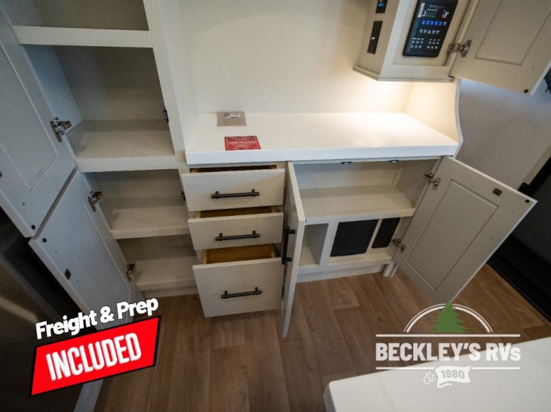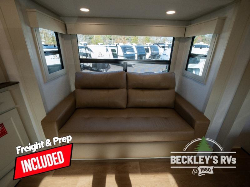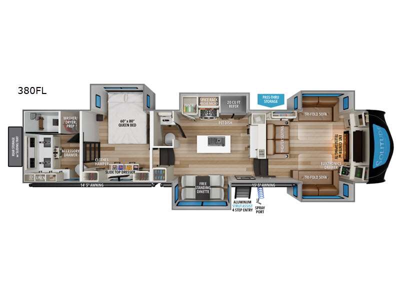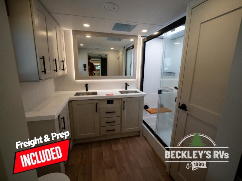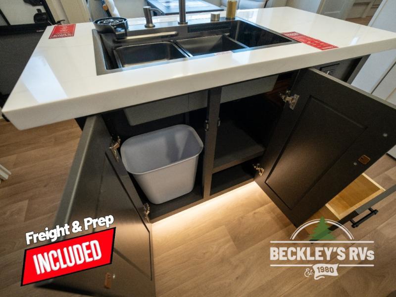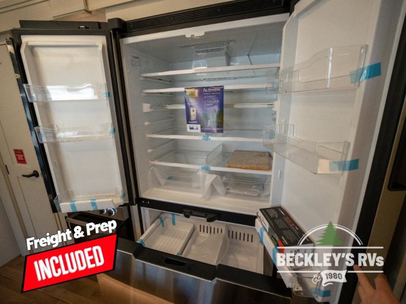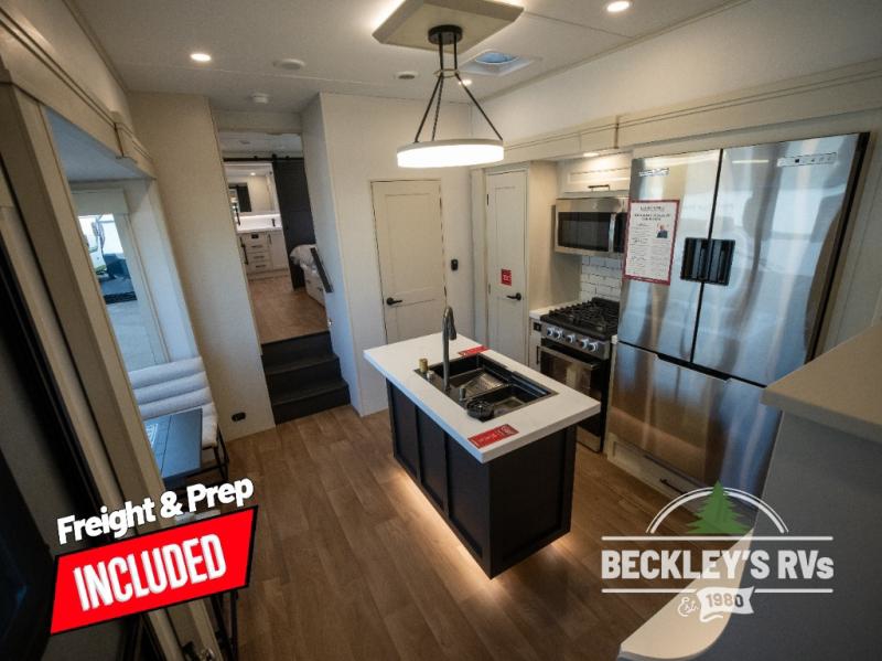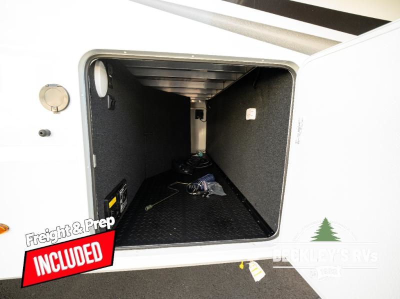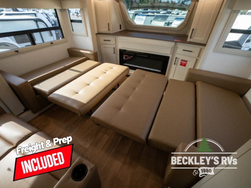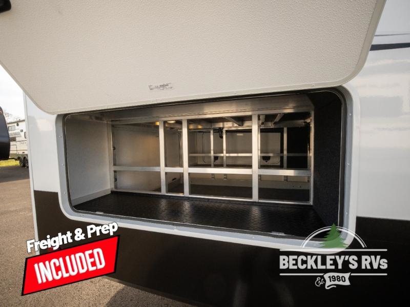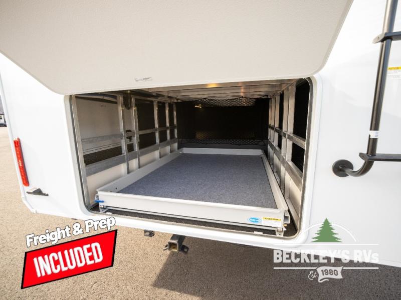 Five slide outs, a full bathroom with dual sinks, a half bath off of the kitchen, and a separate front living room and entertainment area are a few reasons you will enjoy your time spent in this fifth wheel! The separate kitchen is a dream with stainless steel appliances including a built-in oven, a pantry and hutch with counter space, a kitchen island plus a free-standing dinette slide with windows for great views. The entertainment center offers an LED Smart TV with a fireplace below and storage, and the dual opposing tri-fold sofas provide added sleeping space at night. The master bedroom includes a queen bed plus space savings sliding doors that lead you to the rear full bathroom with dual sinks, linen storage, and washer/dryer prep. The exterior has several storage choices as well including a pass-through storage compartment for fishing poles and such, plus the unique sliding tray in the rear allows you to bring along larger items such as camping tables, portable grills, golf clubs, totes and more.