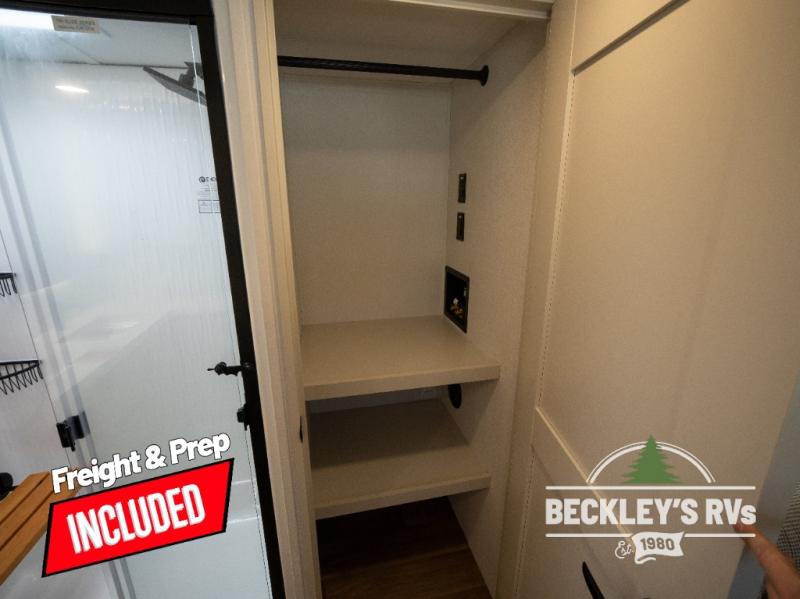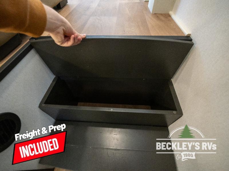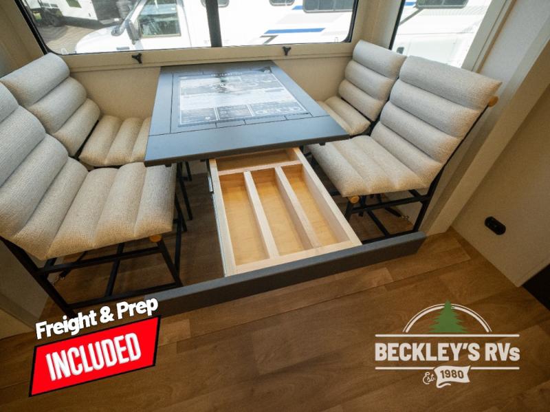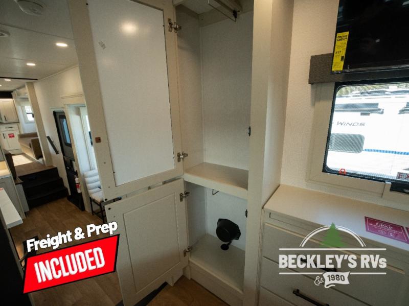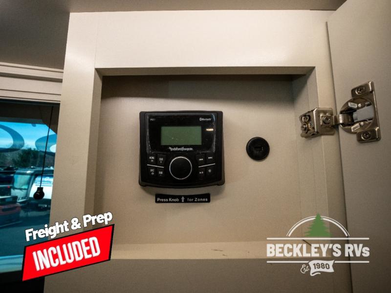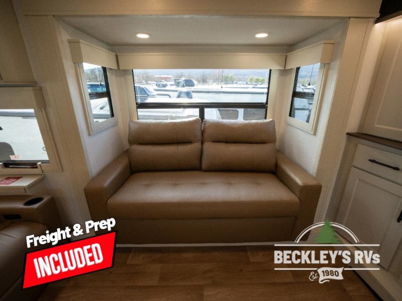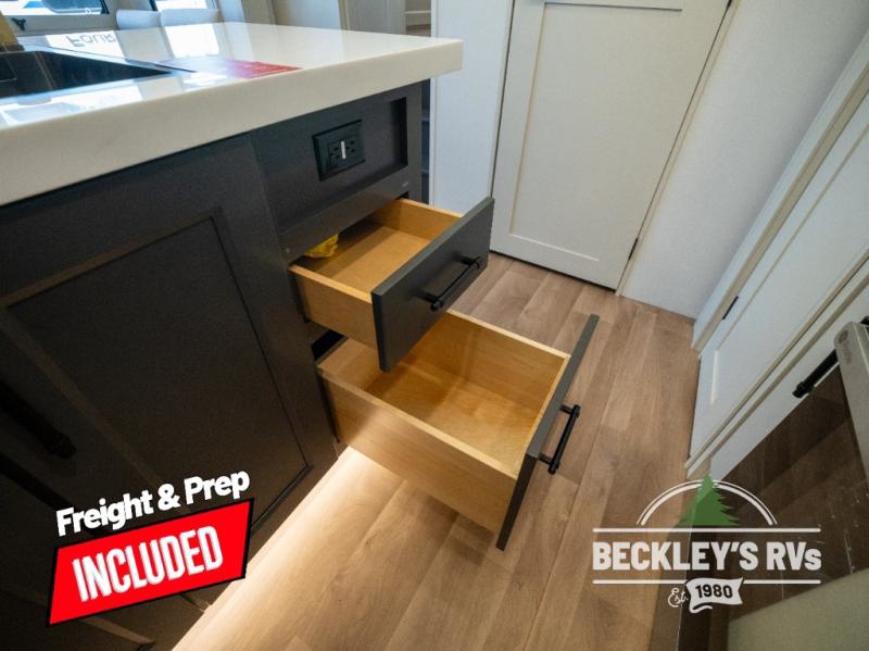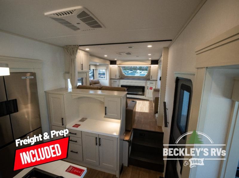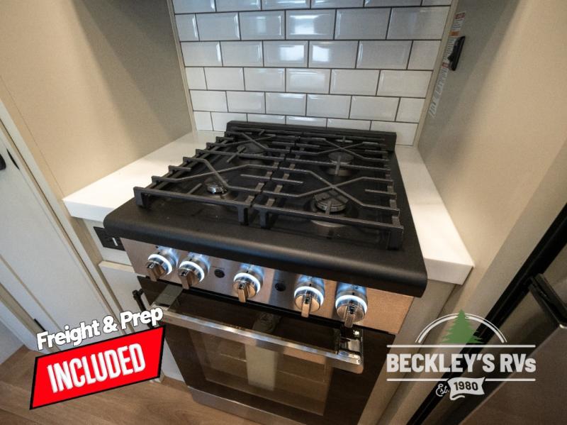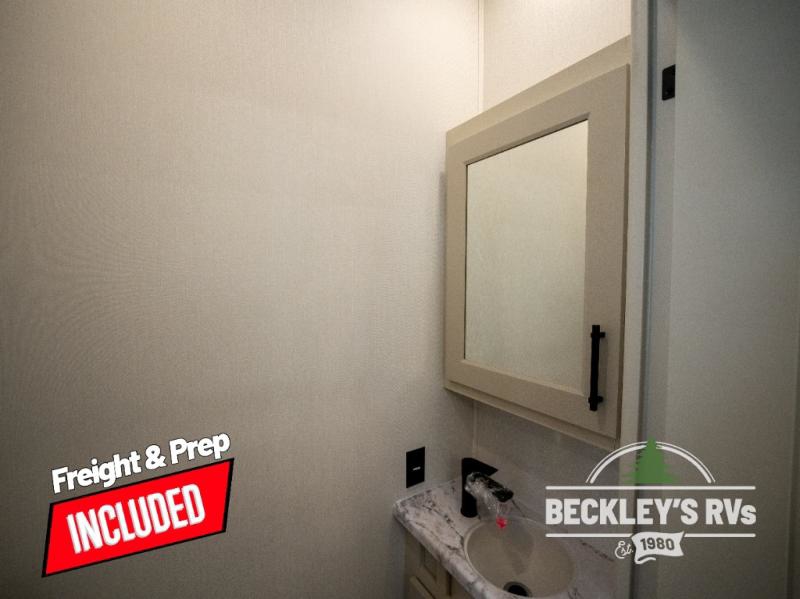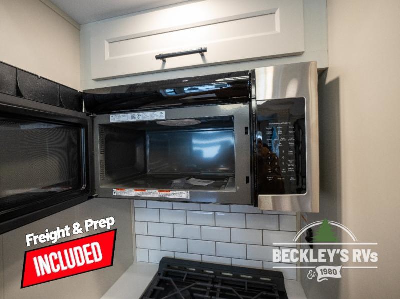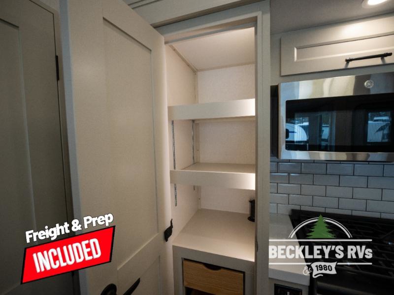Five slide outs, a full bathroom with dual sinks, a half bath off of the kitchen, and a separate front living room and entertainment area are a few reasons you will enjoy your time spent in this fifth wheel! The separate kitchen is a dream with stainless steel appliances including a built-in oven, a pantry and hutch with counter space, a kitchen island plus a free-standing dinette slide with windows for great views. The entertainment center offers an LED Smart TV with a fireplace below and storage, and the dual opposing tri-fold sofas provide added sleeping space at night. The master bedroom includes a queen bed plus space savings sliding doors that lead you to the rear full bathroom with dual sinks, linen storage, and washer/dryer prep. The exterior has several storage choices as well including a pass-through storage compartment for fishing poles and such, plus the unique sliding tray in the rear allows you to bring along larger items such as camping tables, portable grills, golf clubs, totes and more.