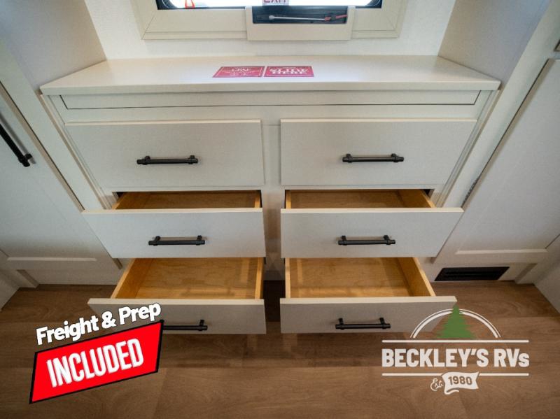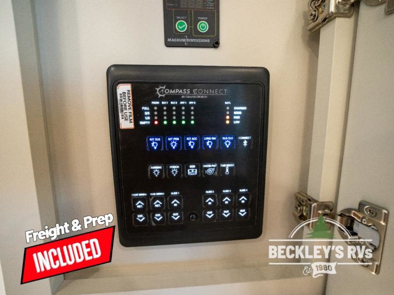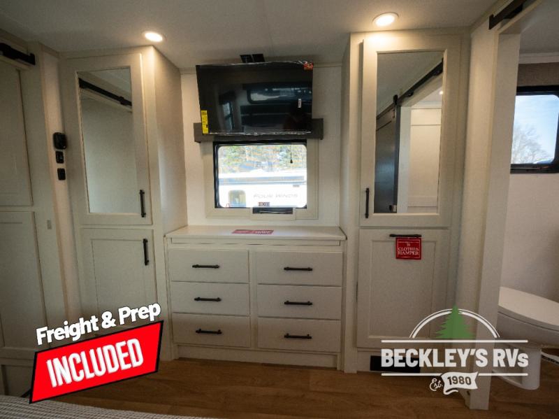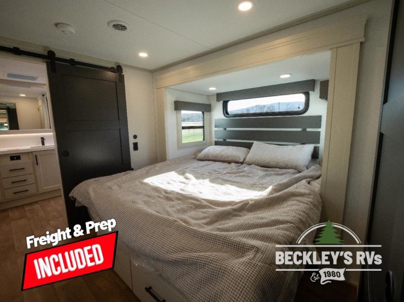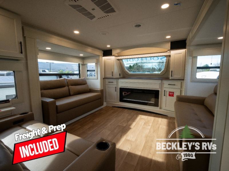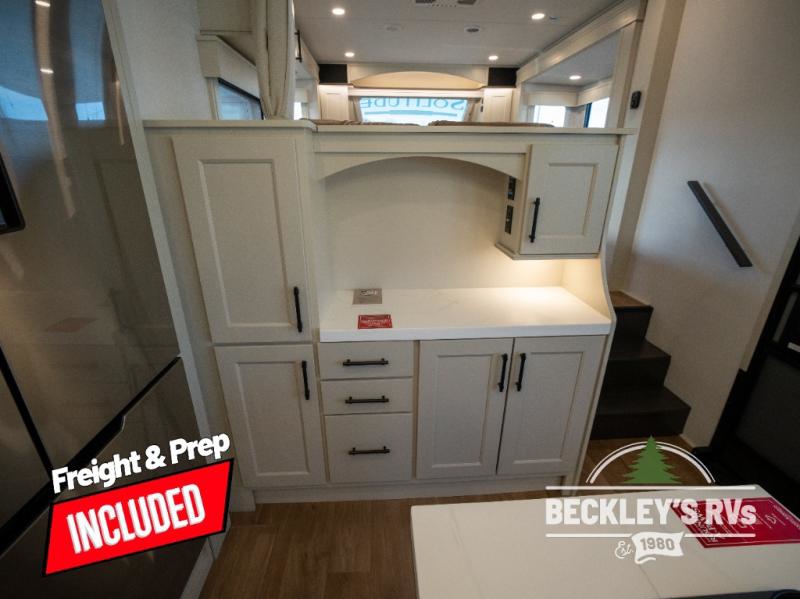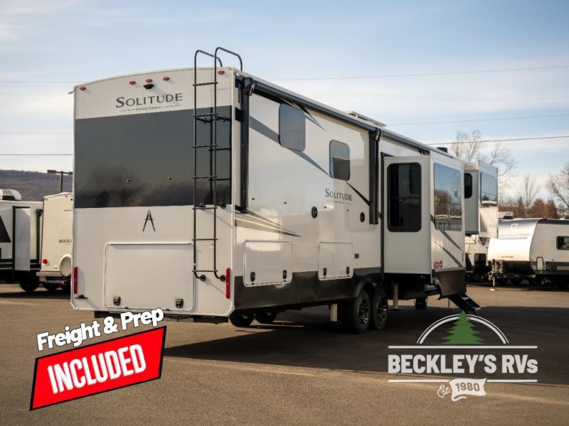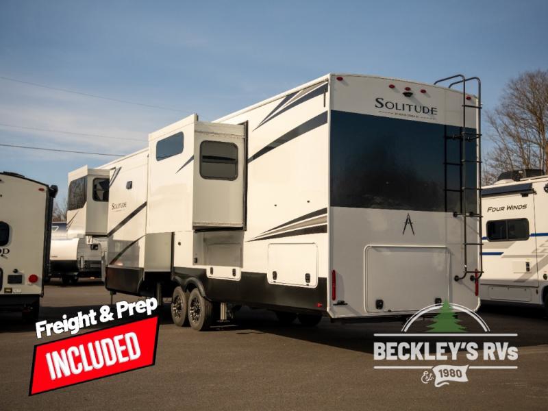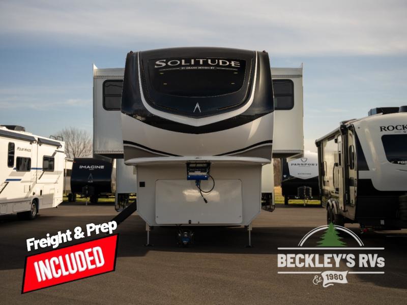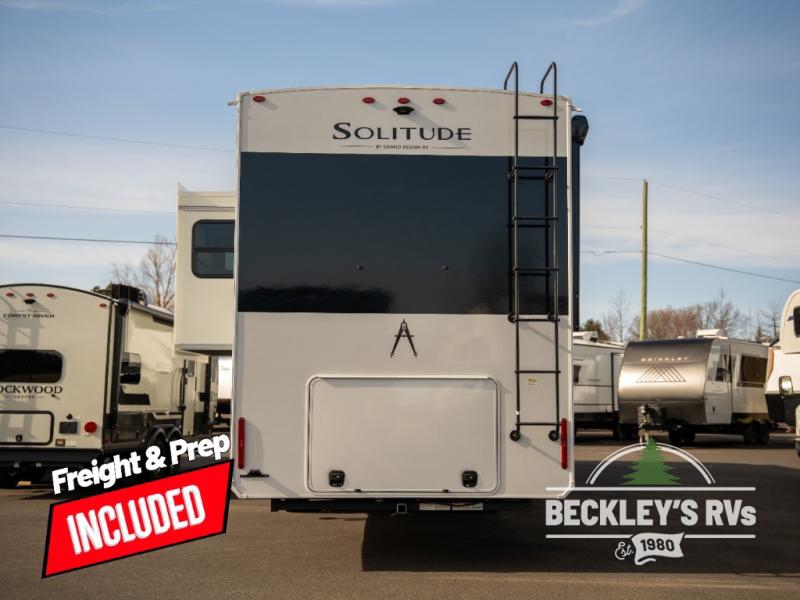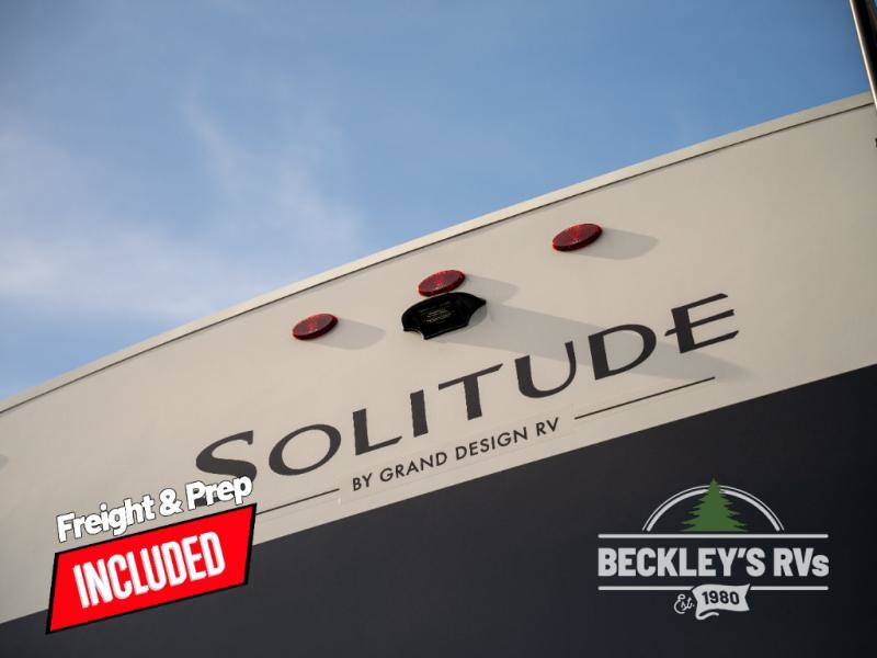Each Solitude fifth wheel by Grand Design features a 101" wide-body construction, heavy duty 8,000 lb. axles, frameless tinted windows, and high-gloss gel coat sidewalls. You can camp during harsh weather thanks to the Weather-Tek Package that includes a 35K BTU high-capacity furnace, an all-in-one enclosed and heated utility center, and a fully enclosed underbelly with heated tanks and storage. Inside, you'll love the premium roller shades, hardwood cabinet doors, solid surface countertops, plus residential finishes throughout to make you truly feel at home. Each model also includes a MORryde CRE3000 suspension system, and a MORryde pin box that will provide smooth towing from home to campground. Affordable luxury is possible with the Solitude fifth wheels; choose yours today!