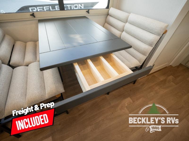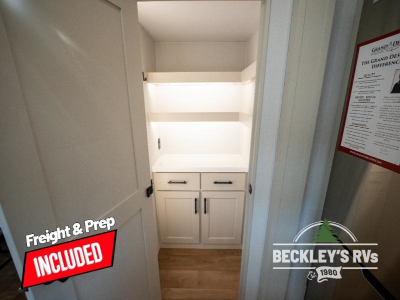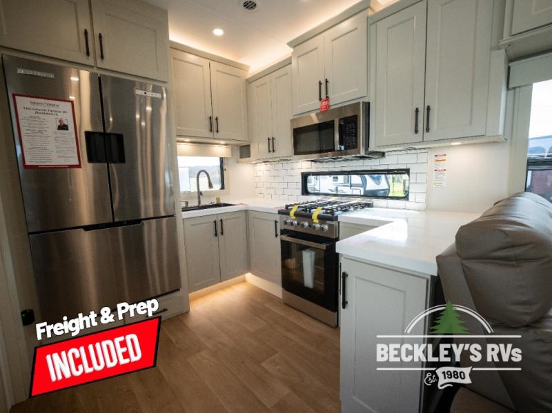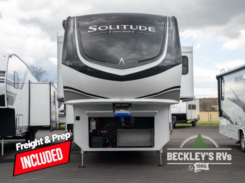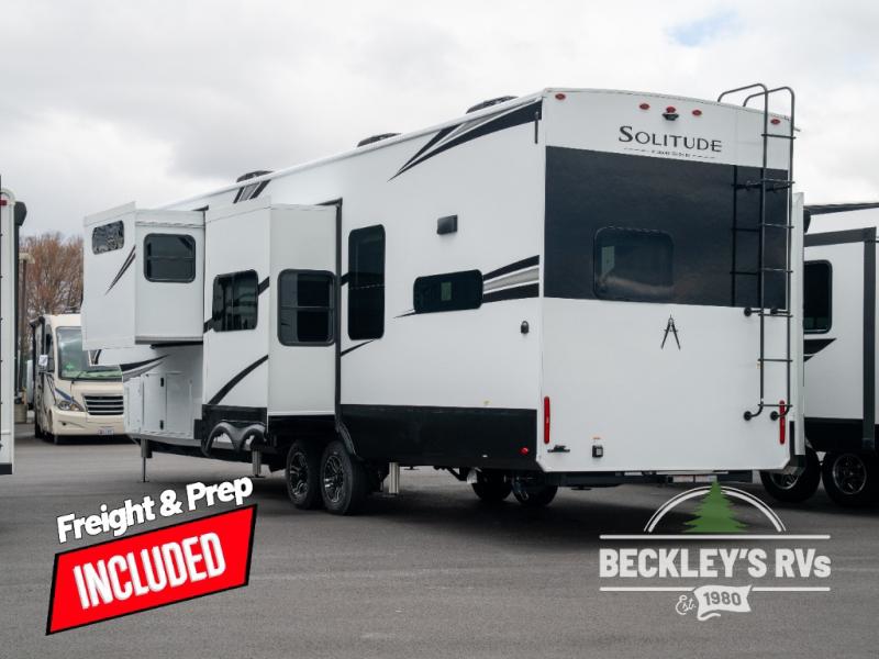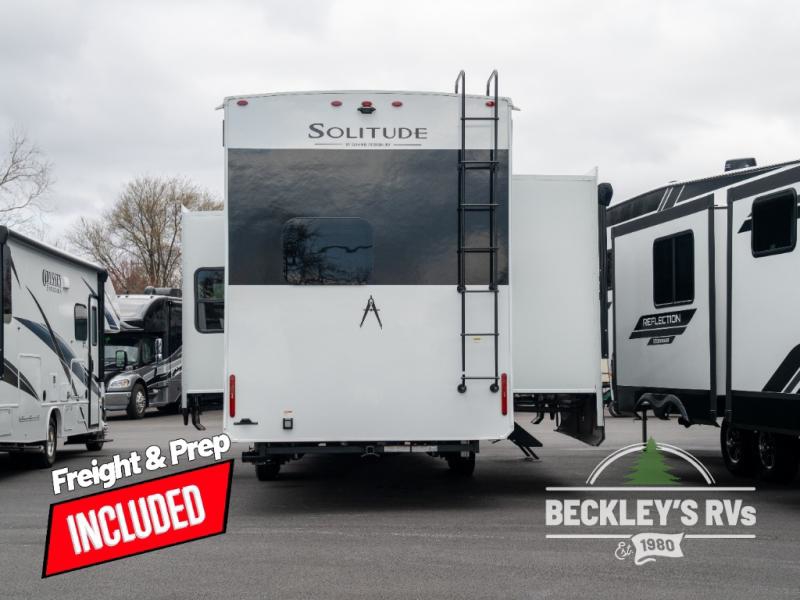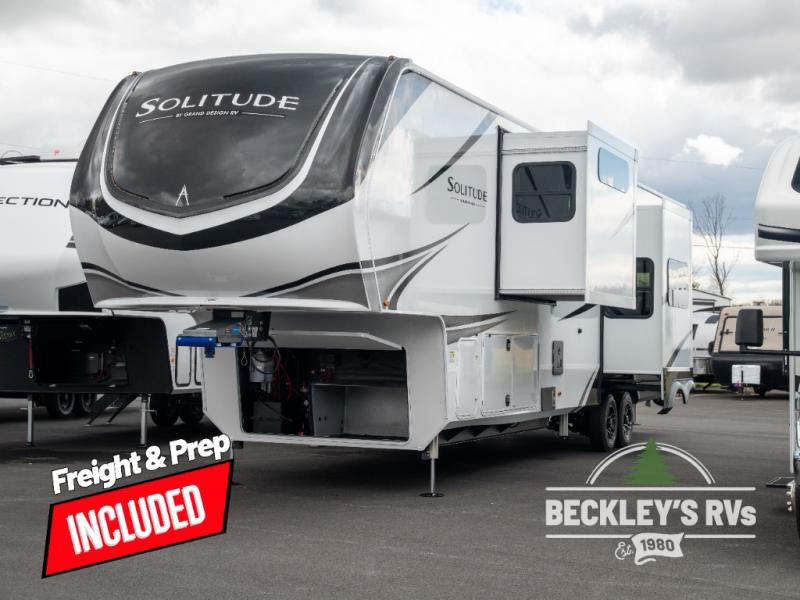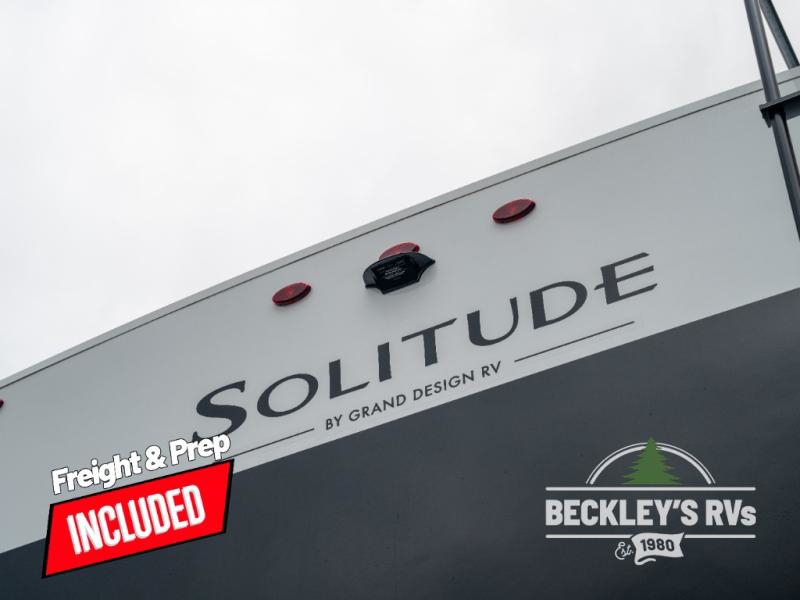 Each Solitude fifth wheel by Grand Design features a 101" wide-body construction, heavy duty 8,000 lb. axles, frameless tinted windows, and high-gloss gel coat sidewalls. You can camp year around thanks to the Weather-Tek Package that includes a 35K BTU high-capacity furnace, an all-in-one enclosed and heated utility center, and a fully enclosed underbelly with heated tanks and storage. Inside, you'll love the premium roller shades, hardwood cabinet doors, solid surface countertops, plus residential finishes throughout to make you truly feel at home. Each model also includes a MORryde CRE3000 suspension system, self adjusting brakes, and a MORryde pin box that will provide smooth towing from home to campground. Affordable luxury is possible with the Solitude fifth wheels; choose yours today!