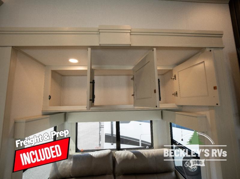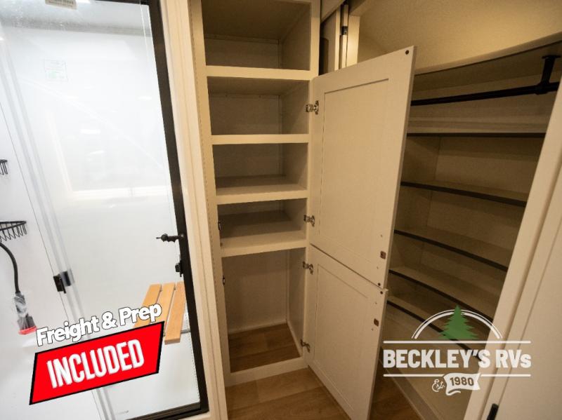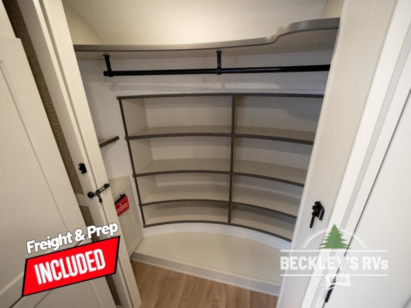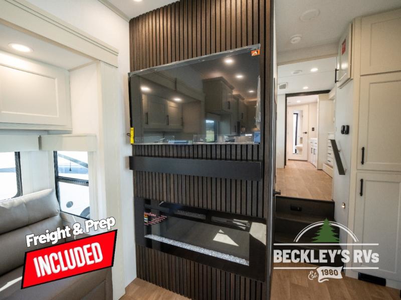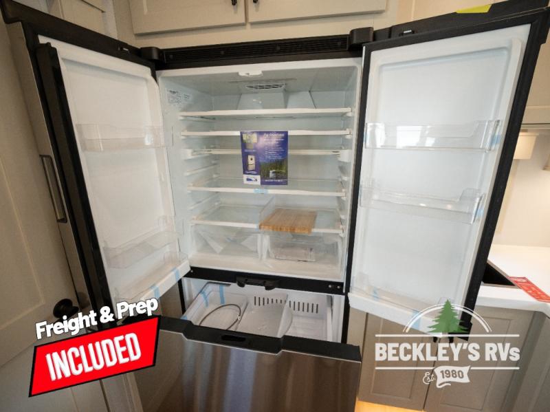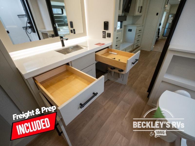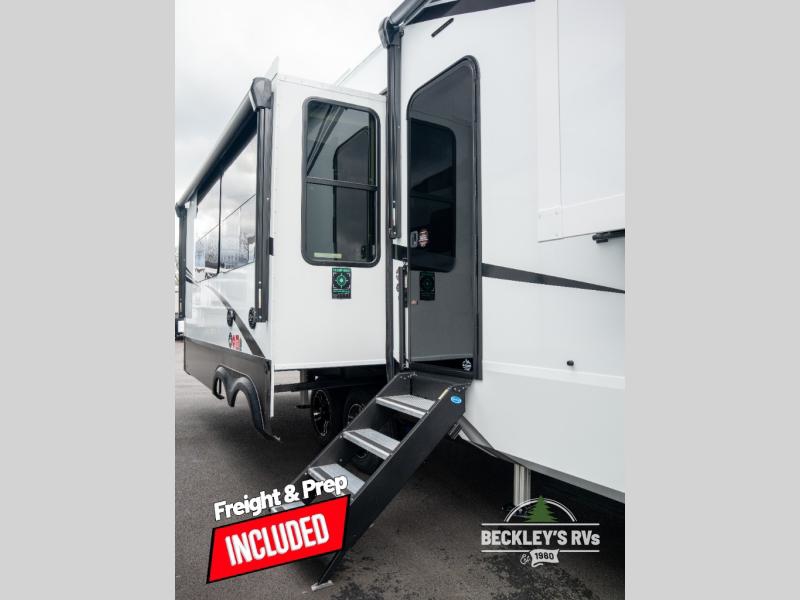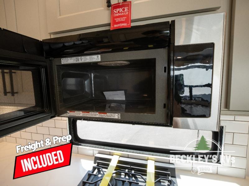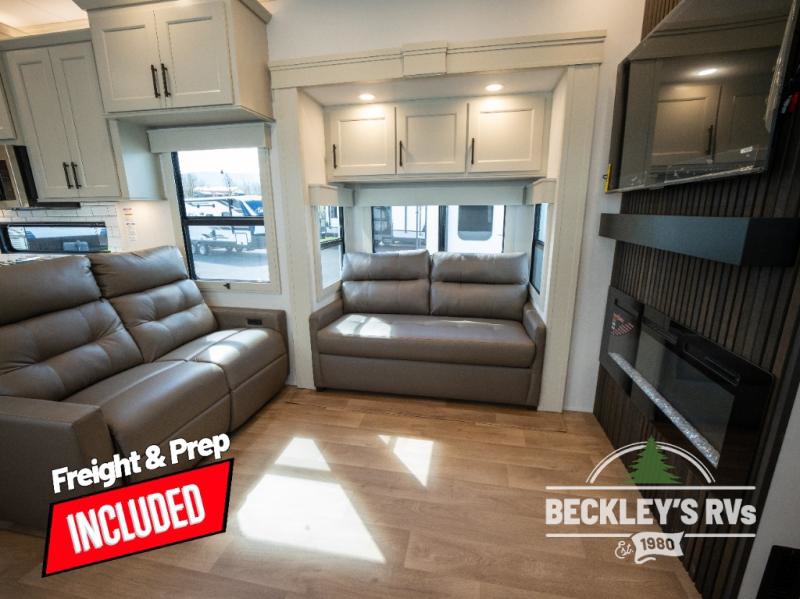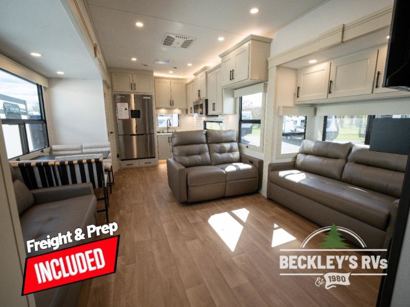 Comfort will come easy in this four slide out fifth wheel! You will feel right at home with a master bedroom that includes a queen bed slide out with a king bed option, dual dressers with a seat in between, plus a large front bath with tons of space. The convenient half bath is right as you enter the unit for convenience. Your crew can get cozy on the dual tri-fold sofas within dual opposing slides, or on the theater seating across from the LED TV and fireplace. One feature you will love about this fifth wheel is the rear kitchen with wrap-around counter space, a built-in oven, plus a 20 cu. ft. 12V refrigerator and a large pantry to keep food fresh.