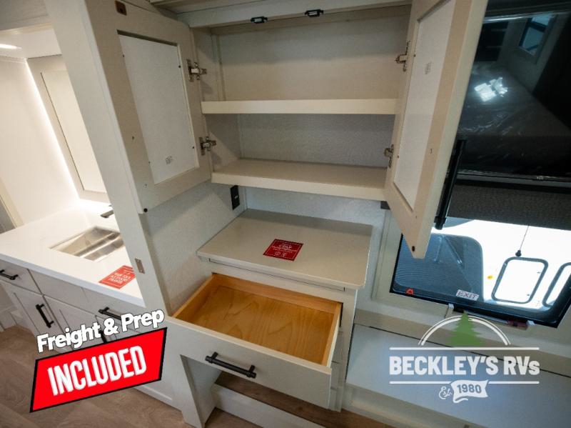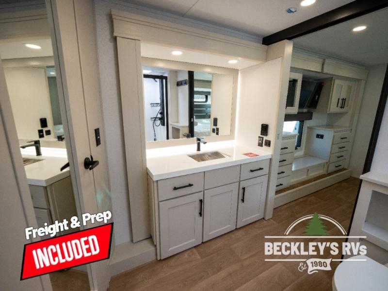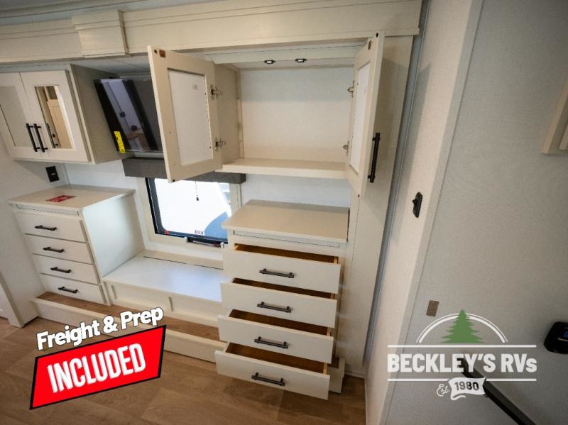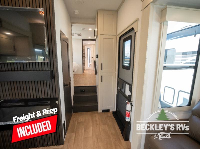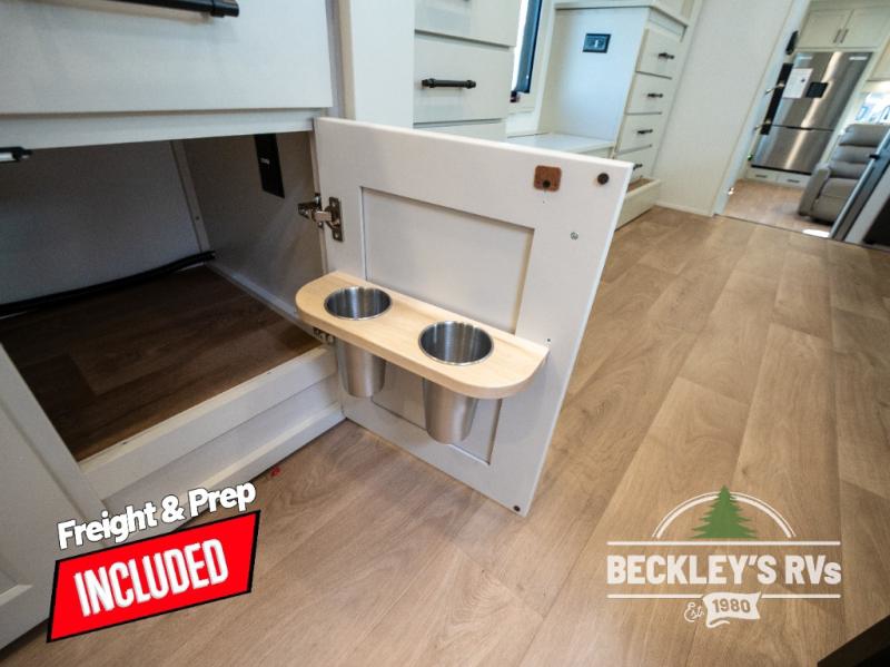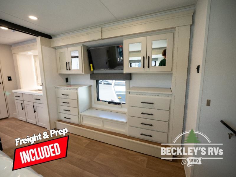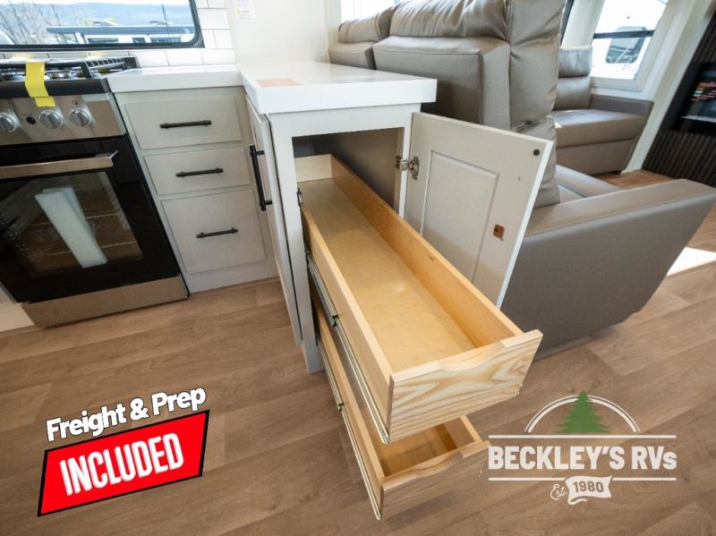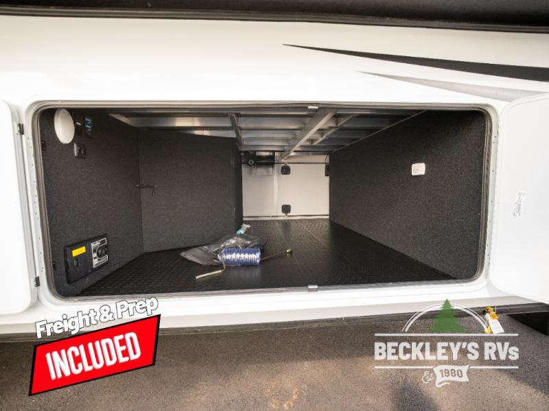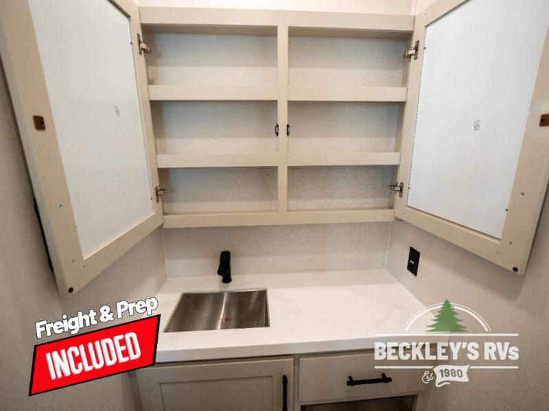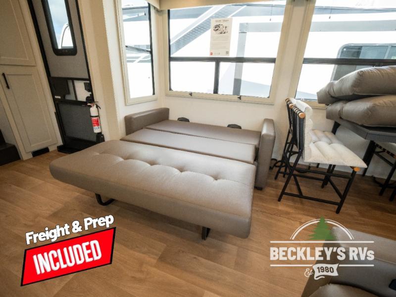 Comfort will come easy in this four slide out fifth wheel! You will feel right at home with a master bedroom that includes a queen bed slide out with a king bed option, dual dressers with a seat in between, plus a large front bath with tons of space. The convenient half bath is right as you enter the unit for convenience. Your crew can get cozy on the dual tri-fold sofas within dual opposing slides, or on the theater seating across from the LED TV and fireplace. One feature you will love about this fifth wheel is the rear kitchen with wrap-around counter space, a built-in oven, plus a 20 cu. ft. 12V refrigerator and a large pantry to keep food fresh.