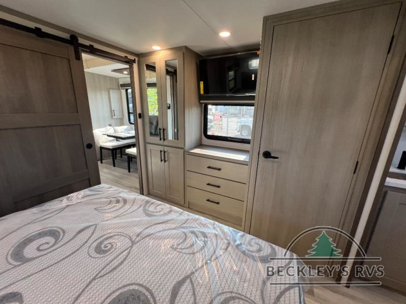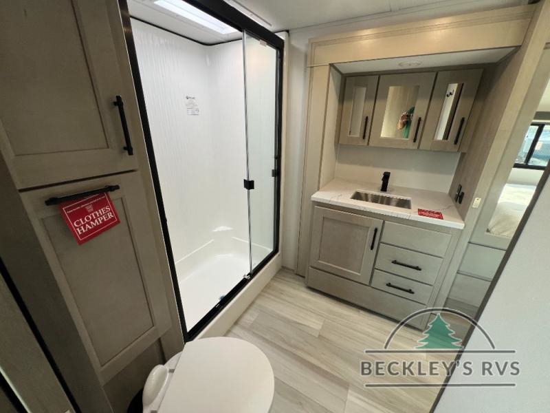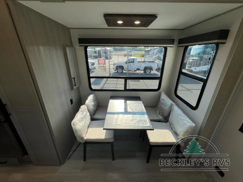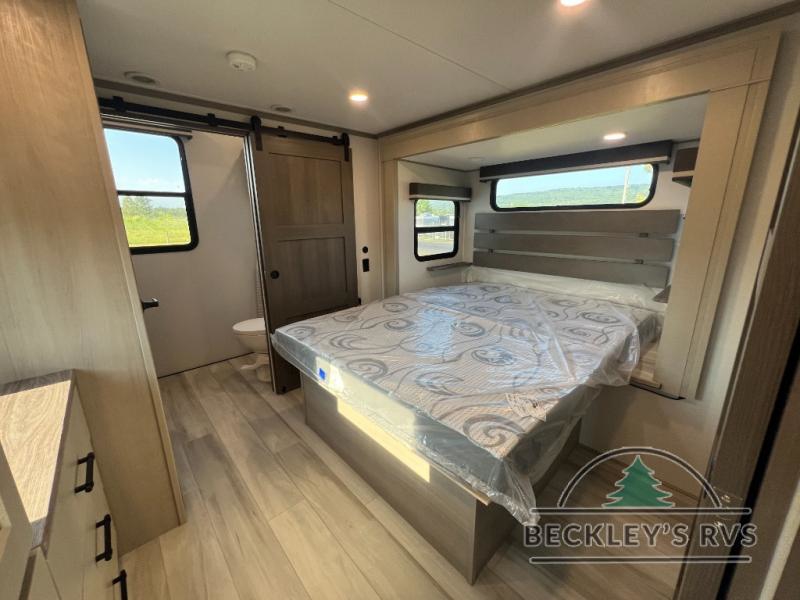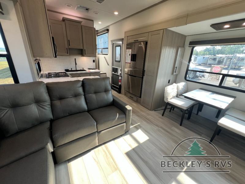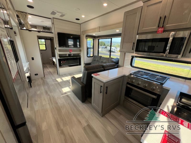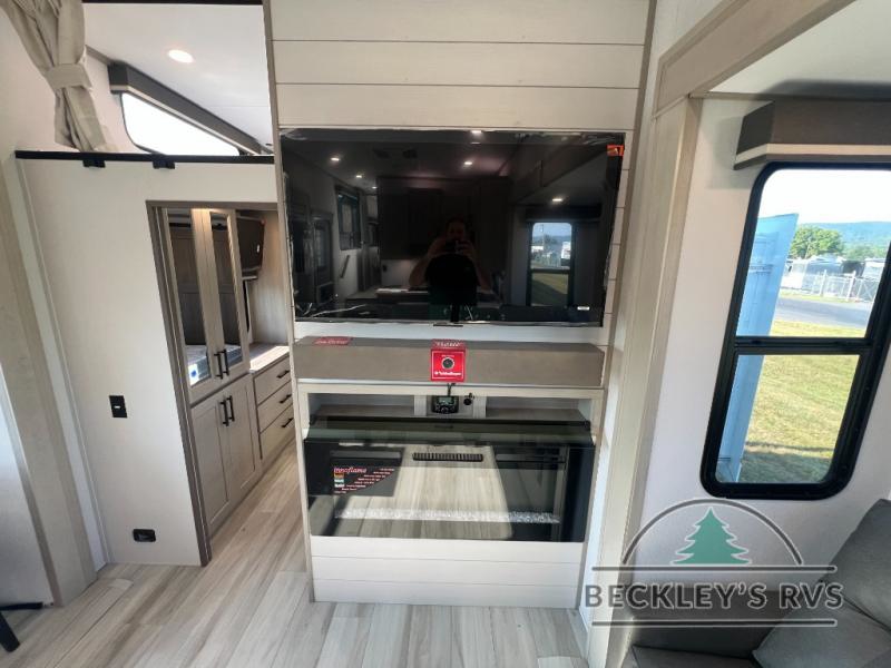 Grab the whole gang and head out in this fifth wheel featuring two private bedrooms, two full baths, and quad slides for even more space in this widebody layout. The living area featuring dual opposing slides offers space to dine and relax including an L-shaped sofa with recliners opposite the entertainment center and fireplace. You'll also love the full kitchen with ample counter space, a spice rack above the microwave, a pull-out pet dish, and more convenient features. The front master bedroom includes a queen bed with an optional king bed, a private entrance into the dual entry bath, plus a slide out with the wardrobe and bath sink. And your guests can take the second master bedroom with a folding queen bed slide, washer and dryer prep, a full rear bath, and even a loft above for more sleeping space!