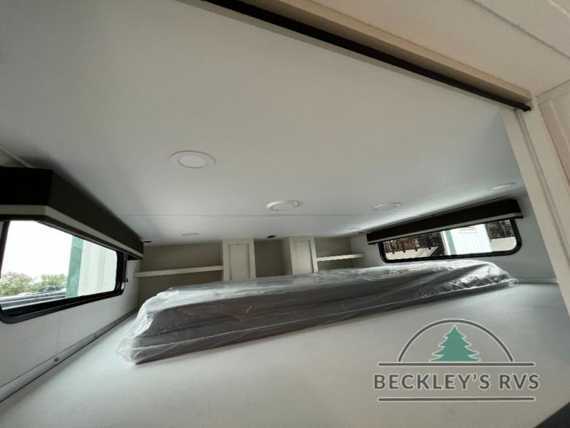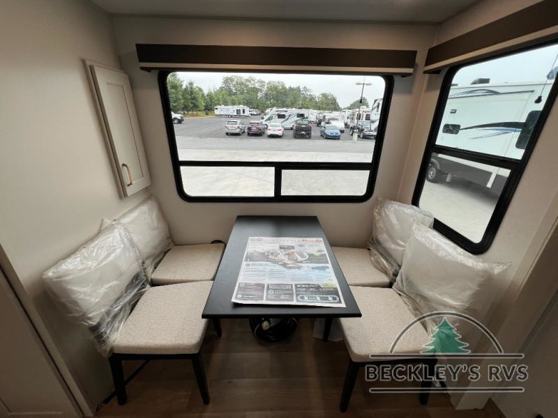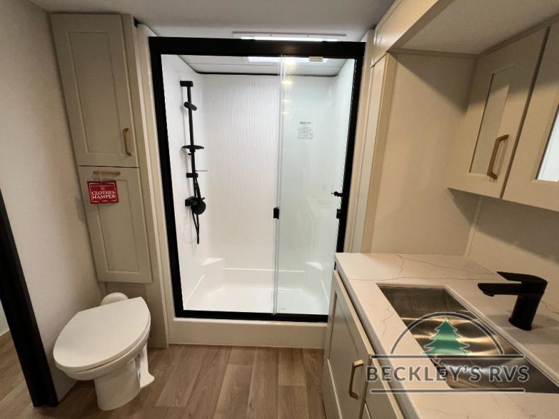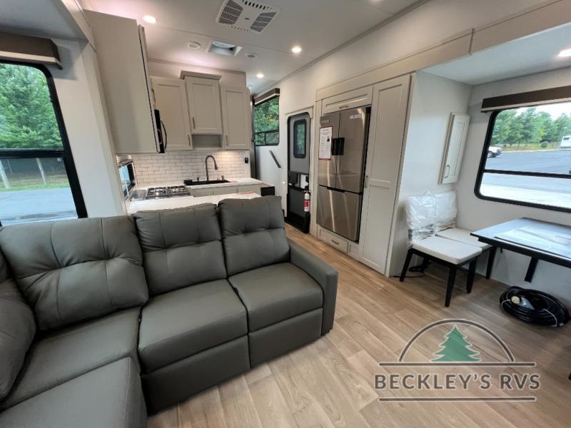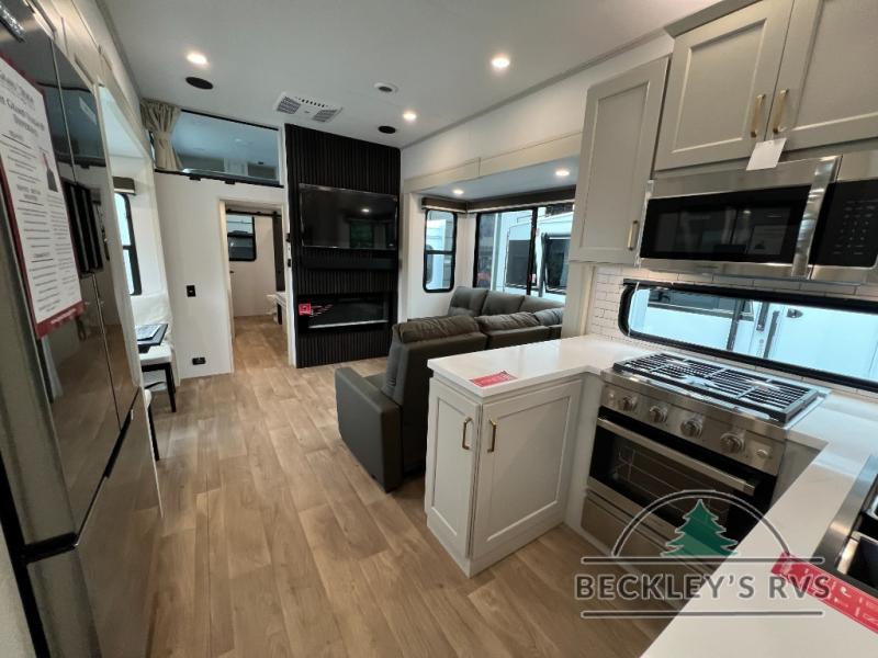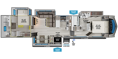 Grab the whole gang and head out in this fifth wheel featuring two private bedrooms, two full baths, and quad slides for even more space in this widebody layout. The living area featuring dual opposing slides offers space to dine and relax including an L-shaped sofa with recliners opposite the entertainment center and fireplace. You'll also love the full kitchen with ample counter space, a spice rack above the microwave, a pull-out pet dish, and more convenient features. The front master bedroom includes a queen bed with an optional king bed, a private entrance into the dual entry bath, plus a slide out with the wardrobe and bath sink. And your guests can take the second master bedroom with a folding queen bed slide, washer and dryer prep, a full rear bath, and even a loft above for more sleeping space!
