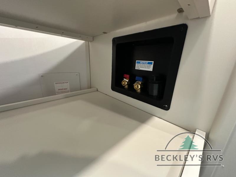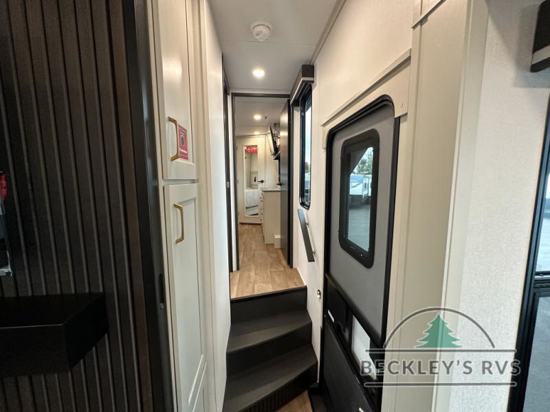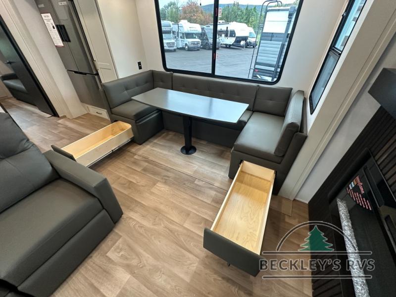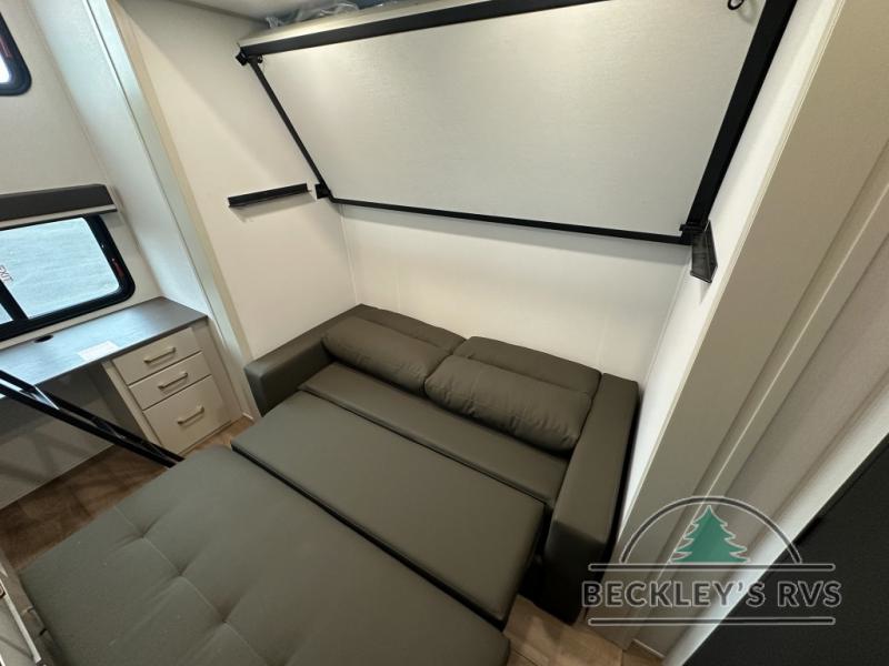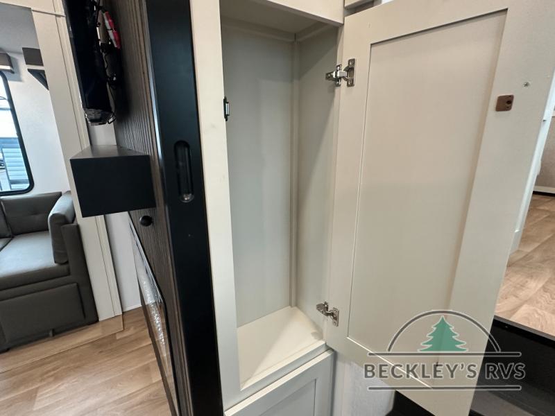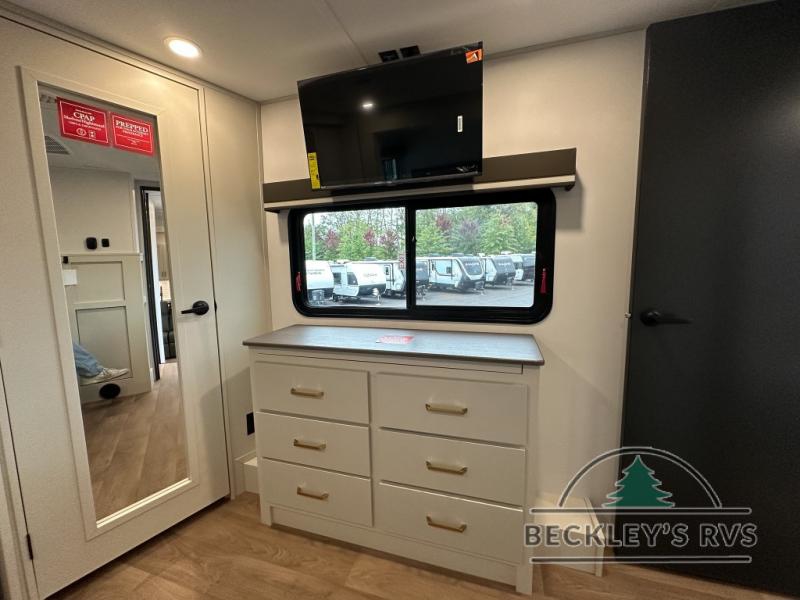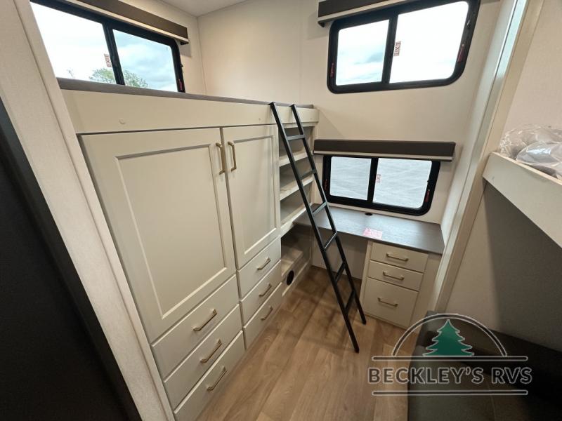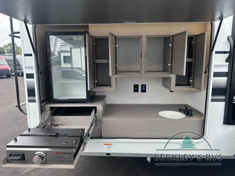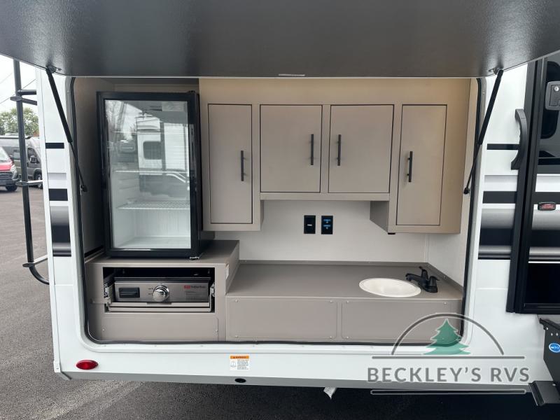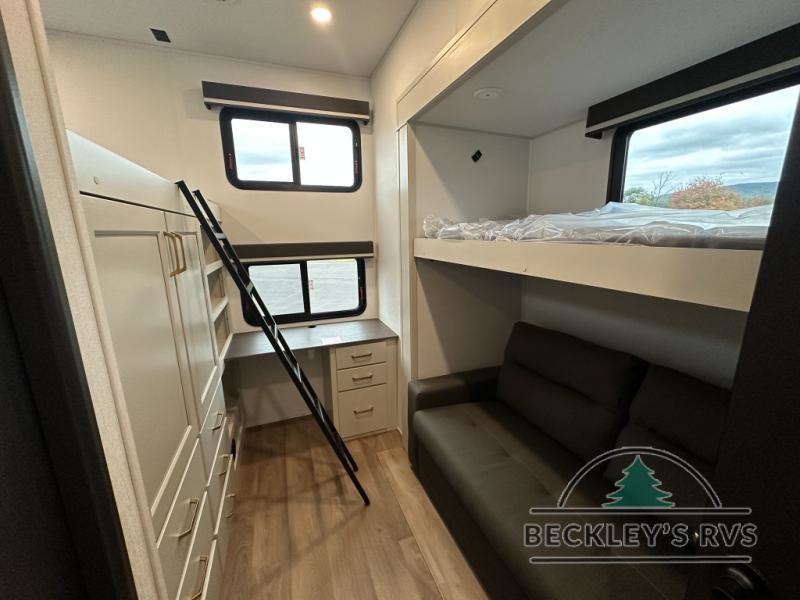 Grab the whole gang and head out in this fifth wheel featuring a private bunkhouse that sleeps five. This unit also features dual entry doors for added convenience with one set leading into a half bath, and quad slides for even more space in this widebody layout. The combined kitchen and living area featuring dual opposing slides offer space to dine and relax including theater seating for two opposite the entertainment center and fireplace. The chef in your group will appreciate the amenities for dreaming up dishes to feed everyone, and the outside griddle, sink and beverage cooler provides even more options. In front, a private bedroom and full bath with a queen bed or optional king bed, your choice. You can even add a washer and dryer with a space in front prepped for both if you like.
