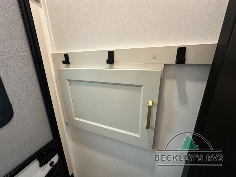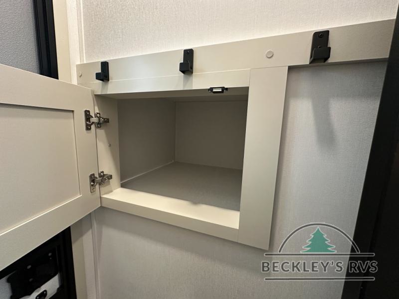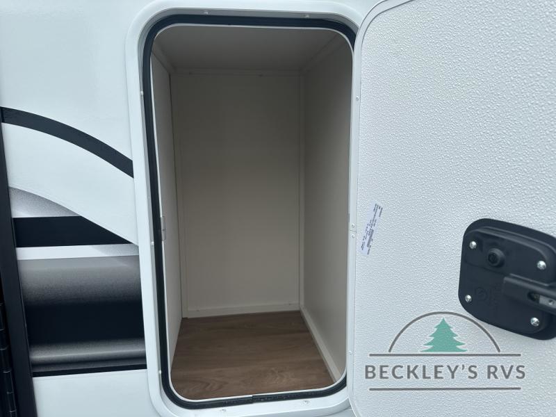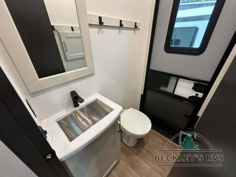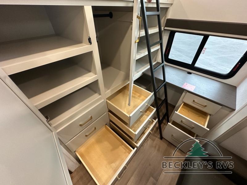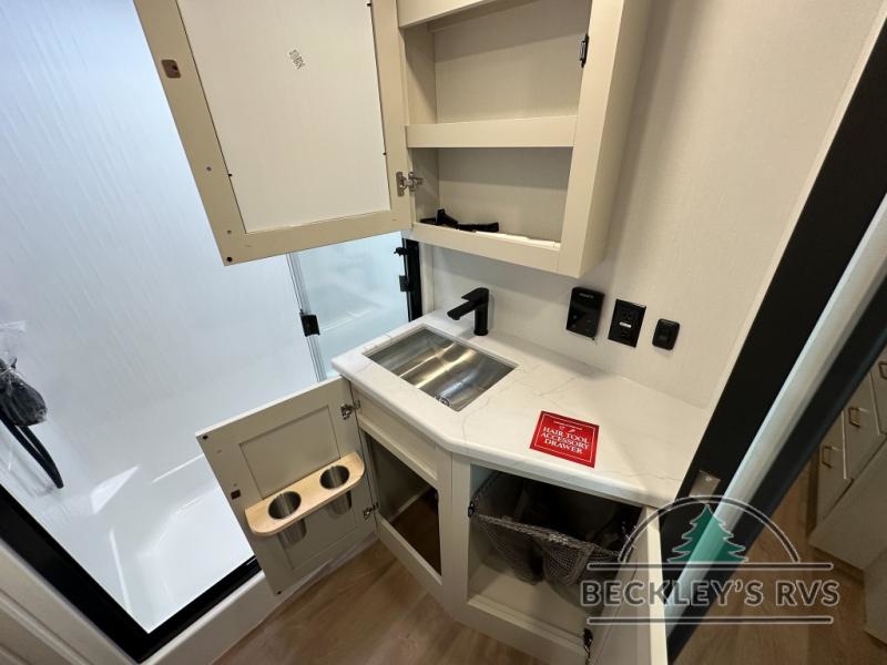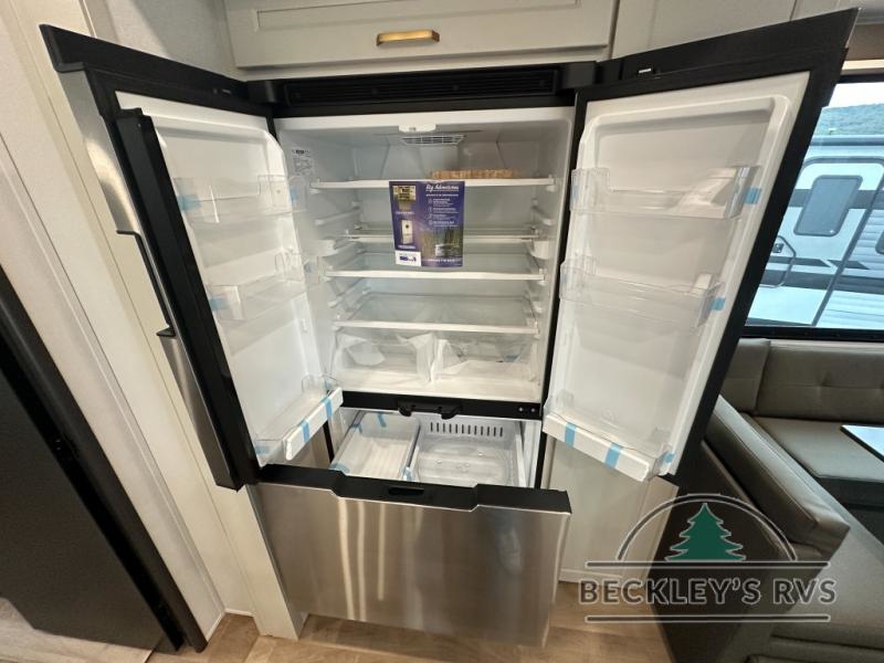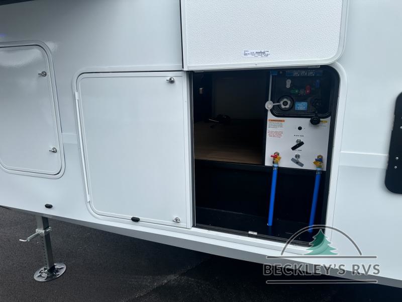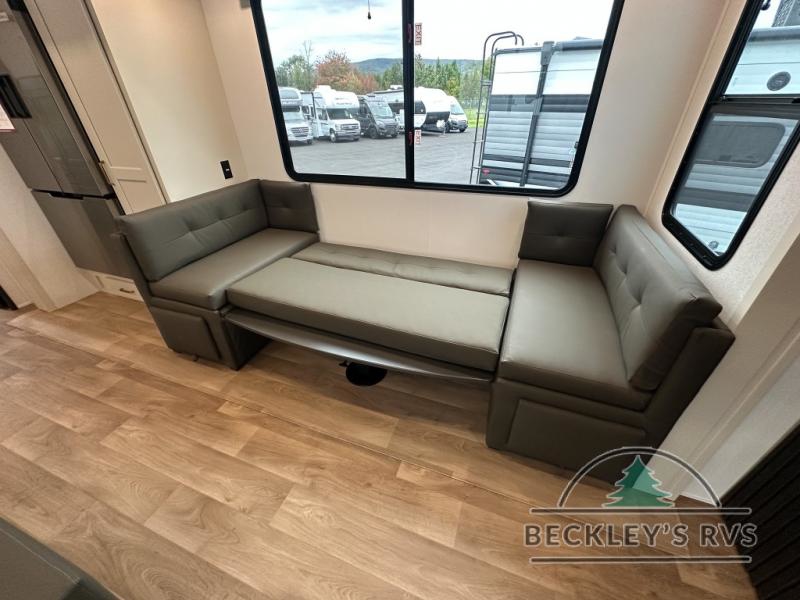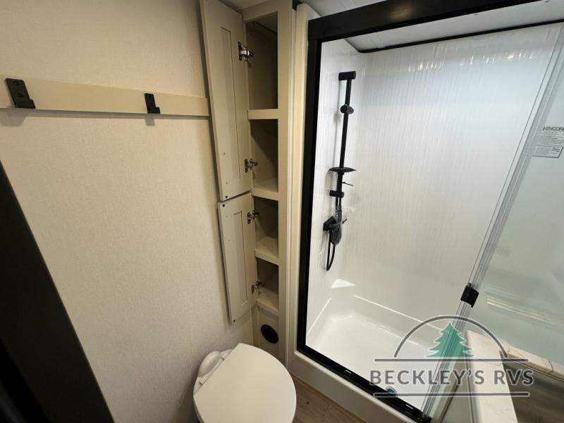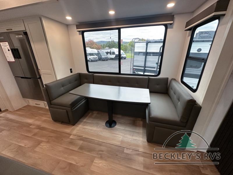 Grab the whole gang and head out in this fifth wheel featuring a private bunkhouse that sleeps five. This unit also features dual entry doors for added convenience with one set leading into a half bath, and quad slides for even more space in this widebody layout. The combined kitchen and living area featuring dual opposing slides offer space to dine and relax including theater seating for two opposite the entertainment center and fireplace. The chef in your group will appreciate the amenities for dreaming up dishes to feed everyone, and the outside griddle, sink and beverage cooler provides even more options. In front, a private bedroom and full bath with a queen bed or optional king bed, your choice. You can even add a washer and dryer with a space in front prepped for both if you like.