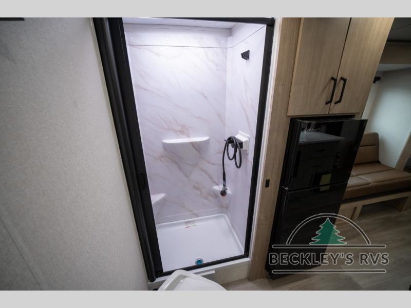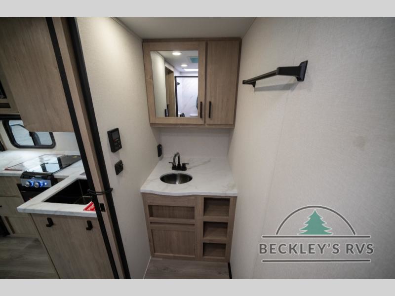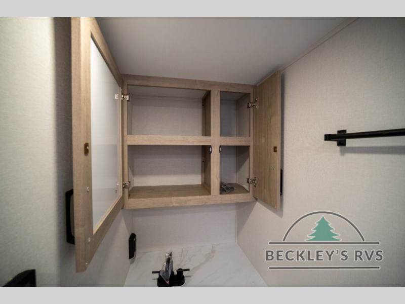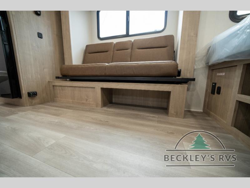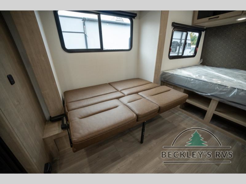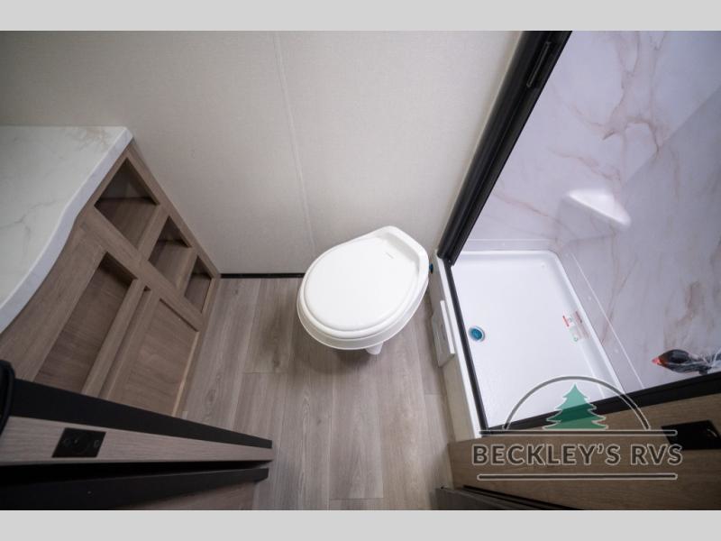 Pack your bags and head out on a fun camping trip in this travel trailer! The front queen bed offers a comfortable place to sleep at night, as well as the roll-over sleeper sofa slide with shoe storage. You can make meals on the cooktop or in the convection microwave. The full rear bathroom has a walk-in shower with an oversized vanity to easily get ready each day. Outside, you'll find a spray port, an unobstructed pass-thru storage, and an interior/exterior table to use at your convenience.