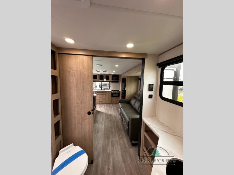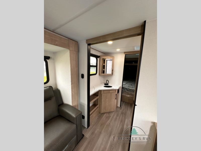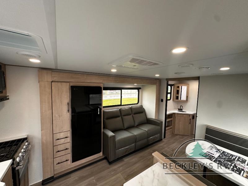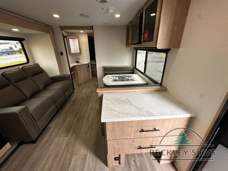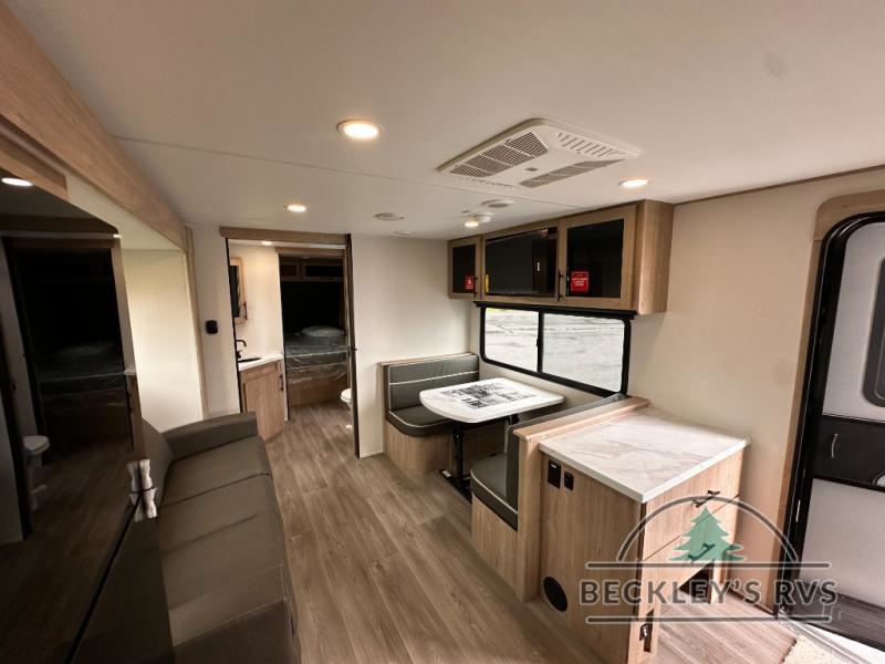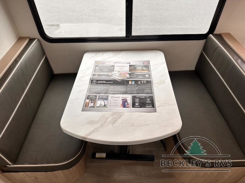 Treat yourself to a weekend of fun in this Imagine XLS travel trailer! Whether it's just you and your spouse, or you've chosen to bring along a group of friends, this trailer will meet the need. The front bedroom can sleep two people on the walk-around queen-size bed. The bedroom is quite functional because it not only contains the second exterior entry door, but it also has a private entrance into the walk-through bathroom since it is located on the other side of the bathroom. The booth dinette is functional too because it can transform from a dining location into a sleeping location, and the theater seating is directly across from the LED TV for easy viewing.