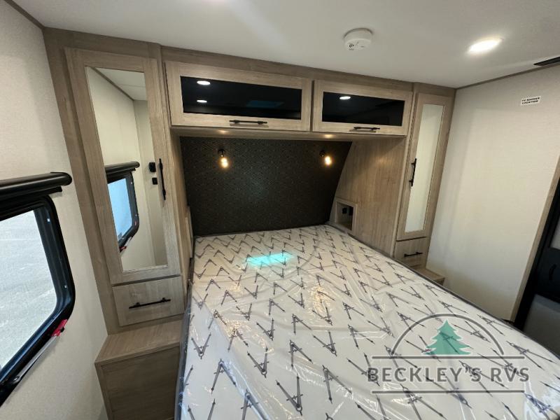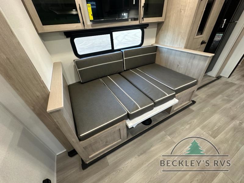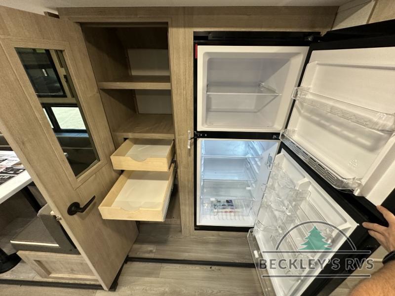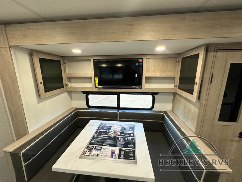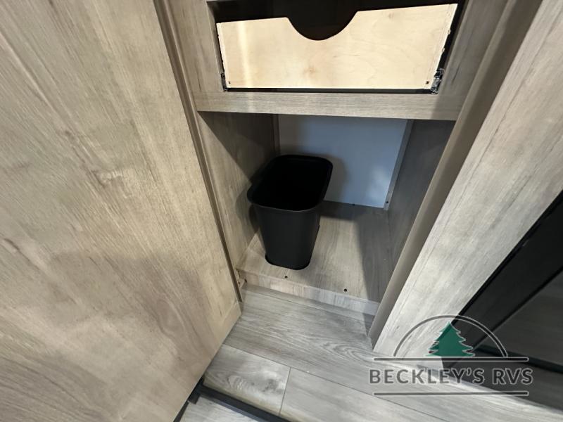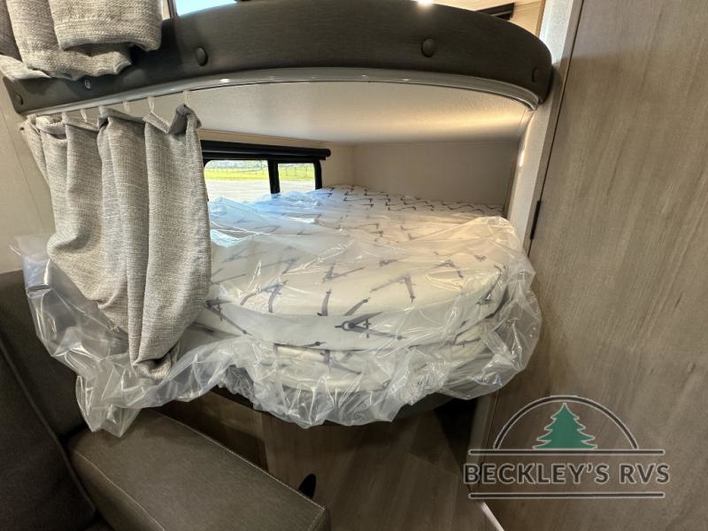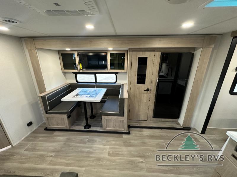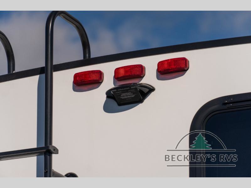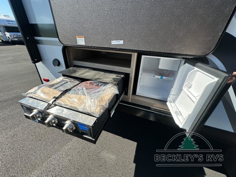 The dual entry doors make it easy to enter and exit this travel trailer! You will find a walk-around queen-size bed up front in the private bedroom, and one of the entry/exit doors to the unit so you can quietly slip out for an early morning fishing trip. The U-shaped dinette is right next to the window, so you can look out at your surroundings while you enjoy breakfast. The double-size bunks have some privacy curtains, and the bunks are right next to the full bathroom for easy access in the middle of the night. The fully equipped kitchen has everything you need to get dinner in the oven, and you can have some more prep space by using the flip-up countertop extension. You even have an outdoor griddle and an outdoor 1.6 cu. ft. refrigerator to enjoy a cold beverage while you cook under the 22' electric awning!