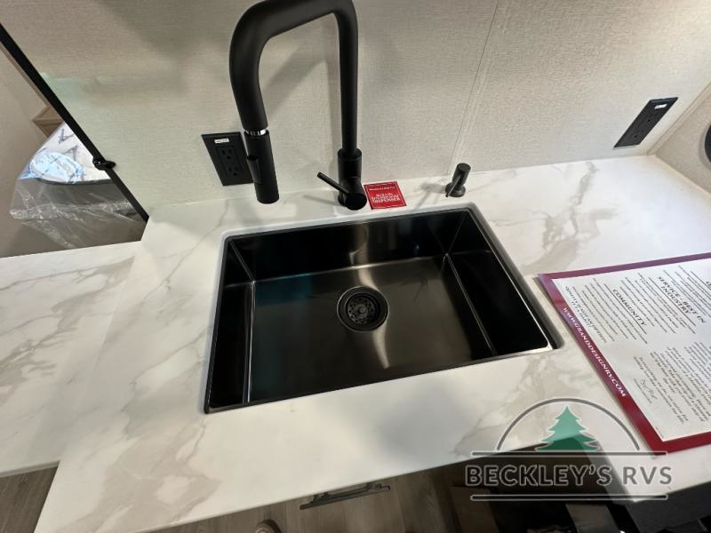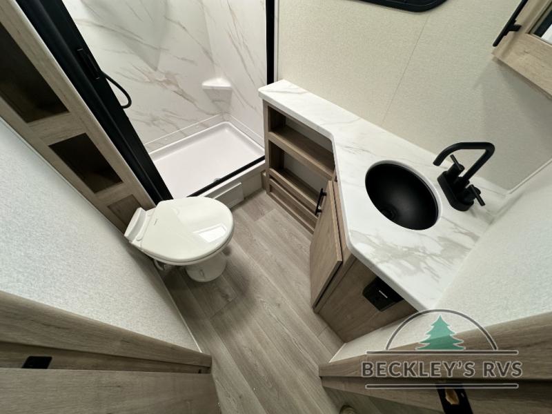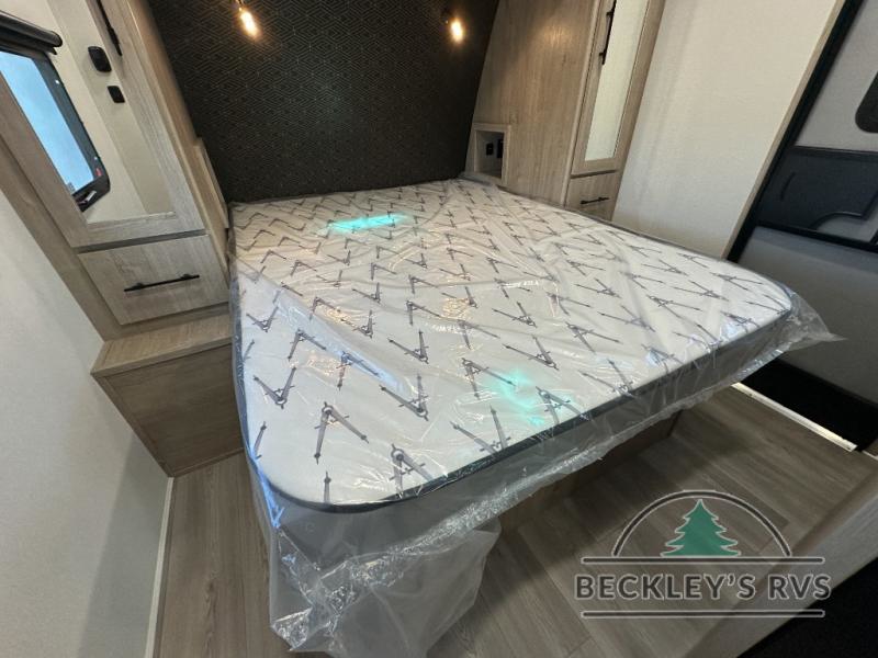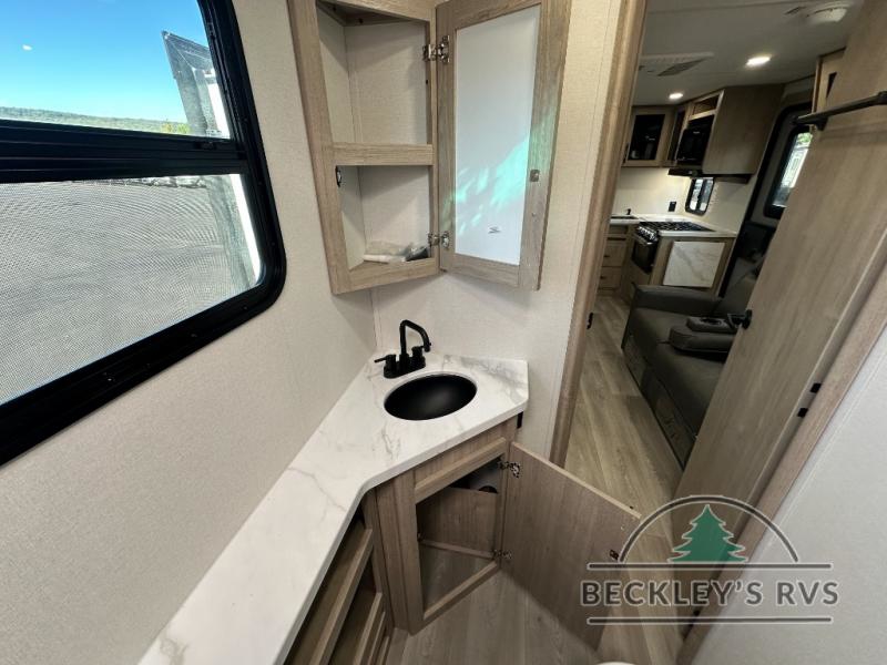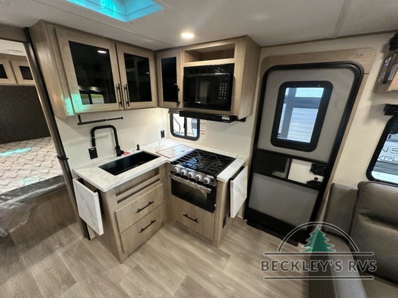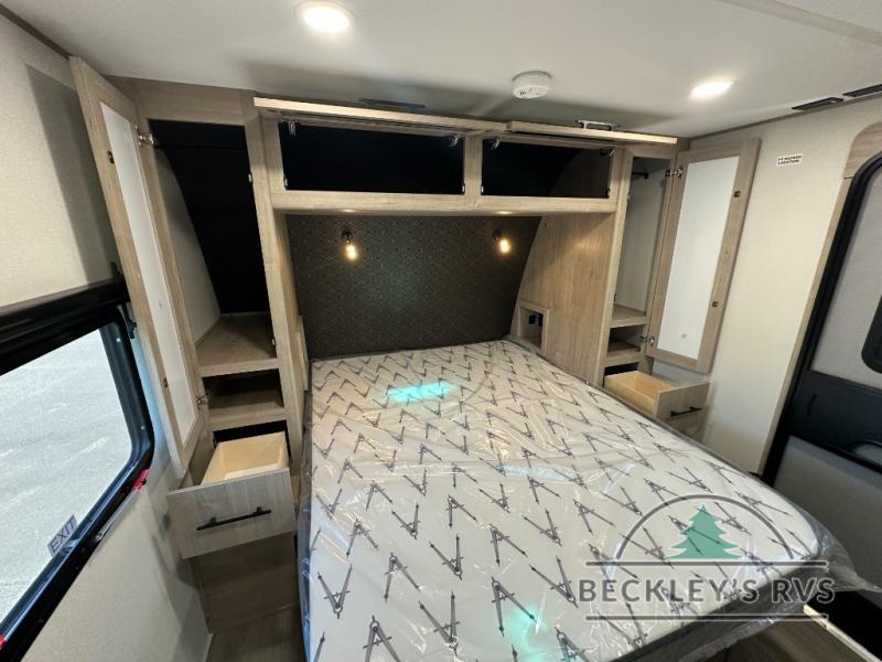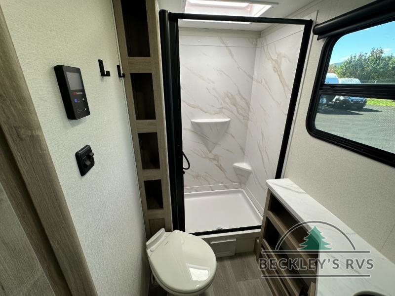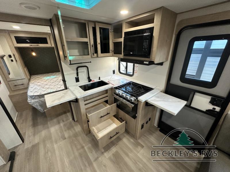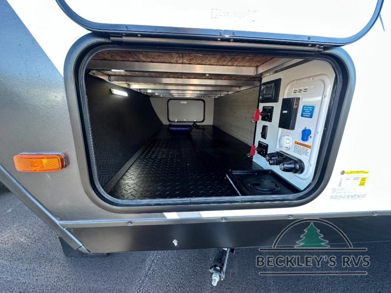 The dual entry doors make it easy to enter and exit this travel trailer! You will find a walk-around queen-size bed up front in the private bedroom, and one of the entry/exit doors to the unit so you can quietly slip out for an early morning fishing trip. The U-shaped dinette is right next to the window, so you can look out at your surroundings while you enjoy breakfast. The double-size bunks have some privacy curtains, and the bunks are right next to the full bathroom for easy access in the middle of the night. The fully equipped kitchen has everything you need to get dinner in the oven, and you can have some more prep space by using the flip-up countertop extension. You even have an outdoor griddle and an outdoor 1.6 cu. ft. refrigerator to enjoy a cold beverage while you cook under the 22' electric awning!