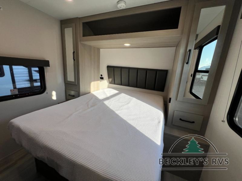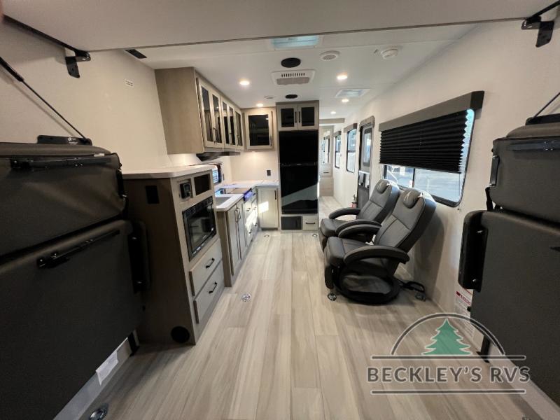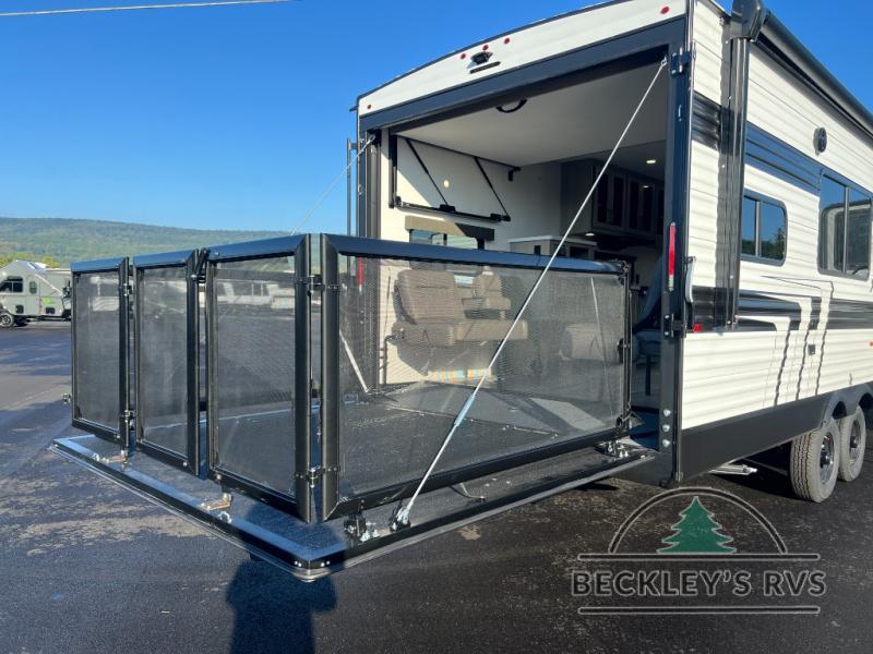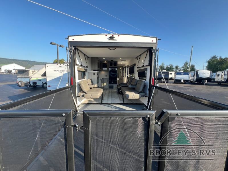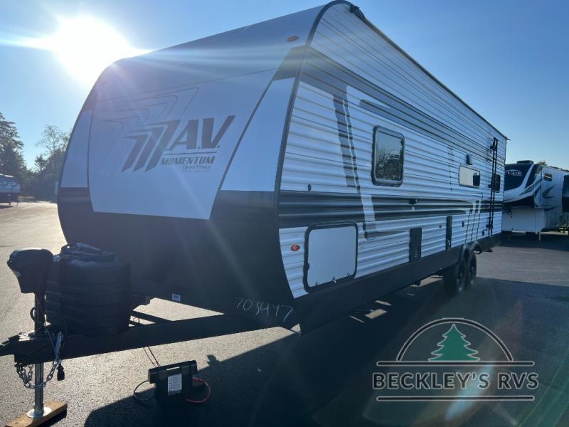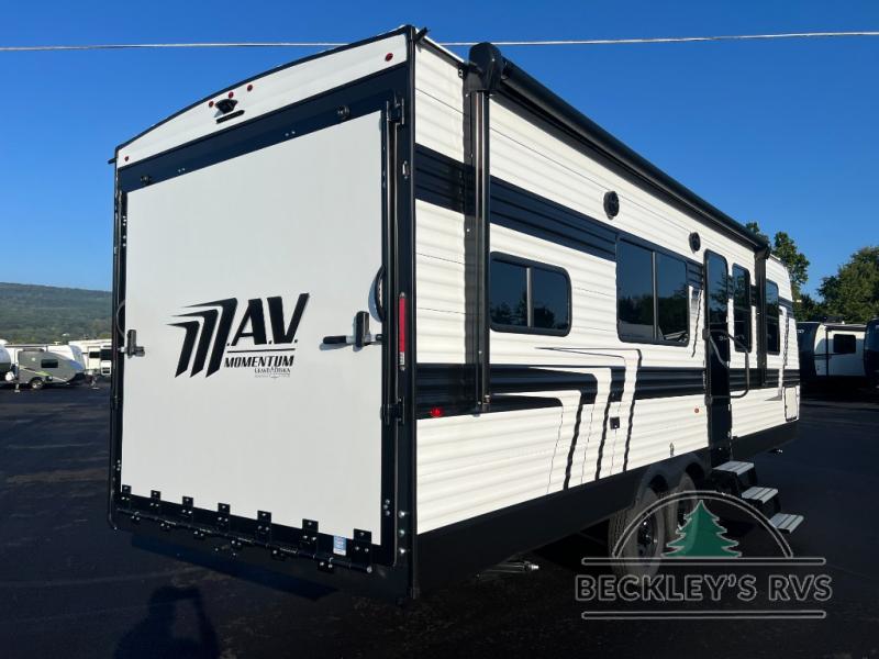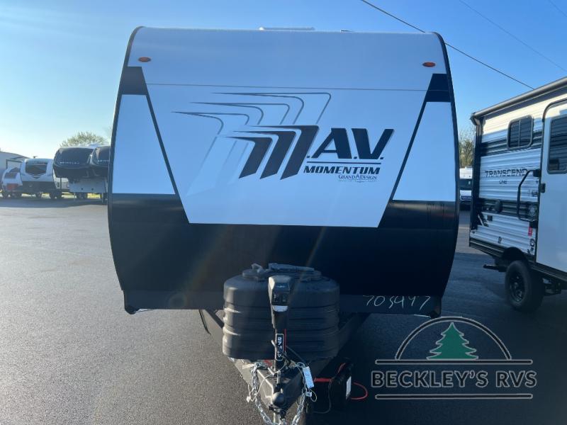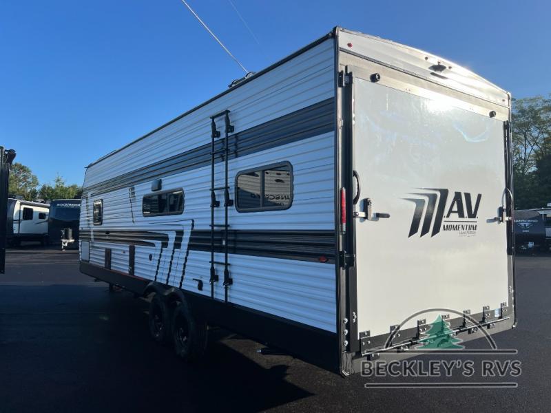 You will love this Momentum MAV toy hauler travel trailer! The front bedroom features a queen bed, and there is plenty of room to walk around. The sliding solid bedroom door helps with space. Overhead storage and a pair of nightstands are convenient storage, plus there is a wardrobe with both drawers and space to hang items. The kitchen offers a microwave, stainless steel sink, and an 8 cu. ft. 12V refrigerator. In the garage, you'll find rollover sofas with a table and a top bed for guests to sleep on. The ramp door/patio will provide additional living space once your toys are unloaded, and the pull down screen will keep bugs out!