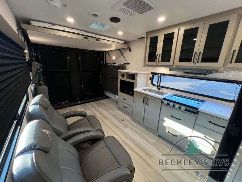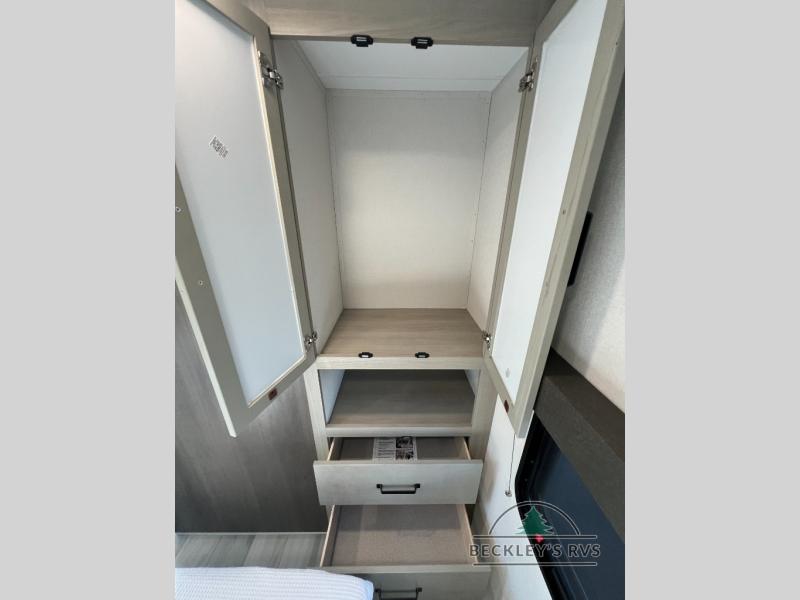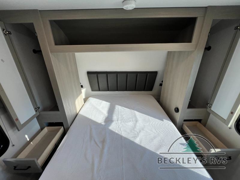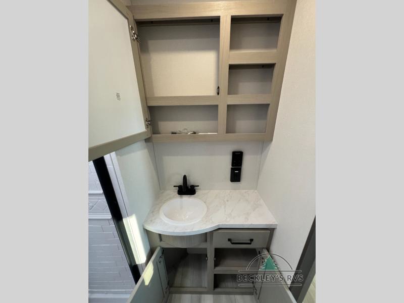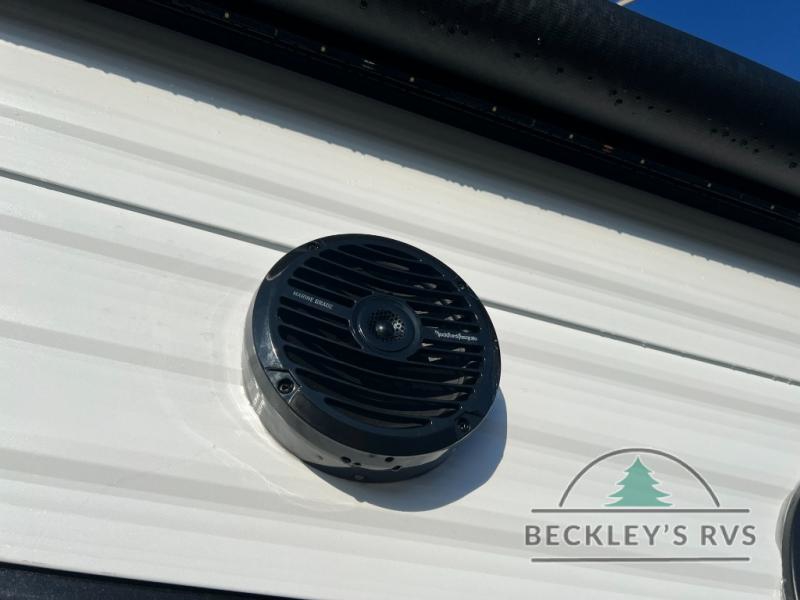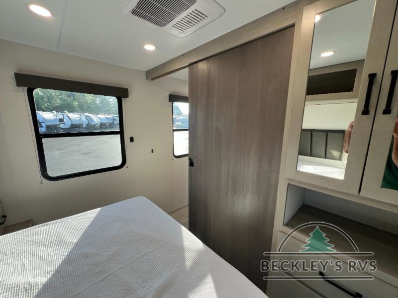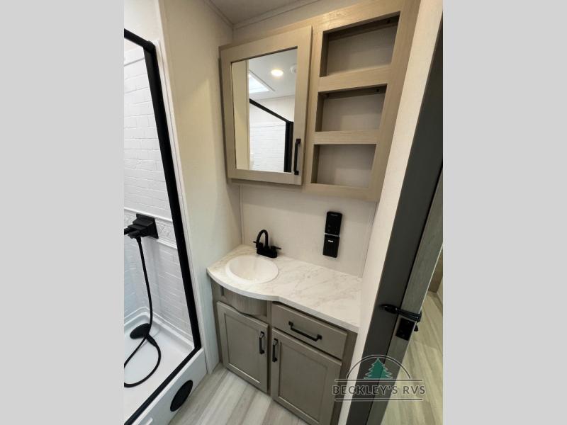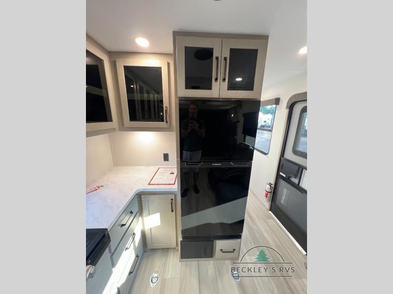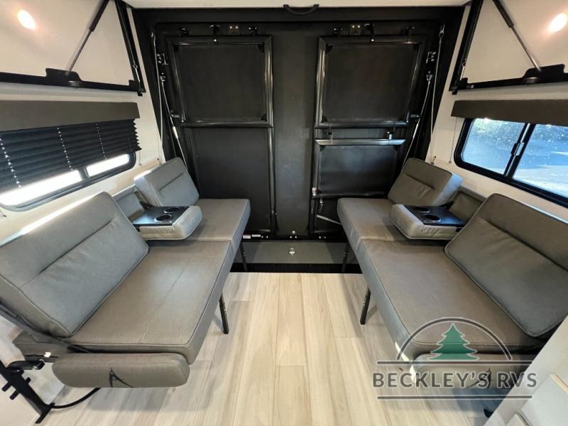 You will love this Momentum MAV toy hauler travel trailer! The front bedroom features a queen bed, and there is plenty of room to walk around. The sliding solid bedroom door helps with space. Overhead storage and a pair of nightstands are convenient storage, plus there is a wardrobe with both drawers and space to hang items. The kitchen offers a microwave, stainless steel sink, and an 8 cu. ft. 12V refrigerator. In the garage, you'll find rollover sofas with a table and a top bed for guests to sleep on. The ramp door/patio will provide additional living space once your toys are unloaded, and the pull down screen will keep bugs out!