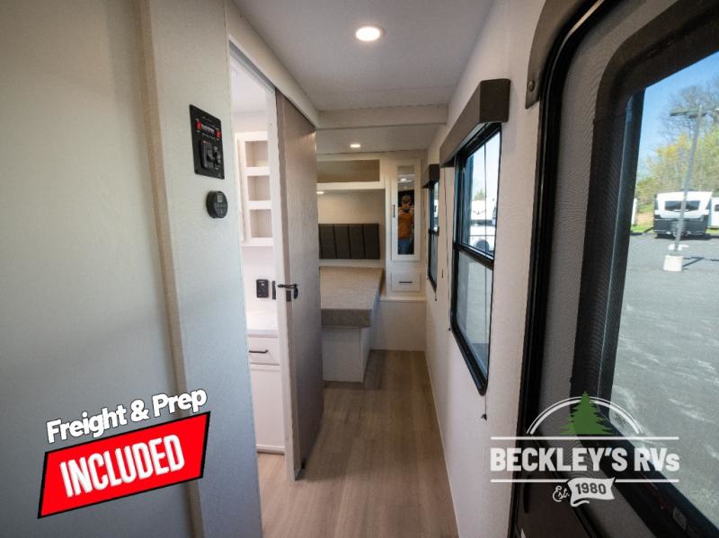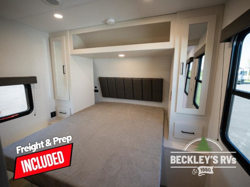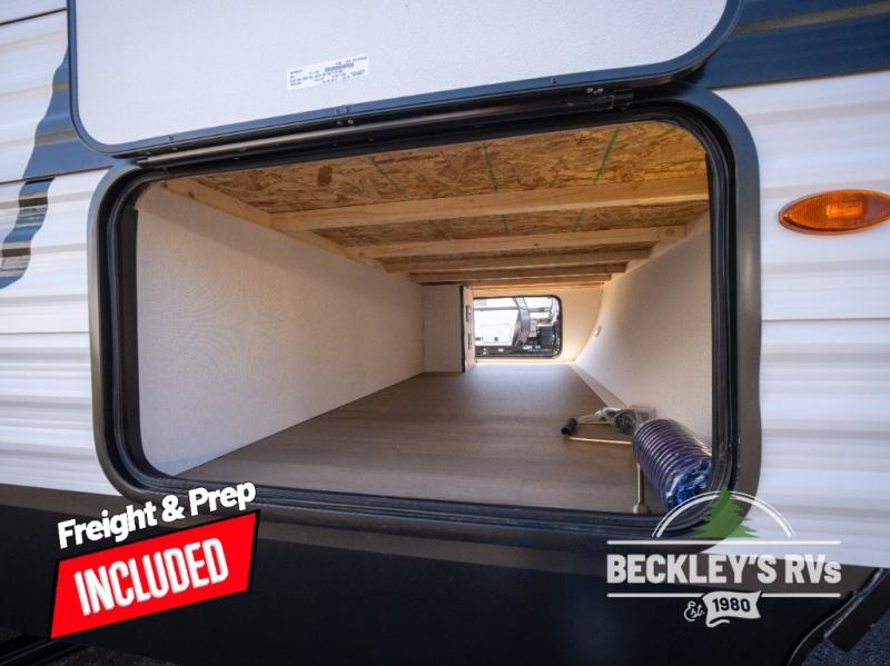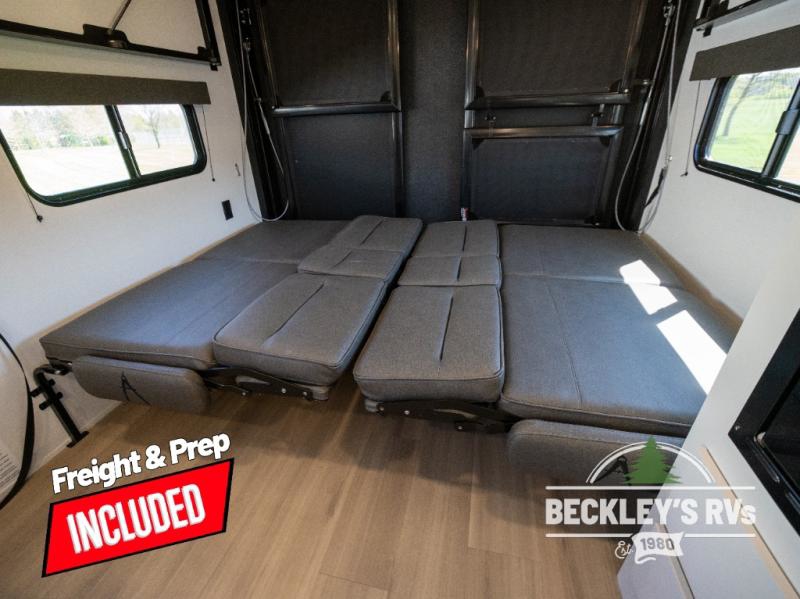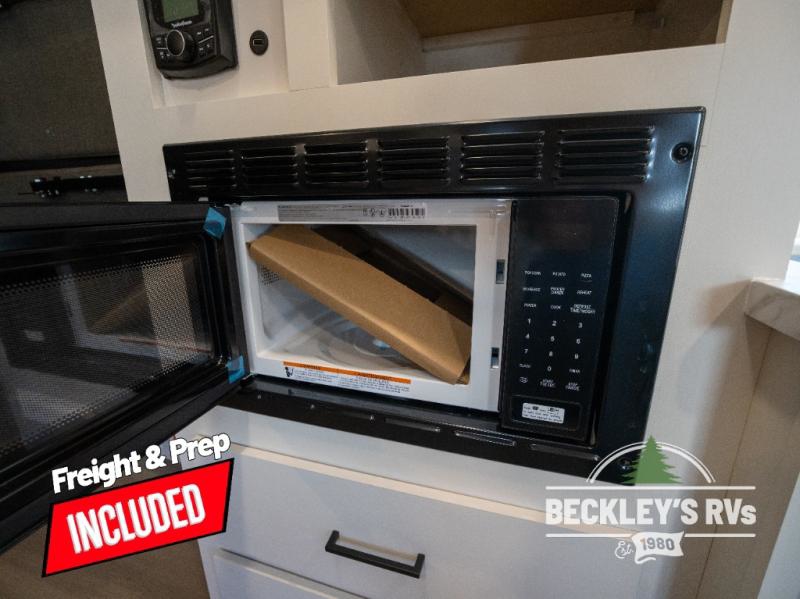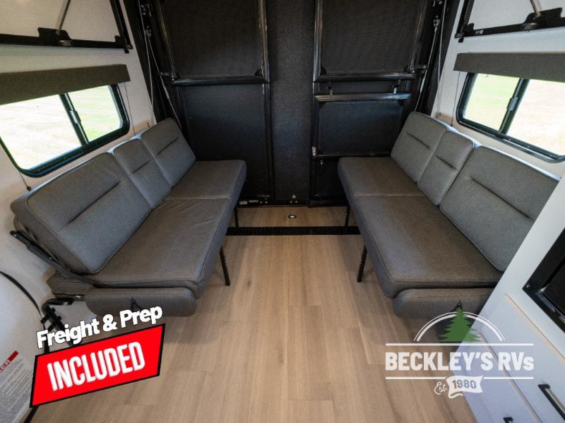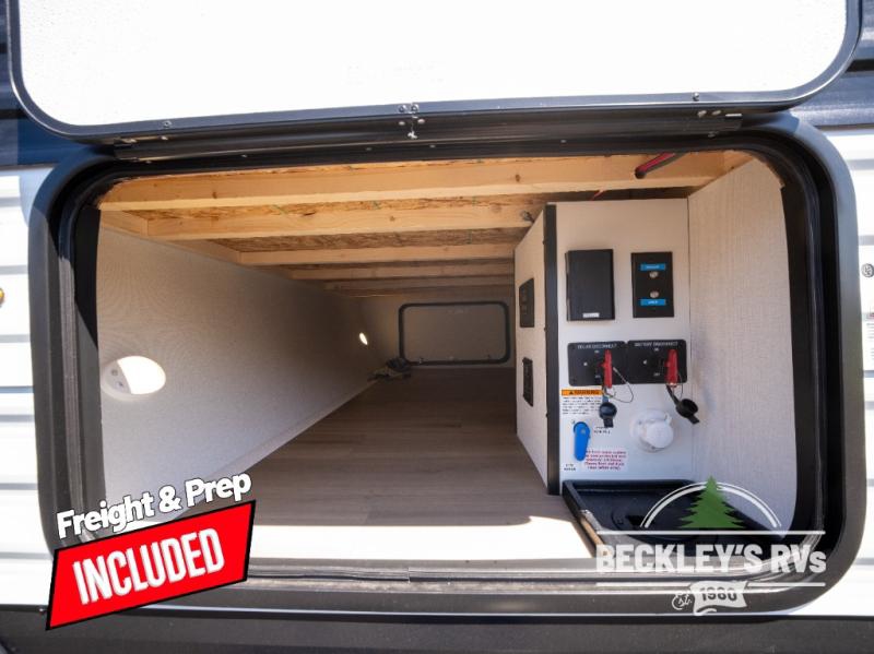 You will love this Momentum MAV toy hauler travel trailer! The front bedroom features a queen bed, and there is plenty of room to walk around. The sliding solid bedroom door helps with space. Overhead storage and a pair of nightstands are convenient storage, plus there is a wardrobe with both drawers and space to hang items. The kitchen offers a microwave, stainless steel sink, and an 8 cu. ft. 12V refrigerator. In the garage, you'll find rollover sofas with a table and a top bed for guests to sleep on. The ramp door/patio will provide additional living space once your toys are unloaded, and the pull down screen will keep bugs out!