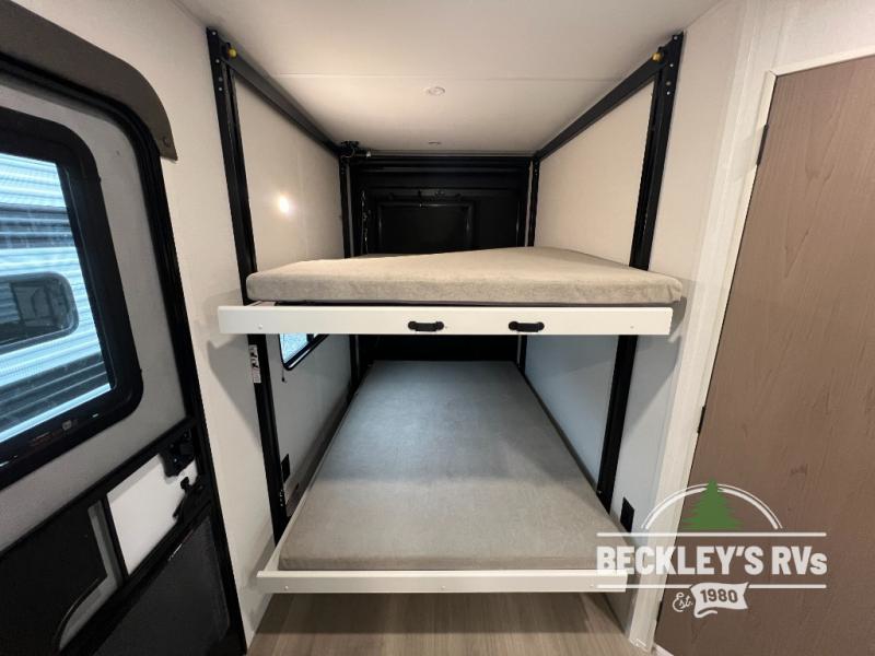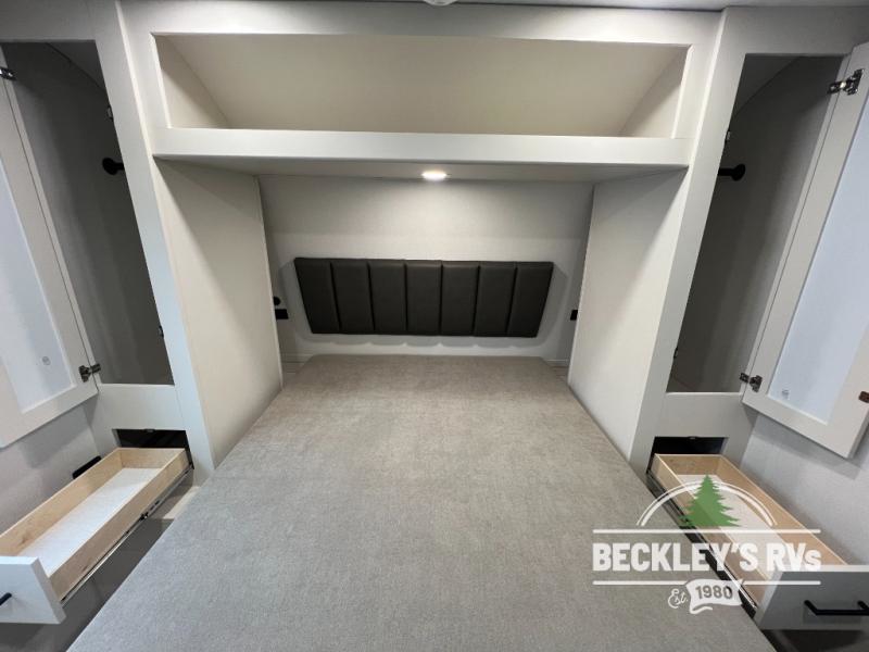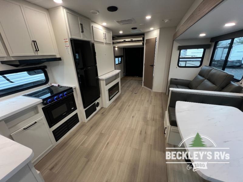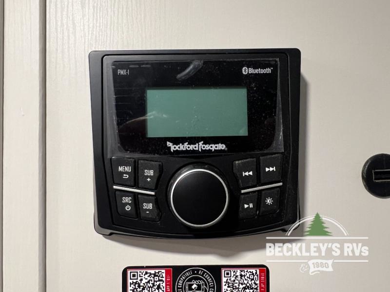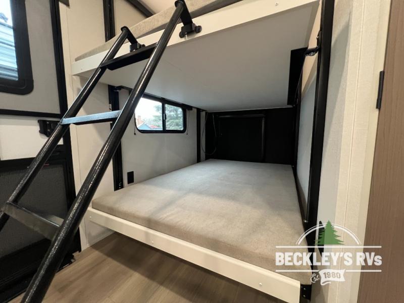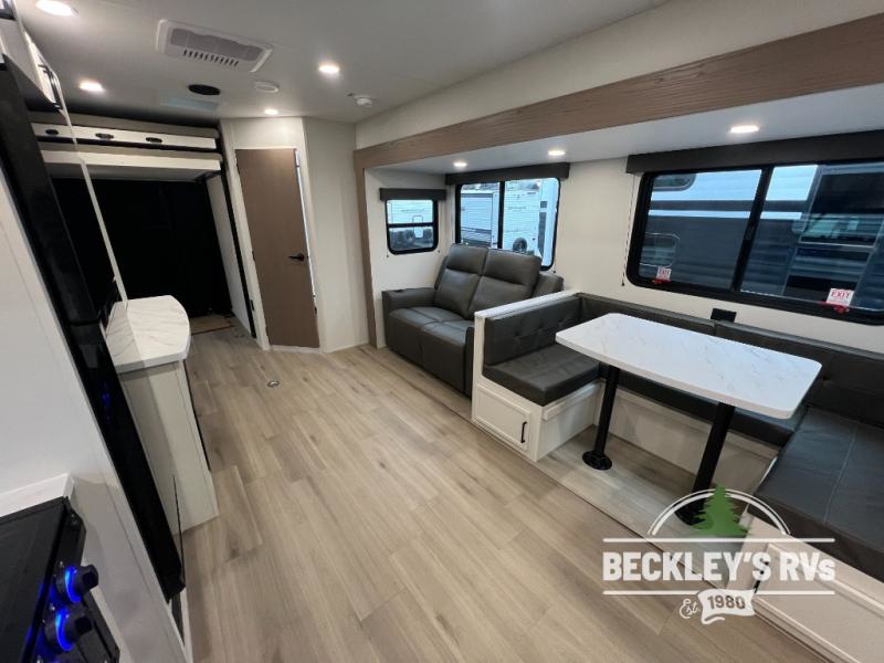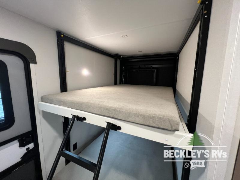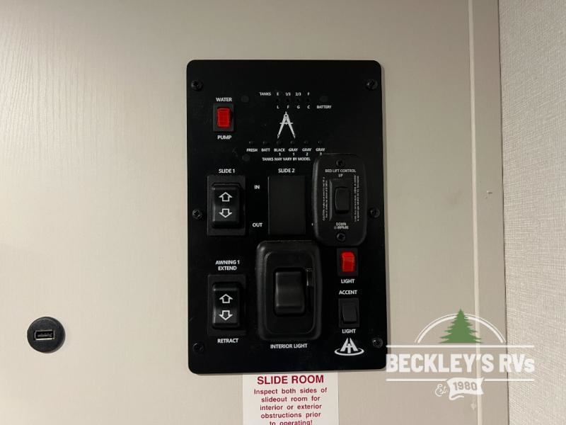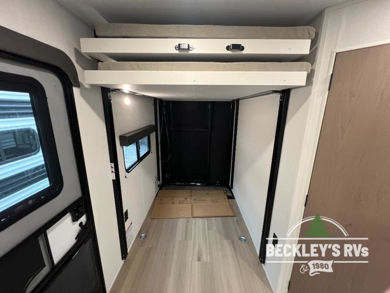 The spacious garage area is perfect for hauling your favorite toys, and the two entry/exit doors make it easy to get in and out. The front bedroom is a peaceful retreat, featuring a queen bed, wardrobes, and plenty of storage for your gear. Further in the heart of this unit, the U-shaped dinette is perfect for enjoying meals or game nights, and the pull-out trash makes cleanup a breeze. The kitchen is equipped with a microwave and 8 cu refrigerator, so you can fuel up for your next adventure. The theater seating is perfect for movie nights or catching up on your favorite shows, and the electric Happijac bunks provide a comfortable spot to rest. The full bathroom is a refreshing oasis, equipped with everything you need to start your day feeling revitalized.