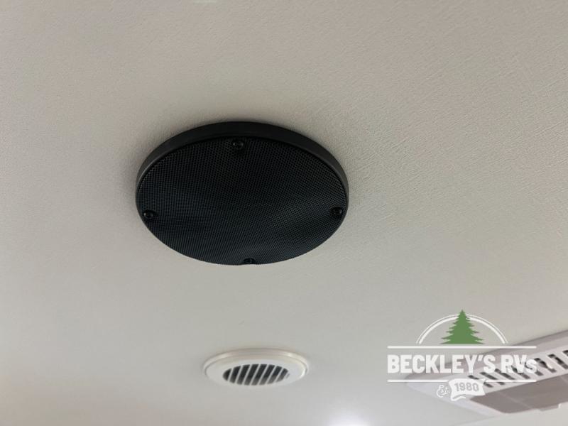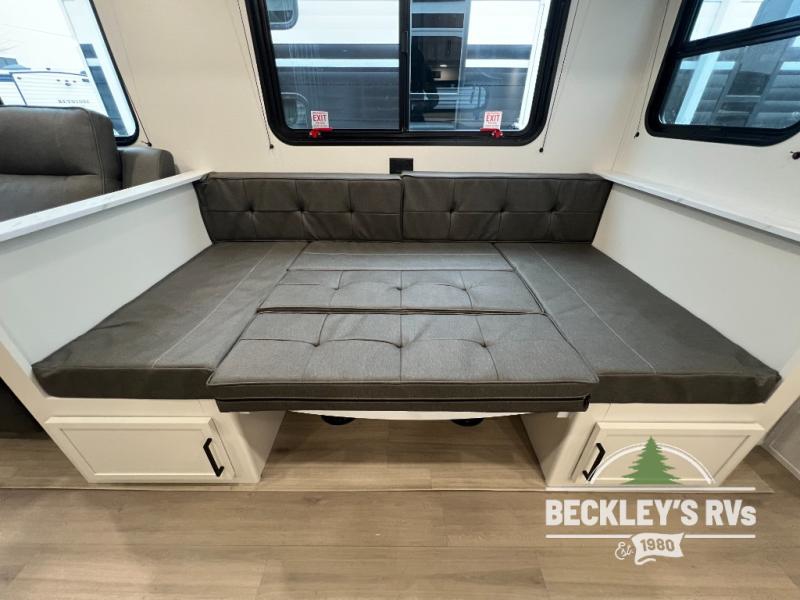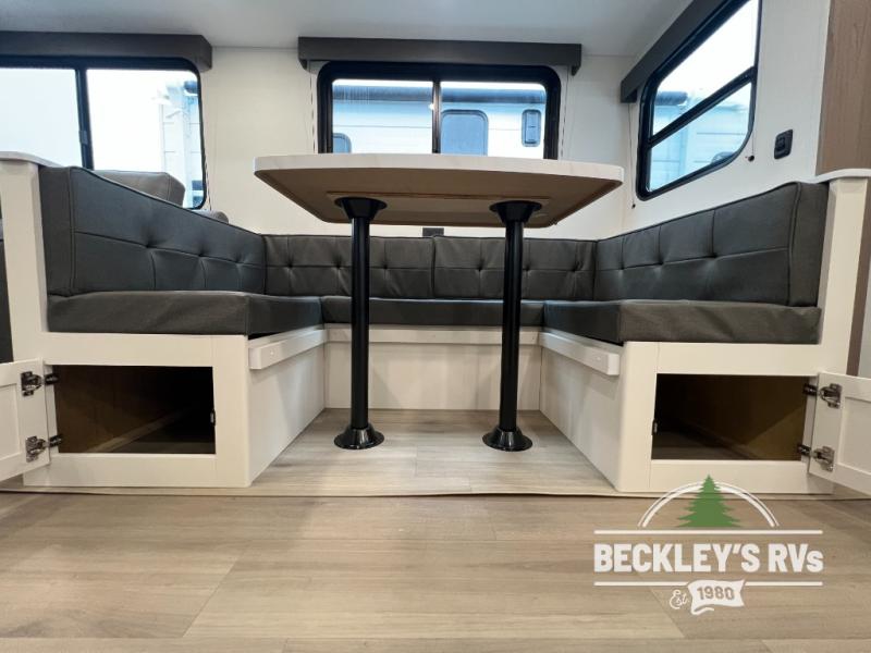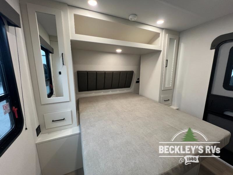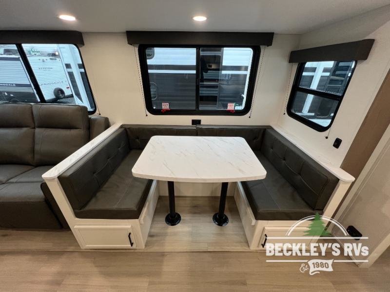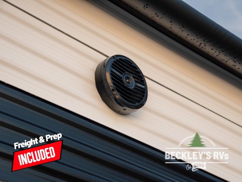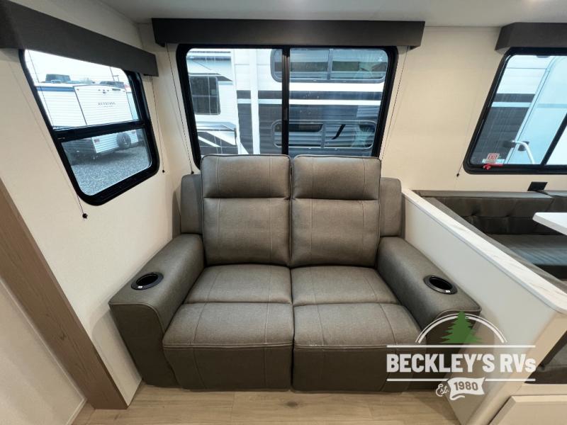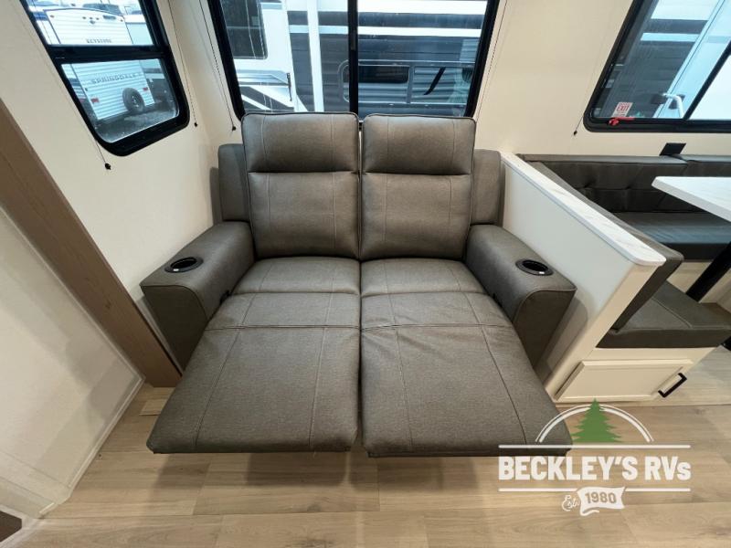 The spacious garage area is perfect for hauling your favorite toys, and the two entry/exit doors make it easy to get in and out. The front bedroom is a peaceful retreat, featuring a queen bed, wardrobes, and plenty of storage for your gear. Further in the heart of this unit, the U-shaped dinette is perfect for enjoying meals or game nights, and the pull-out trash makes cleanup a breeze. The kitchen is equipped with a microwave and 8 cu refrigerator, so you can fuel up for your next adventure. The theater seating is perfect for movie nights or catching up on your favorite shows, and the electric Happijac bunks provide a comfortable spot to rest. The full bathroom is a refreshing oasis, equipped with everything you need to start your day feeling revitalized.