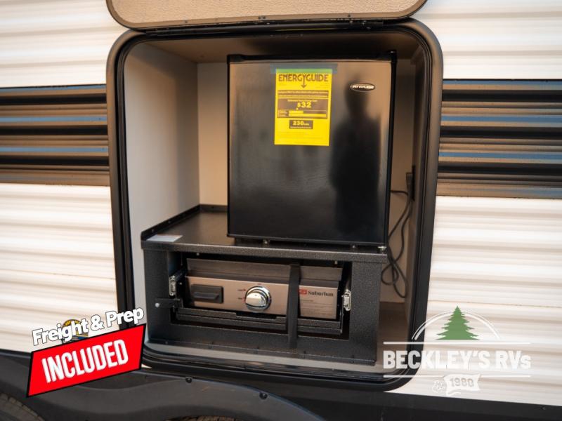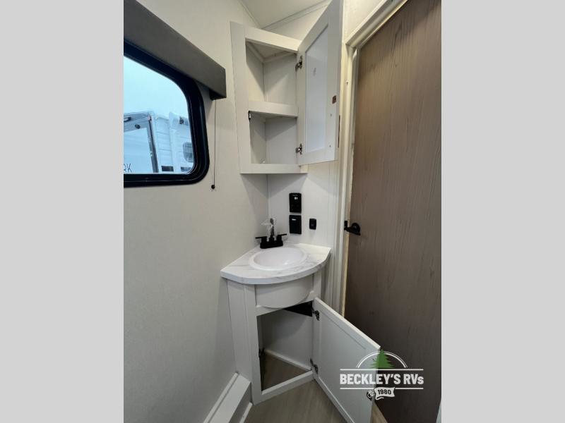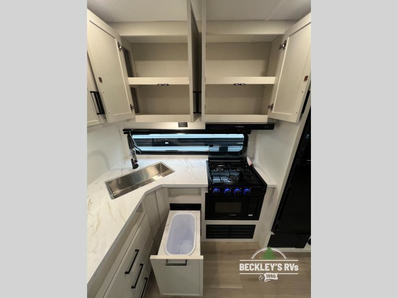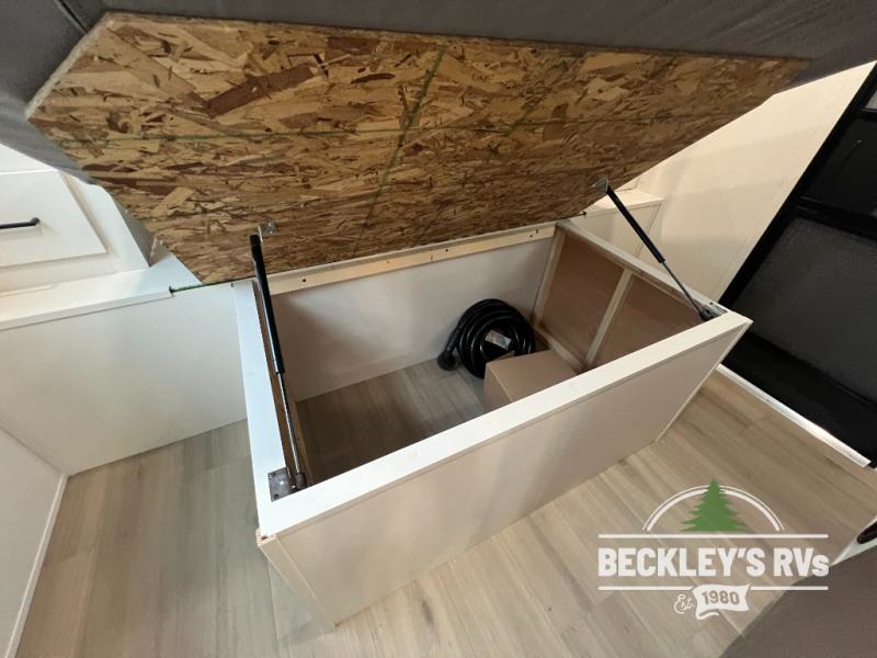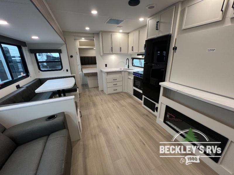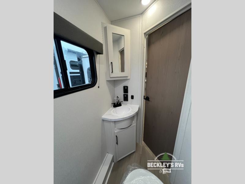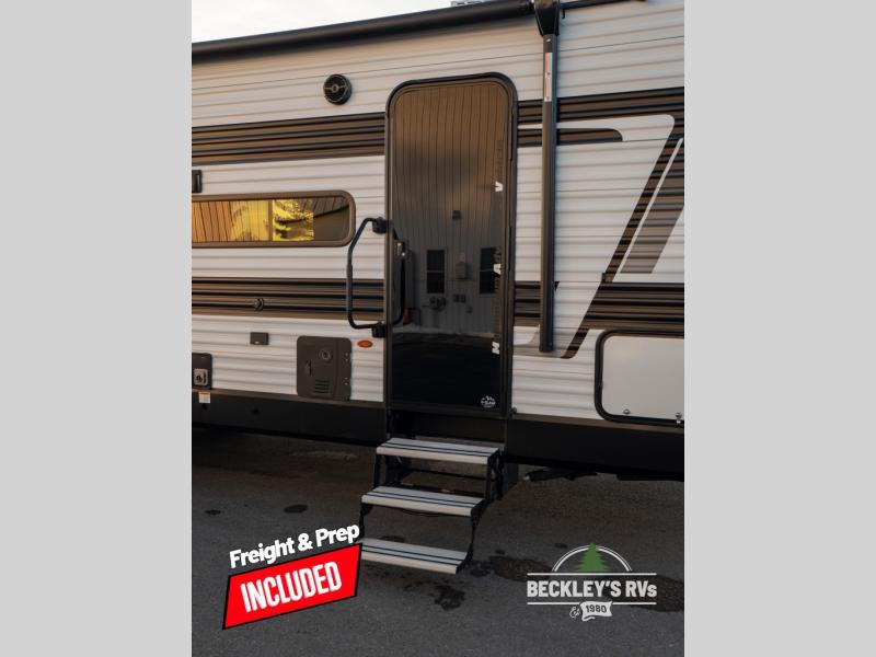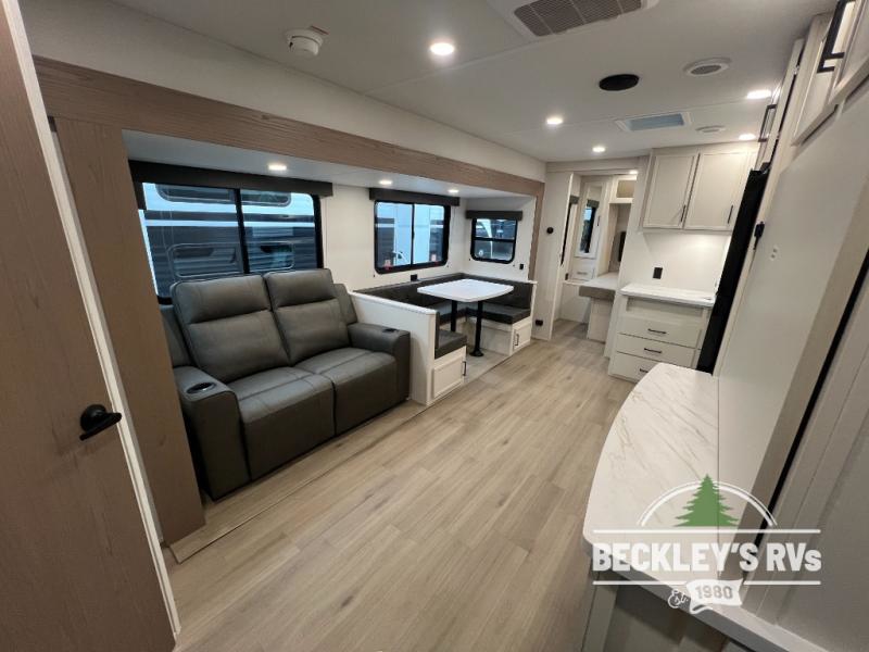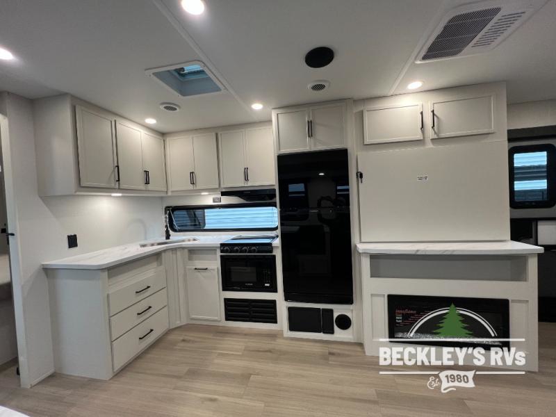 The spacious garage area is perfect for hauling your favorite toys, and the two entry/exit doors make it easy to get in and out. The front bedroom is a peaceful retreat, featuring a queen bed, wardrobes, and plenty of storage for your gear. Further in the heart of this unit, the U-shaped dinette is perfect for enjoying meals or game nights, and the pull-out trash makes cleanup a breeze. The kitchen is equipped with a microwave and 8 cu refrigerator, so you can fuel up for your next adventure. The theater seating is perfect for movie nights or catching up on your favorite shows, and the electric Happijac bunks provide a comfortable spot to rest. The full bathroom is a refreshing oasis, equipped with everything you need to start your day feeling revitalized.