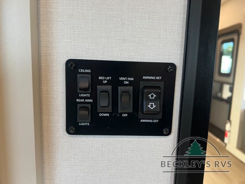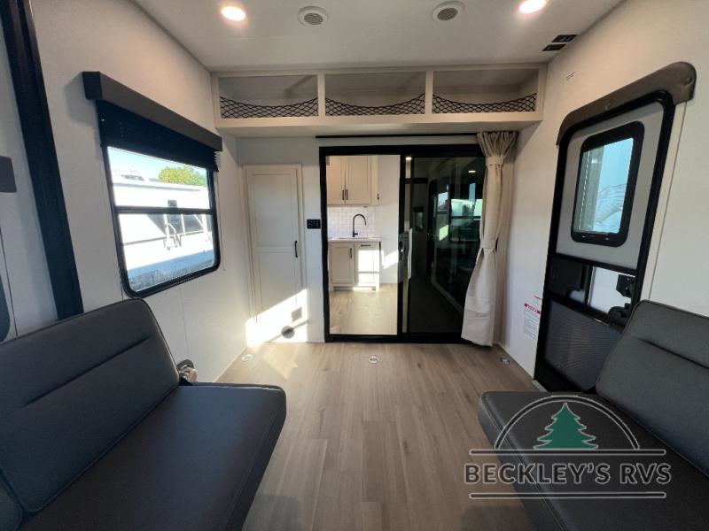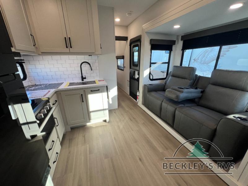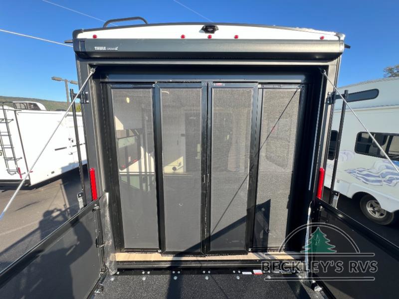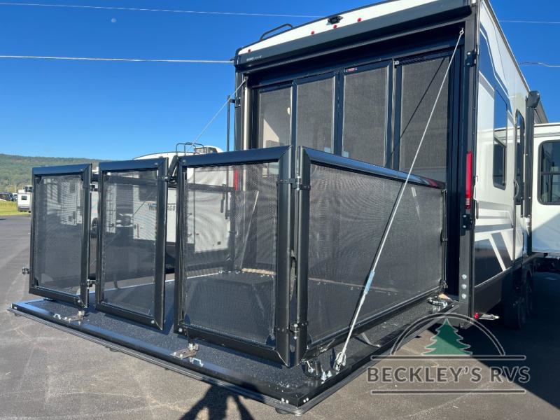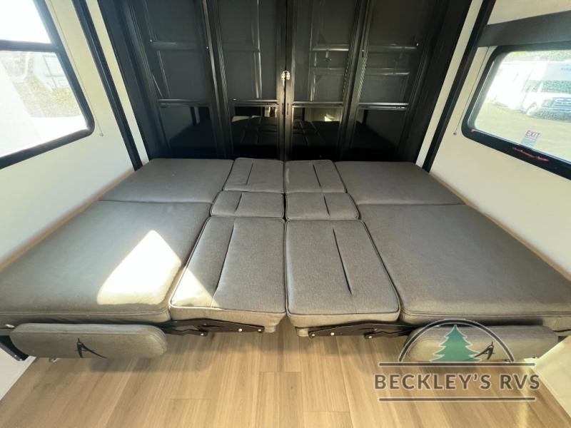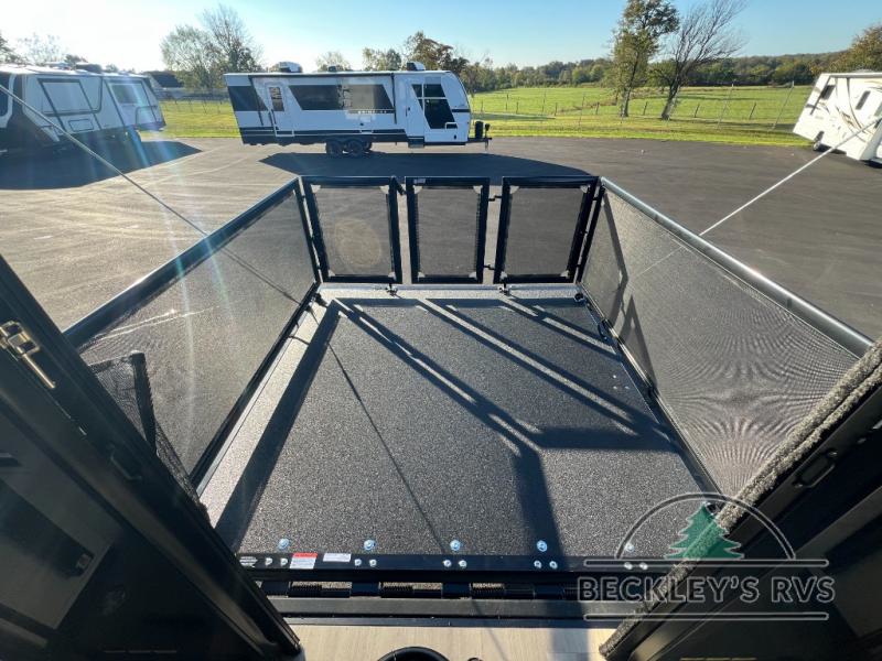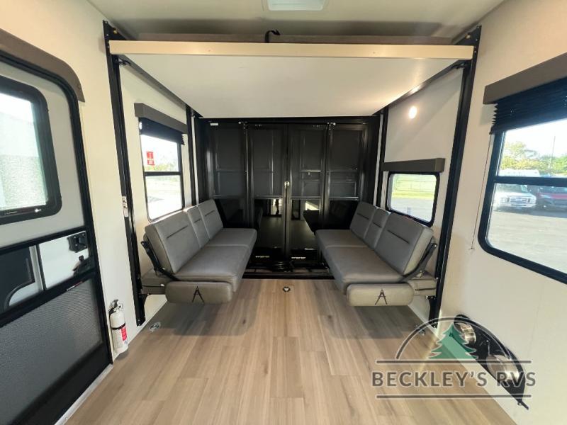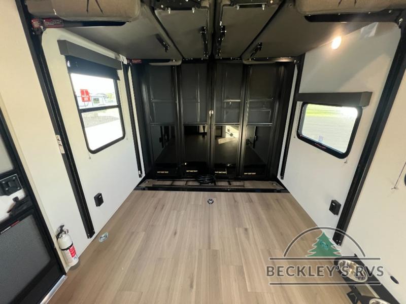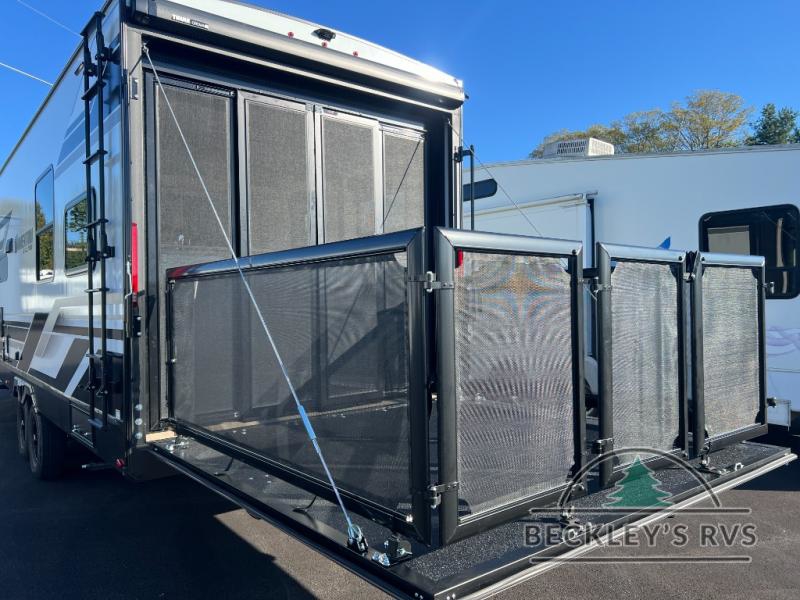 Start your engines for a fun weekend with your toys and your family in this Momentum G-Class toy hauler. The 11' separate garage includes Happi-Jac rollover sofas with a table and an optional top bed, plus a flip-up pet dish for your furry friends! There is even a second entry door which leads directly into the garage so that you don't have to walk through the entire trailer just to get to your cargo. In the front of this unit, you will have your own master suite that has private access to the residential walk-in shower in the dual-entry bathroom. The main living and kitchen area offers everything you need and would want, including theater seating and a TV with storage above the refrigerator!