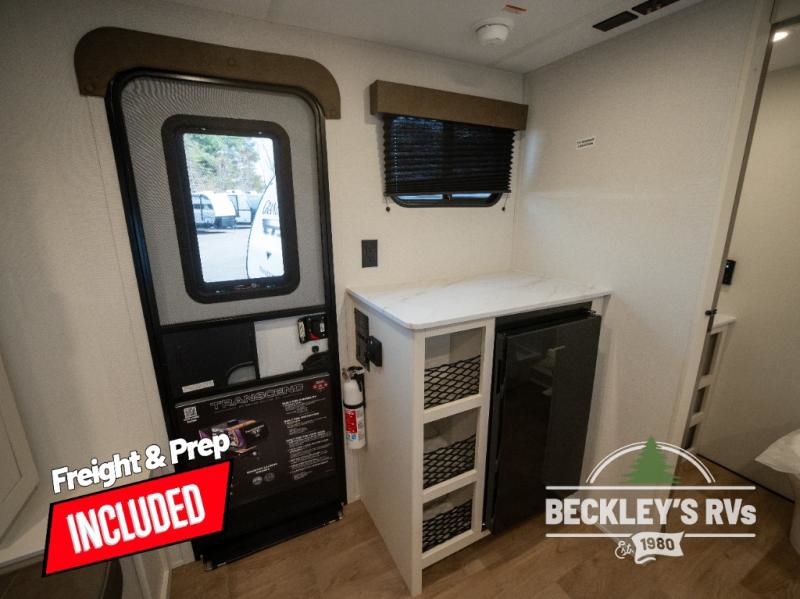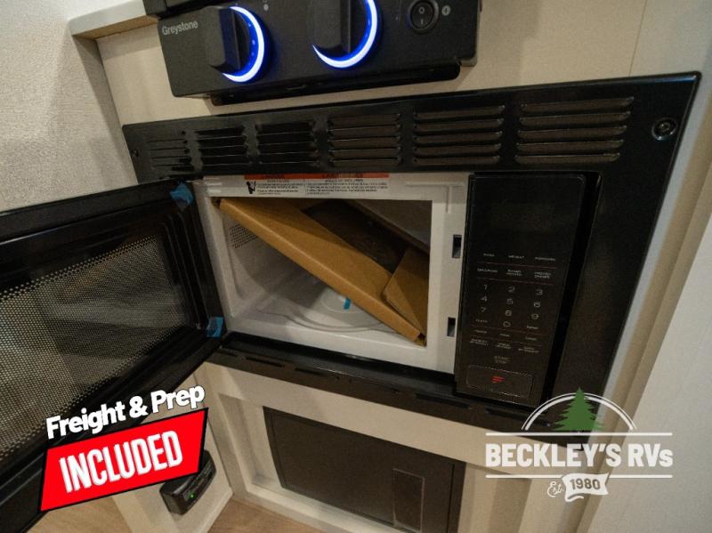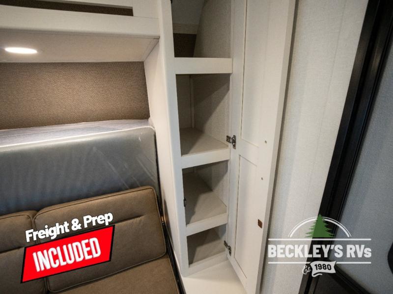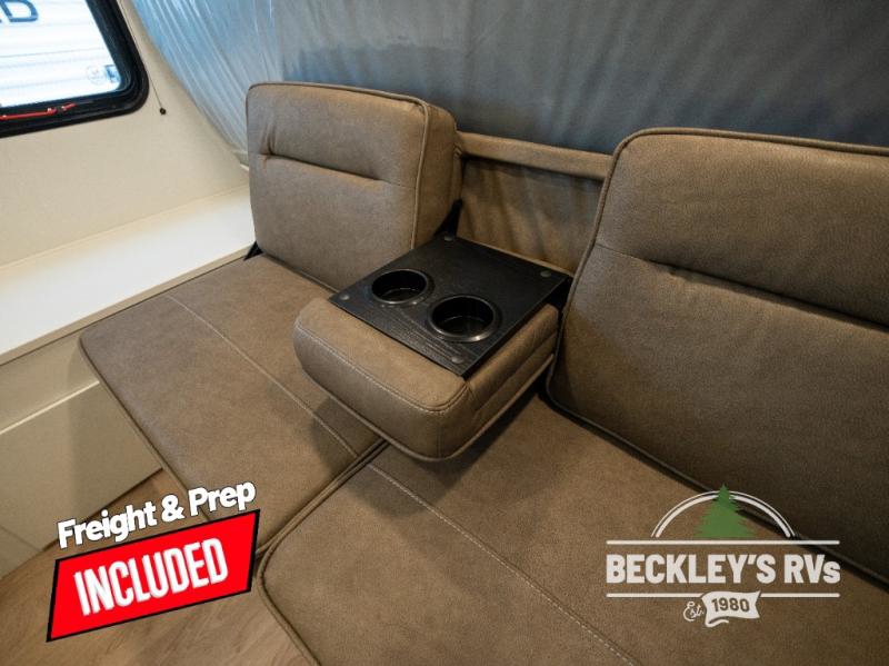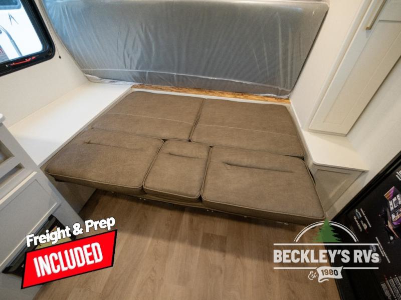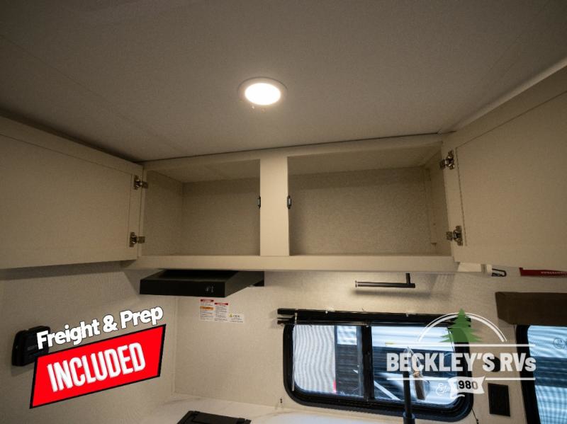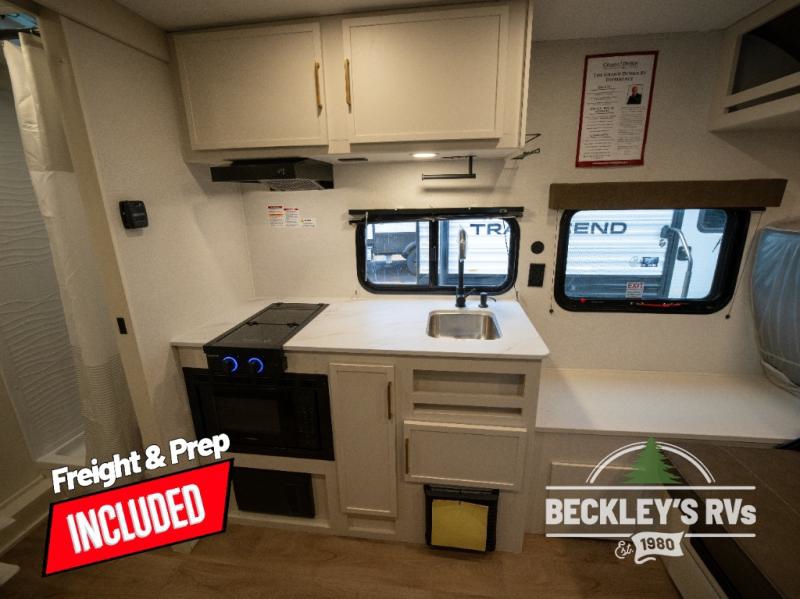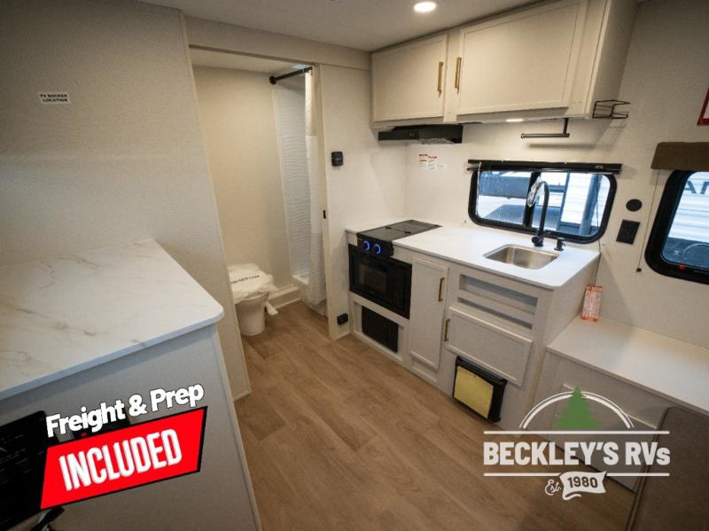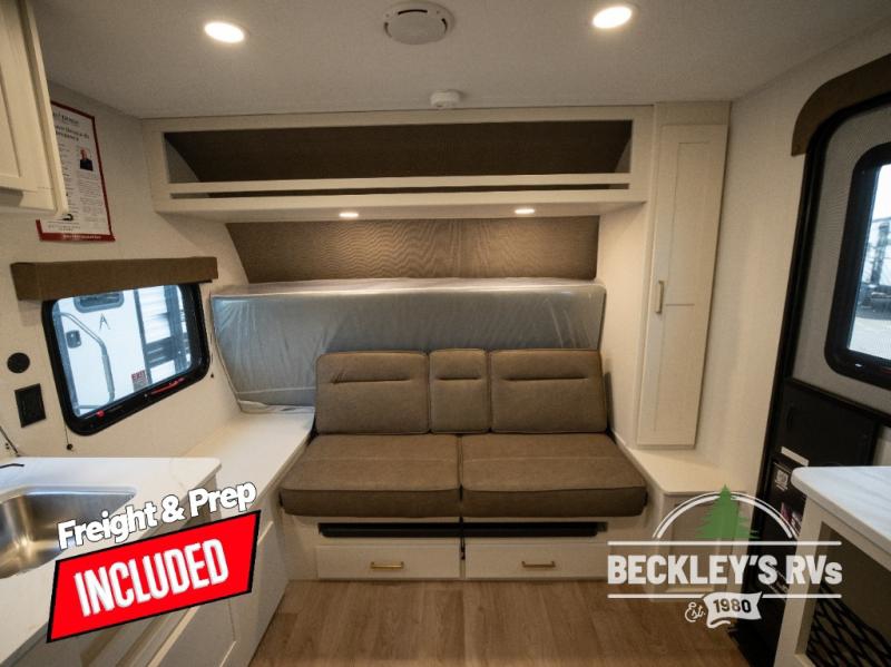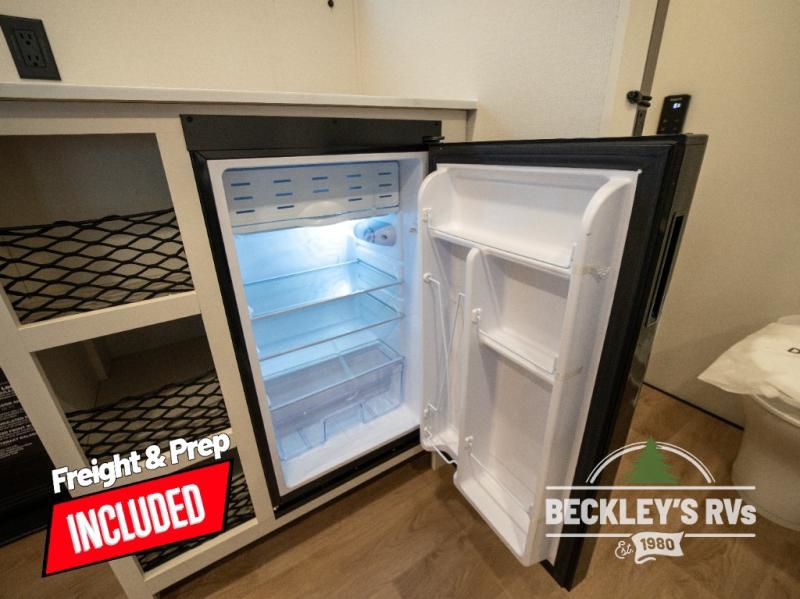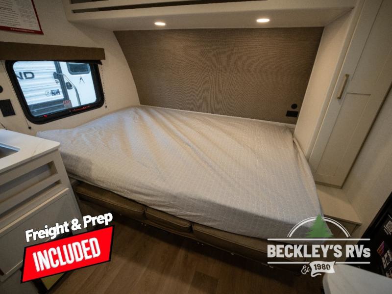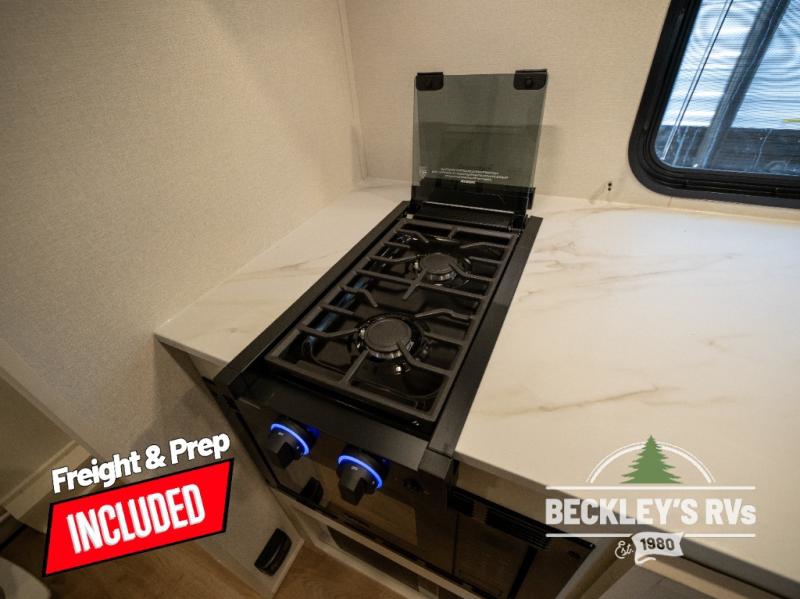 Travel in this model and step inside through the sturdy aluminum entry steps and you'll be greeted by a versatile 60" x 80" Murphy bed that doubles as a comfortable seating area during the day. In the center, the kitchen offers all the essentials for preparing a delicious meal, featuring a microwave, 2-burner range, 3.3 cu. ft. refrigerator, and overhead cabinets for added storage. At the rear, enjoy the convenience of a full bathroom complete with a walk-in shower and foot-flush toilet, making life on the road both comfortable and functional.