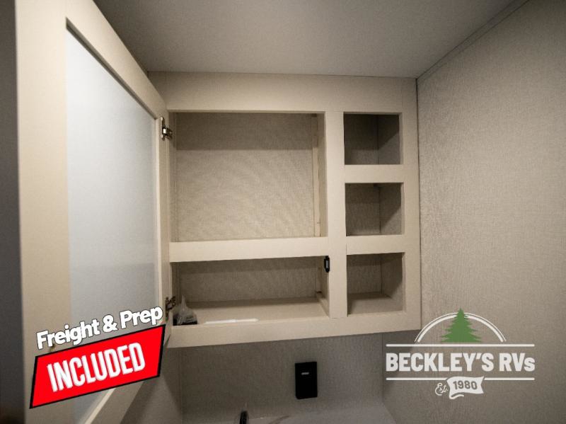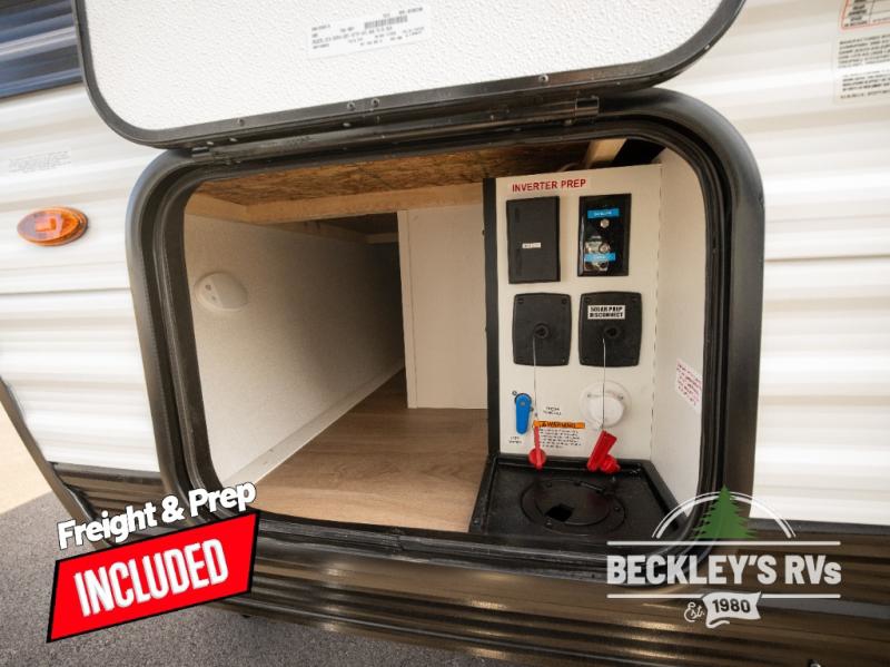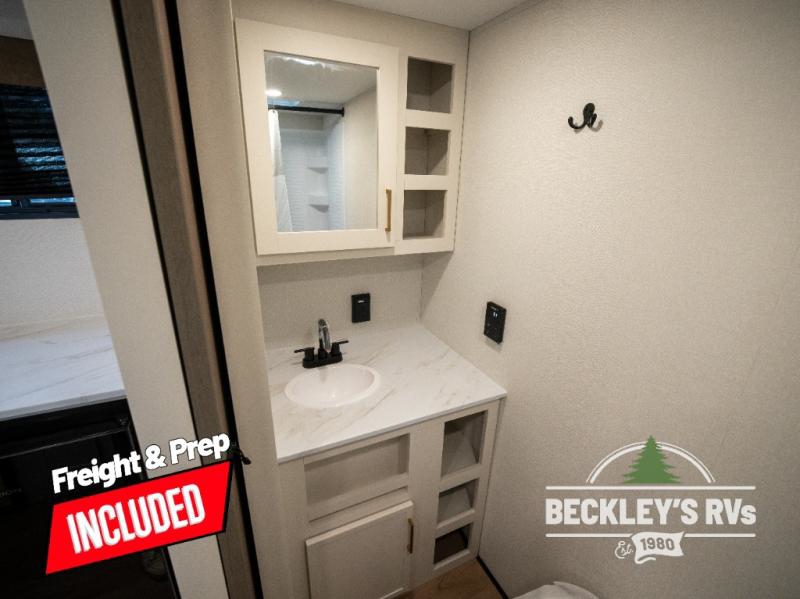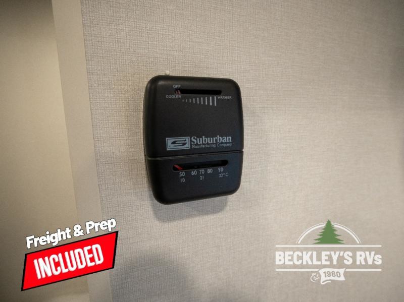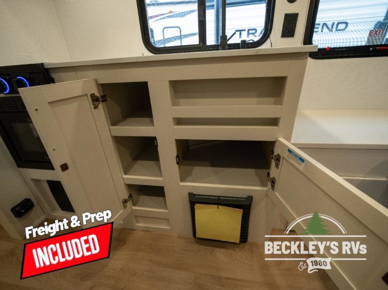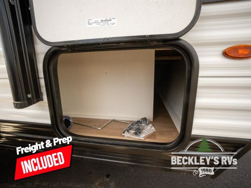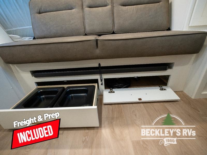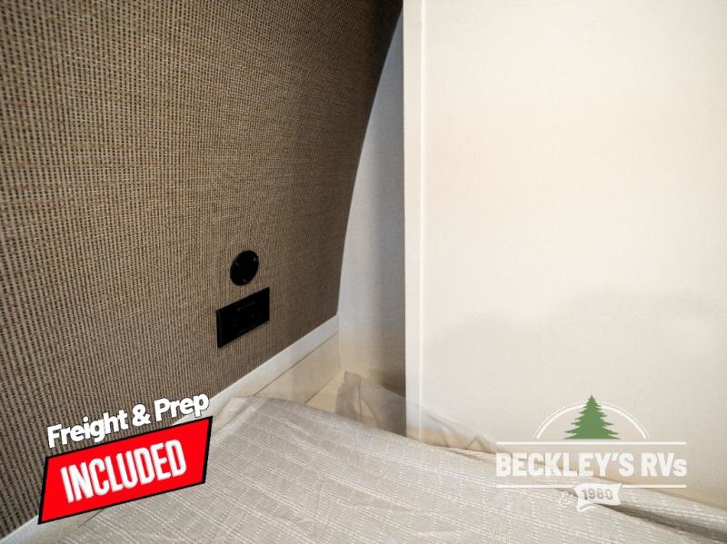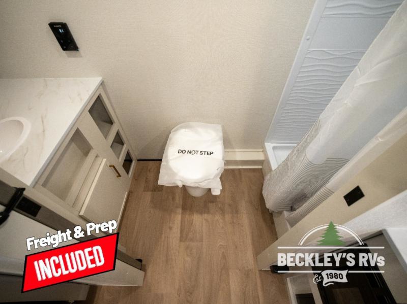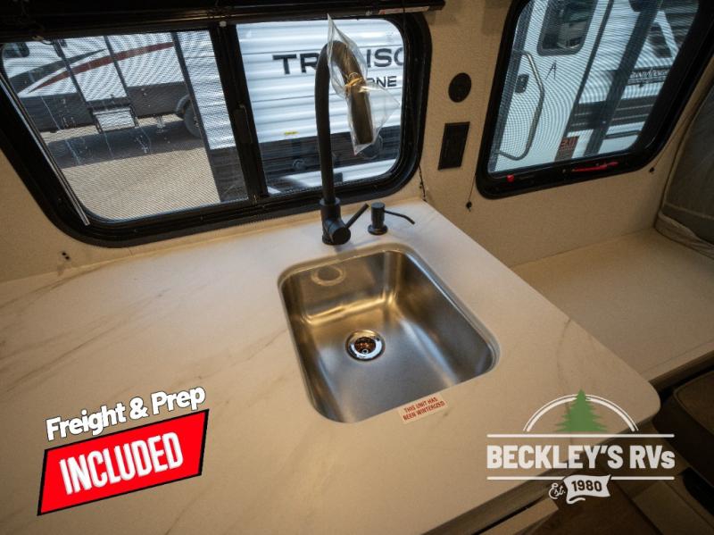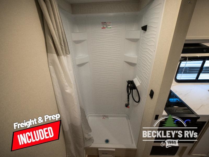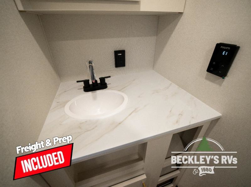 Travel in this model and step inside through the sturdy aluminum entry steps and you'll be greeted by a versatile 60" x 80" Murphy bed that doubles as a comfortable seating area during the day. In the center, the kitchen offers all the essentials for preparing a delicious meal, featuring a microwave, 2-burner range, 3.3 cu. ft. refrigerator, and overhead cabinets for added storage. At the rear, enjoy the convenience of a full bathroom complete with a walk-in shower and foot-flush toilet, making life on the road both comfortable and functional.