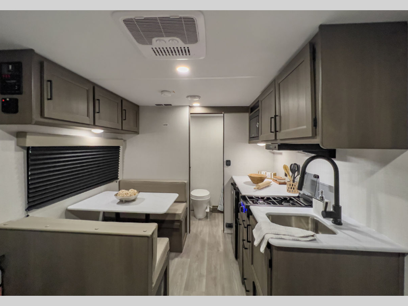 With any Transcend One travel trailer by Grand Design, you will enjoy lightweight towing thanks to their single-axle. There are many interior comforts to make camping easier than ever, such as recessed lighting, residential countertops, and a 6' 6" interior height. Each model is constructed with a heated and enclosed underbelly with suspended tanks, a moisture barrier floor enclosure, and Thermofoil over the roof and front cap for added protection. And a JBL sound system will let you listen to tunes as you visit under the power awning with a Fusion light!