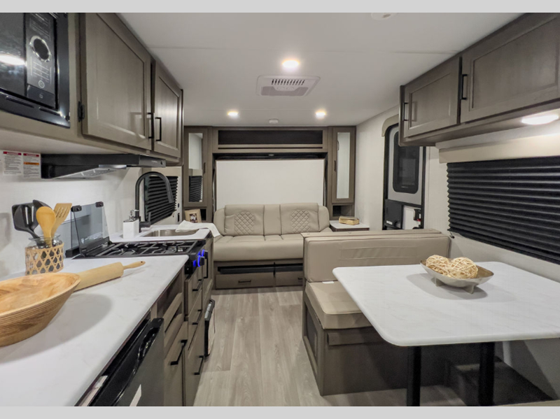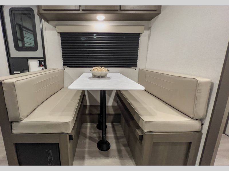 This is the perfect couple's trailer with versatile seating and sleeping space! You'll find a queen-size Murphy bed up front with storage space beside and above plus a full rear bath for added privacy. Once you've made lunch in the full kitchen, you can dine at the booth dinette, or take your plate outdoors to sit under the 10' power awning. You'll also find an unobstructed pass-thru storage outside that will be perfect for fishing poles, lawn chairs, tools and more!