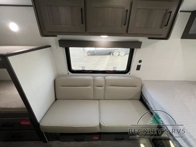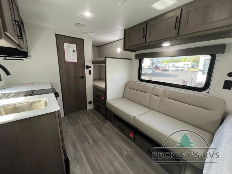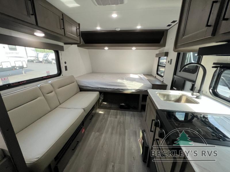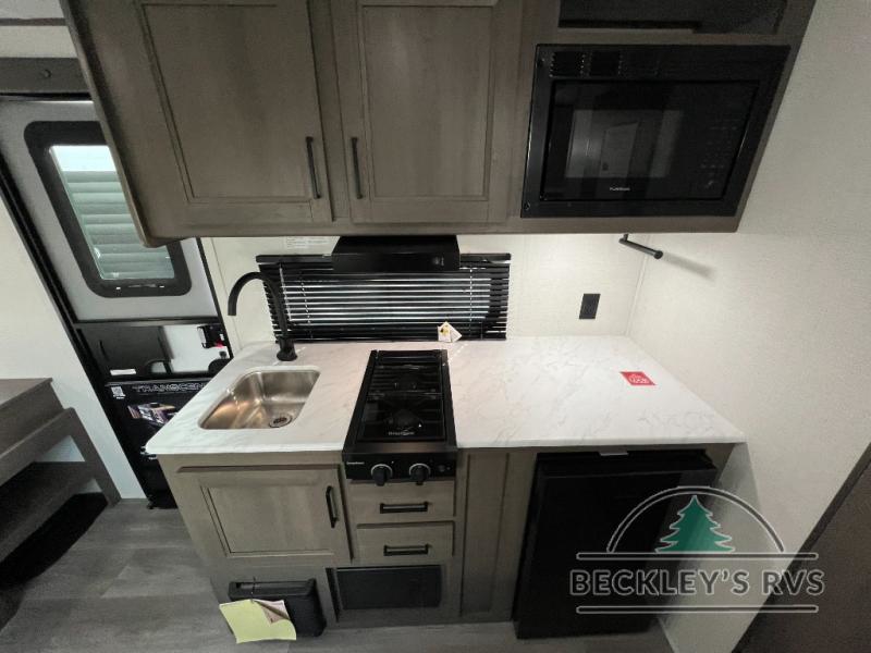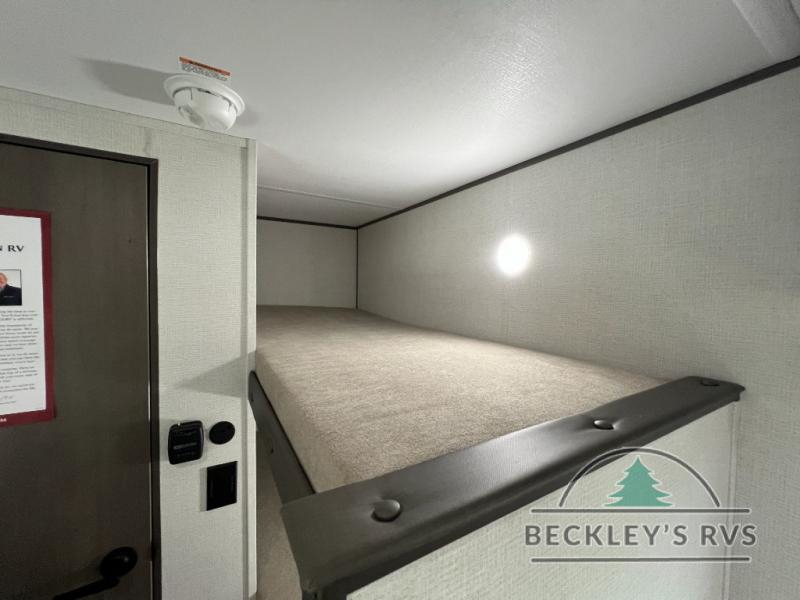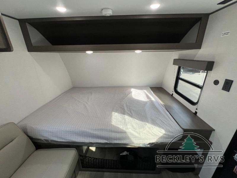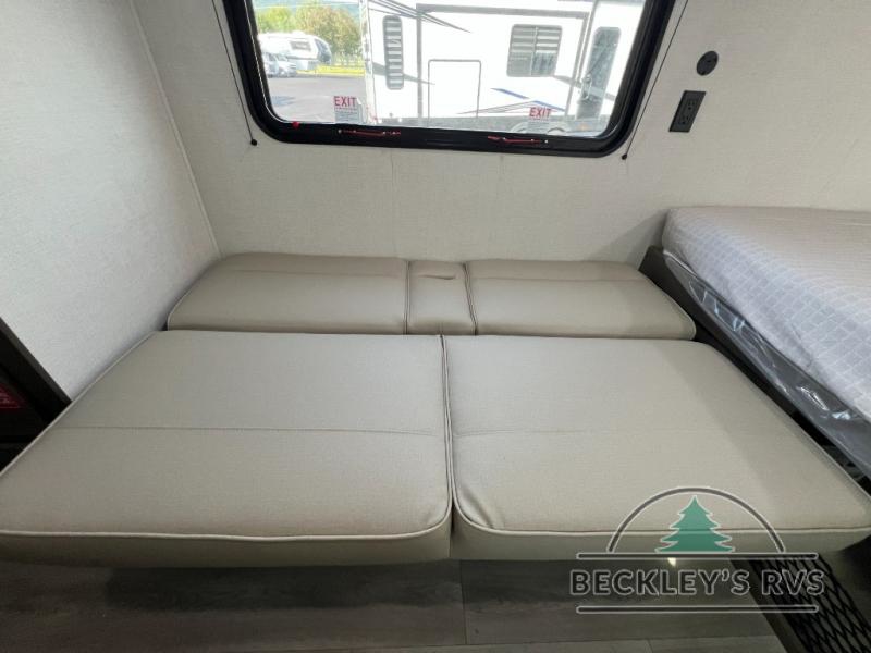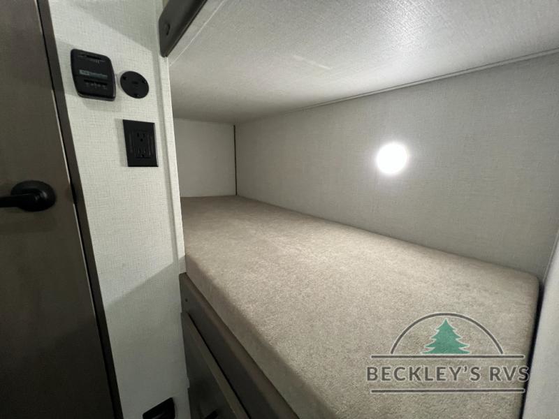Camping trips to the lake have never been easier than with this travel trailer! The 28" x 67" bunks are right next to the private bath for easy nighttime use, and the front queen bed includes hidden storage for your things. There is also a 66" Jack knife sofa that provides a little more sleeping space for guests. A full kitchen lets you cook meals each day and there is an exterior LP quick connect if you want to fire up your own propane grill.