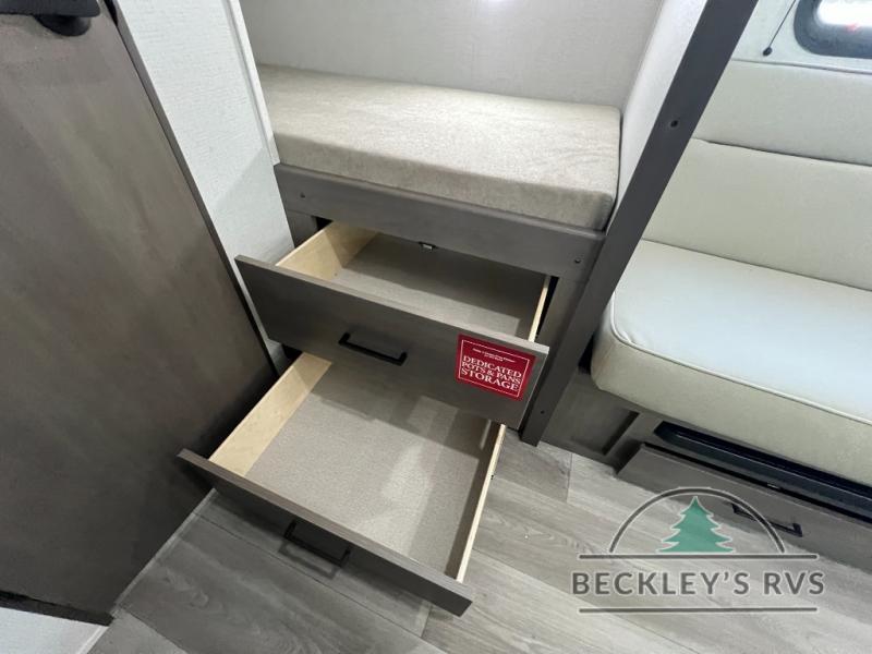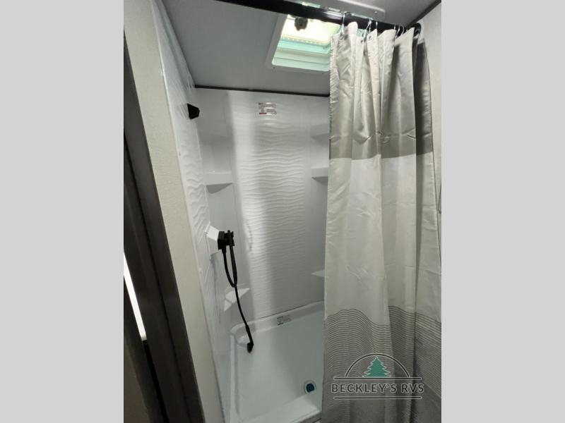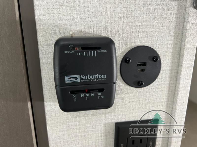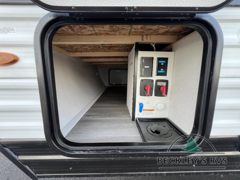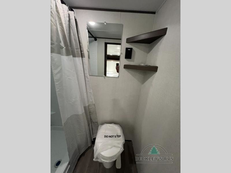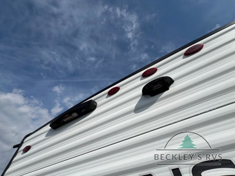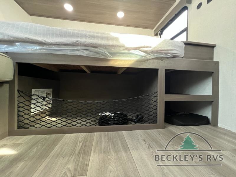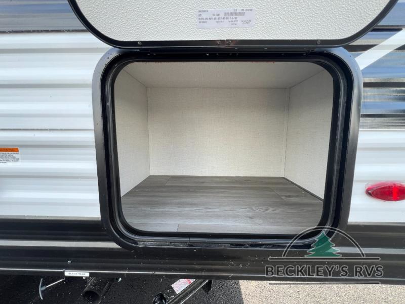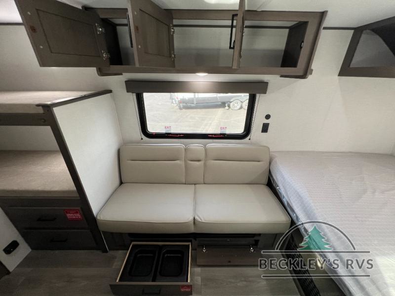 Camping trips to the lake have never been easier than with this travel trailer! The 28" x 67" bunks are right next to the private bath for easy nighttime use, and the front queen bed includes hidden storage for your things. There is also a 66" Jack knife sofa that provides a little more sleeping space for guests. A full kitchen lets you cook meals each day and there is an exterior LP quick connect if you want to fire up your own propane grill.