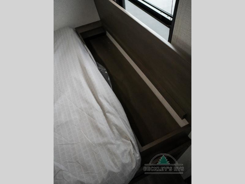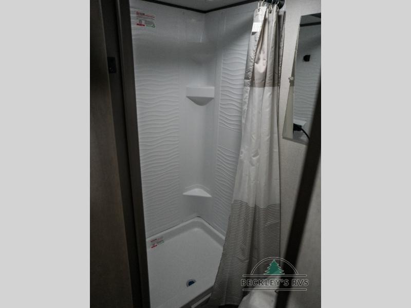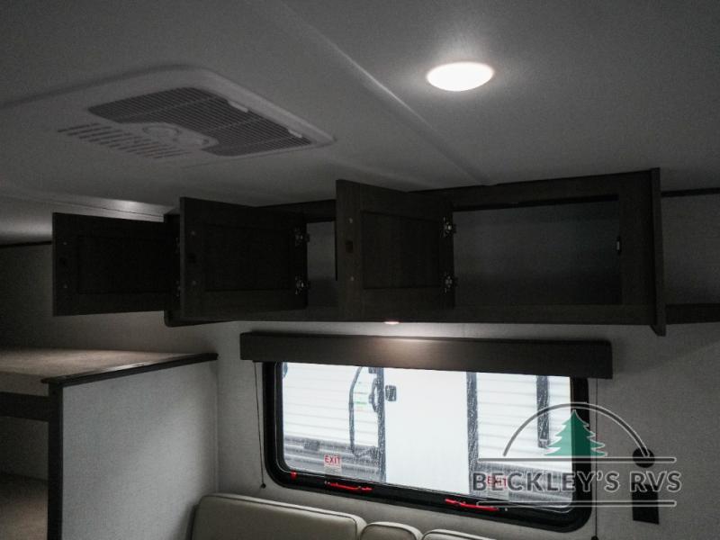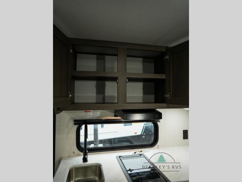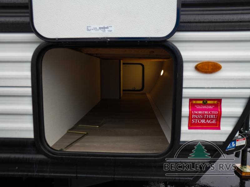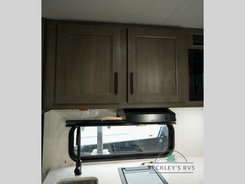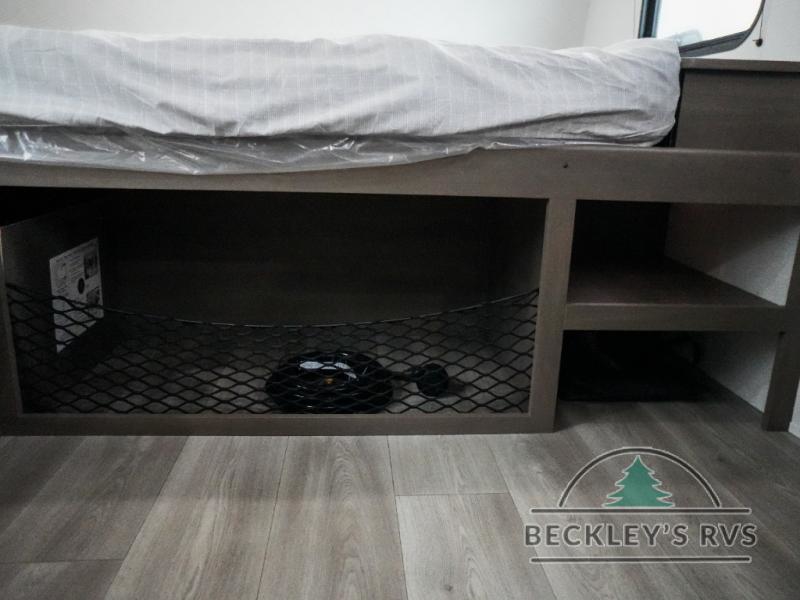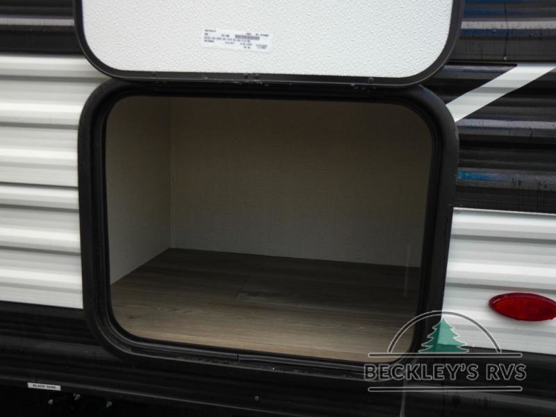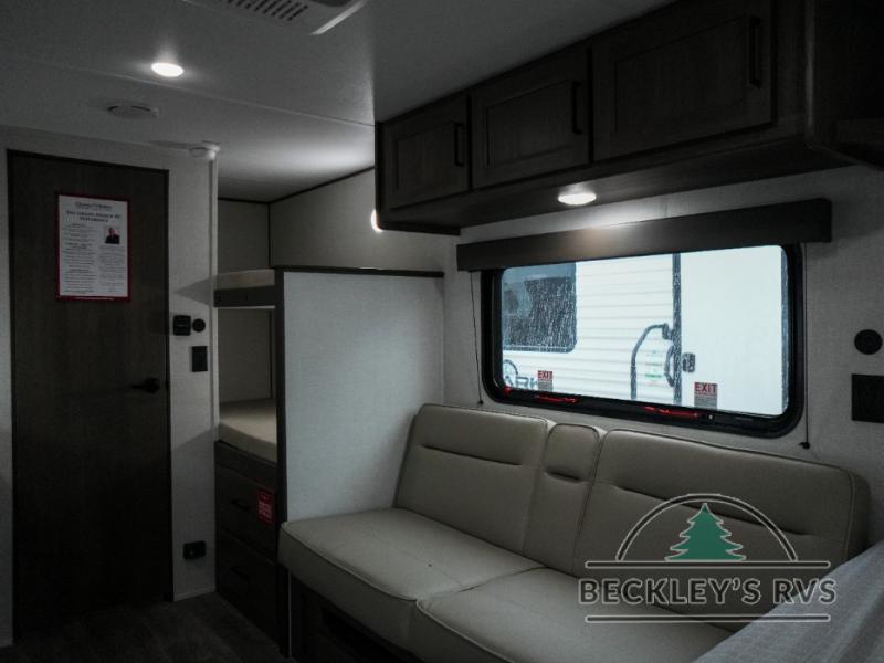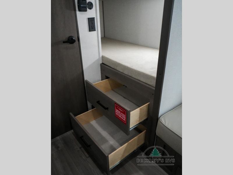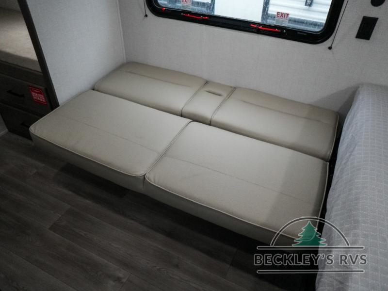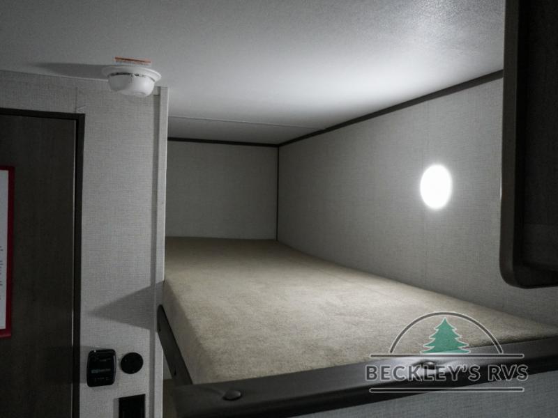 Camping trips to the lake have never been easier than with this travel trailer! The 28" x 67" bunks are right next to the private bath for easy nighttime use, and the front queen bed includes hidden storage for your things. There is also a 66" Jack knife sofa that provides a little more sleeping space for guests. A full kitchen lets you cook meals each day and there is an exterior LP quick connect if you want to fire up your own propane grill.