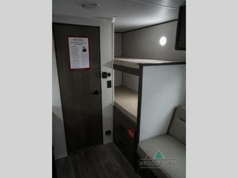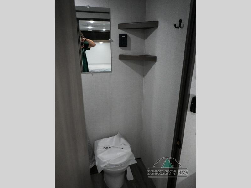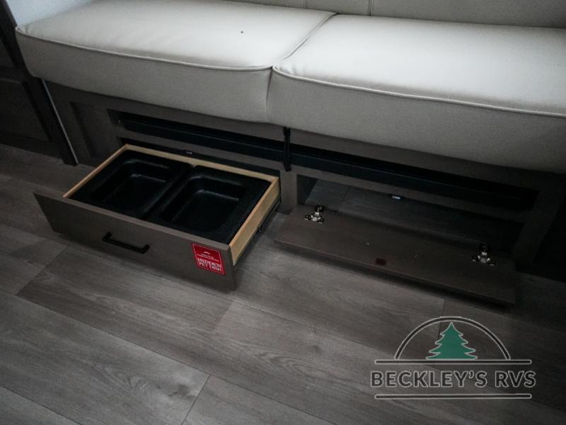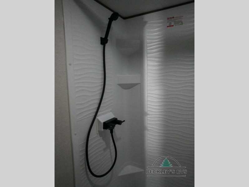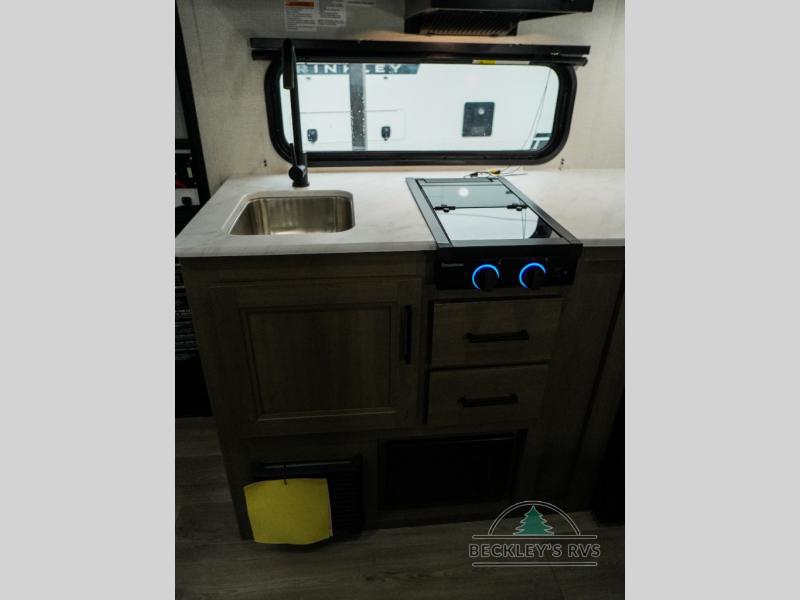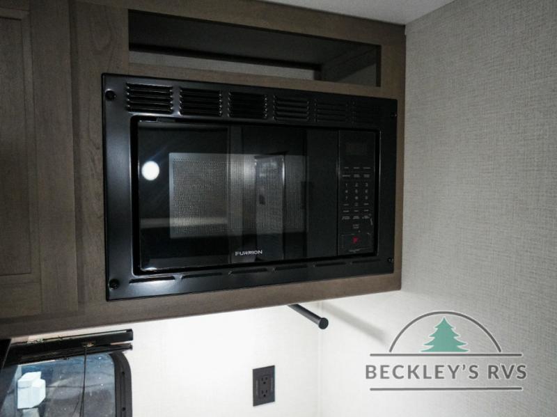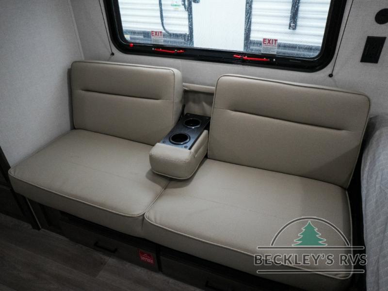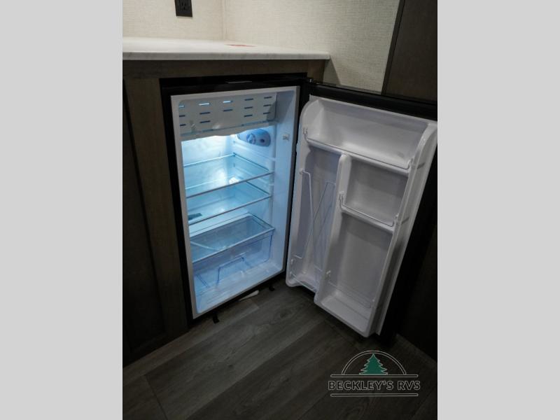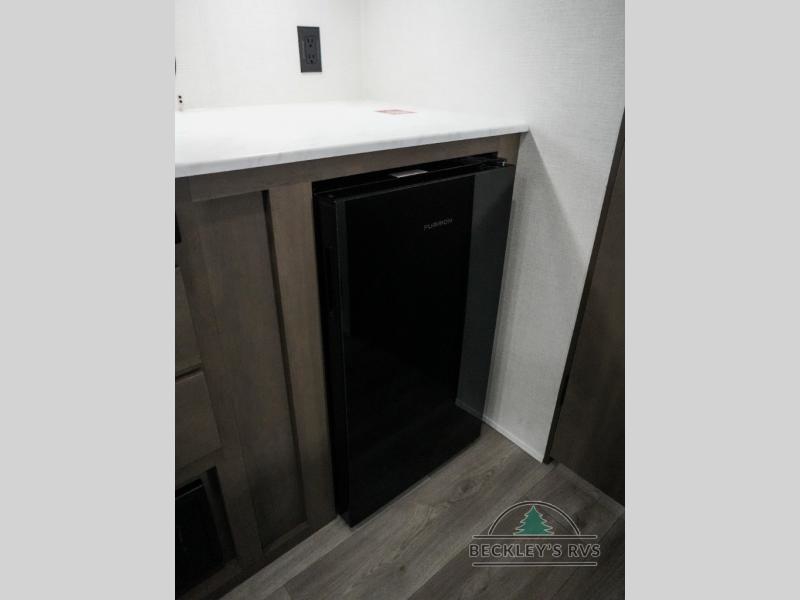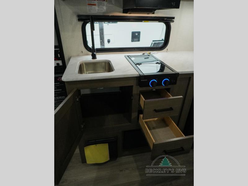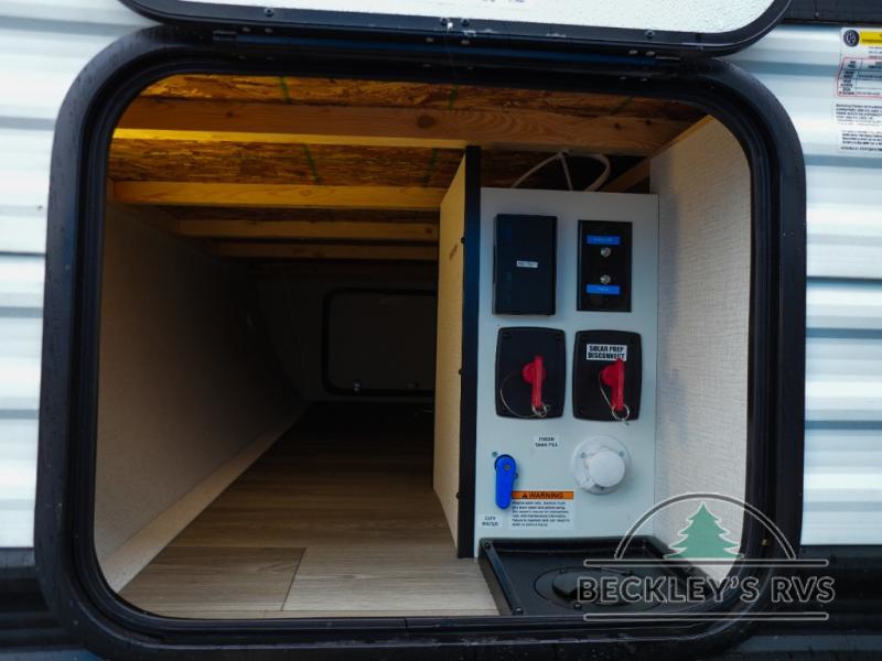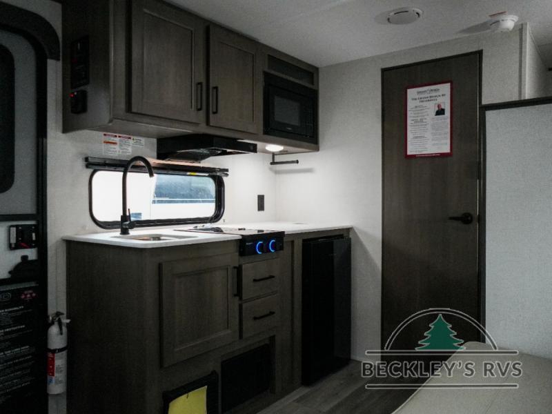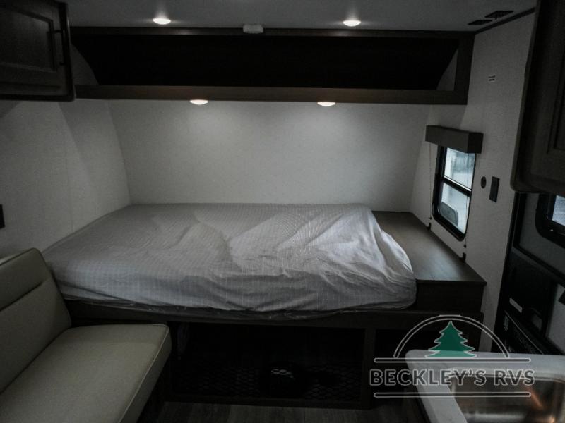 Camping trips to the lake have never been easier than with this travel trailer! The 28" x 67" bunks are right next to the private bath for easy nighttime use, and the front queen bed includes hidden storage for your things. There is also a 66" Jack knife sofa that provides a little more sleeping space for guests. A full kitchen lets you cook meals each day and there is an exterior LP quick connect if you want to fire up your own propane grill.