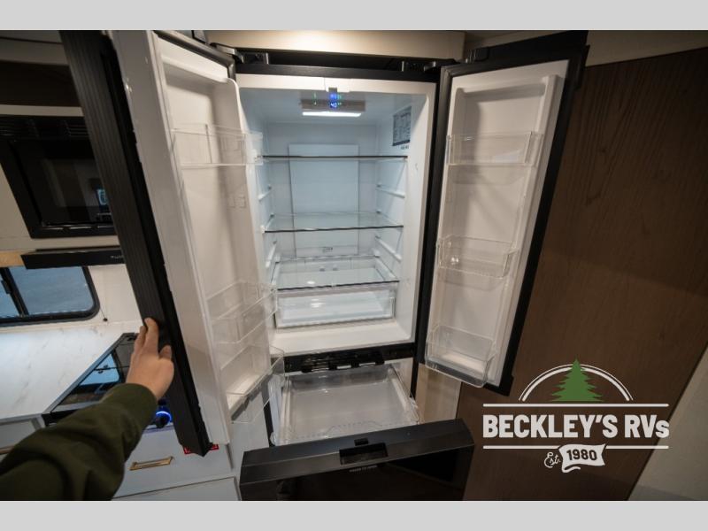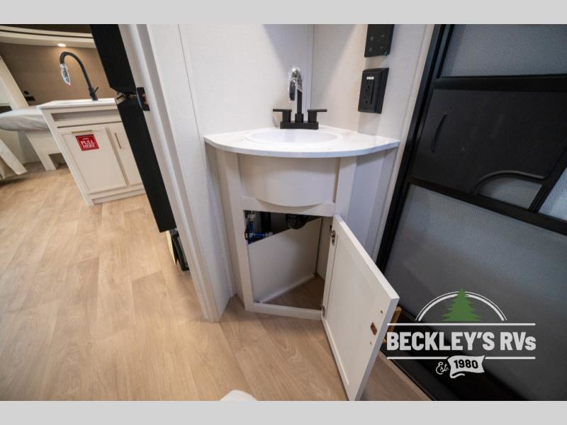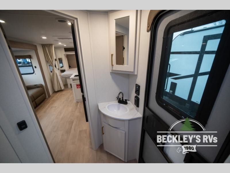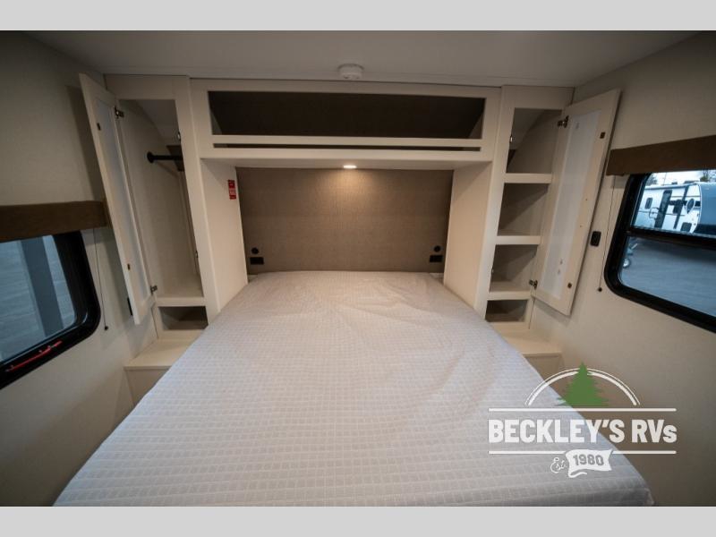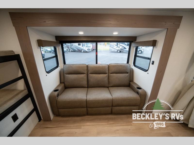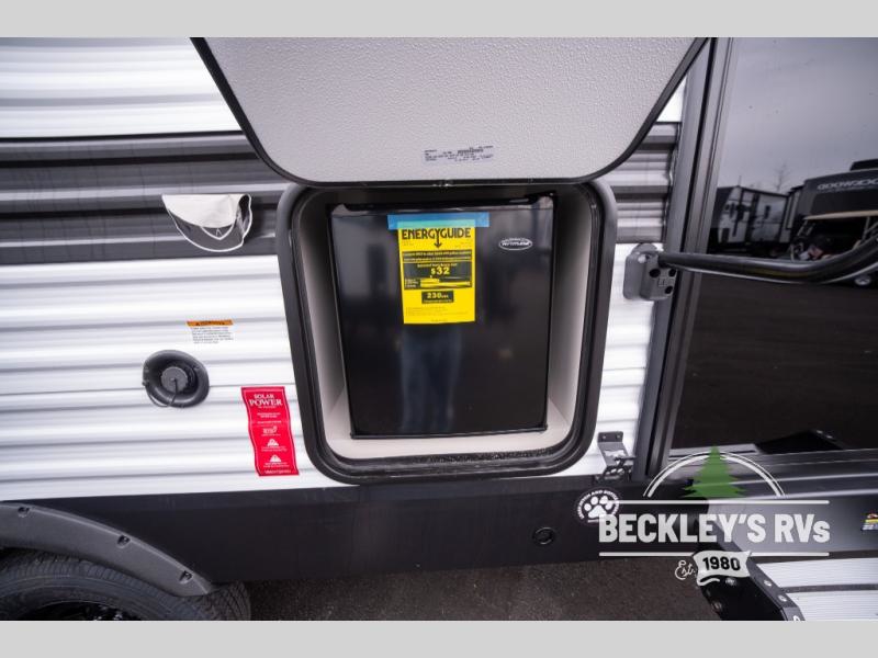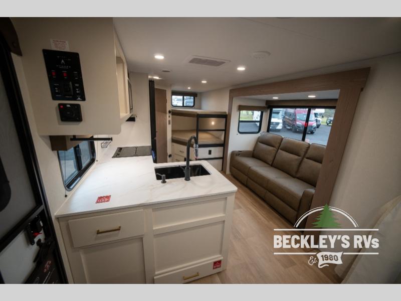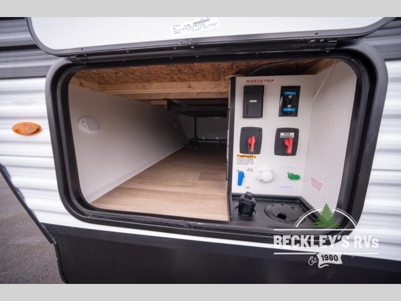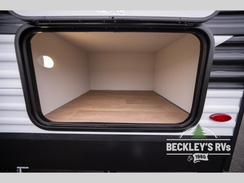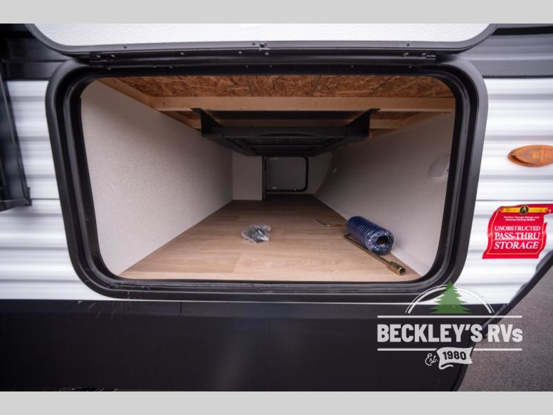 This fantastic travel trailer is designed to provide the ultimate in comfort, convenience, and adventure! The double-size bunk beds are perfect for kids, providing ample sleeping space and an under-bed storage space for all your belongings. The full bathroom features a linen closet, providing convenient storage for towels and toiletries. In the kitchen area, the U-shaped dinette is a great spot for creating memories that will last a lifetime, the refrigerator keeps your food and drinks fresh, while the microwave provides a quick and easy way to prepare meals. And for major convenience, the pull-out trash makes cleaning up a simple task. Take a nap in the comfortable front queen bed, which is a serene retreat, providing a comfortable spot to rest and relax. Jump to the exterior in a comfortable way with the double entry/exit door providing added convenience and flexibility, while the exterior awning provides shade and protection from the elements. The pass-through storage offers ample space for your outdoor gear and equipment.