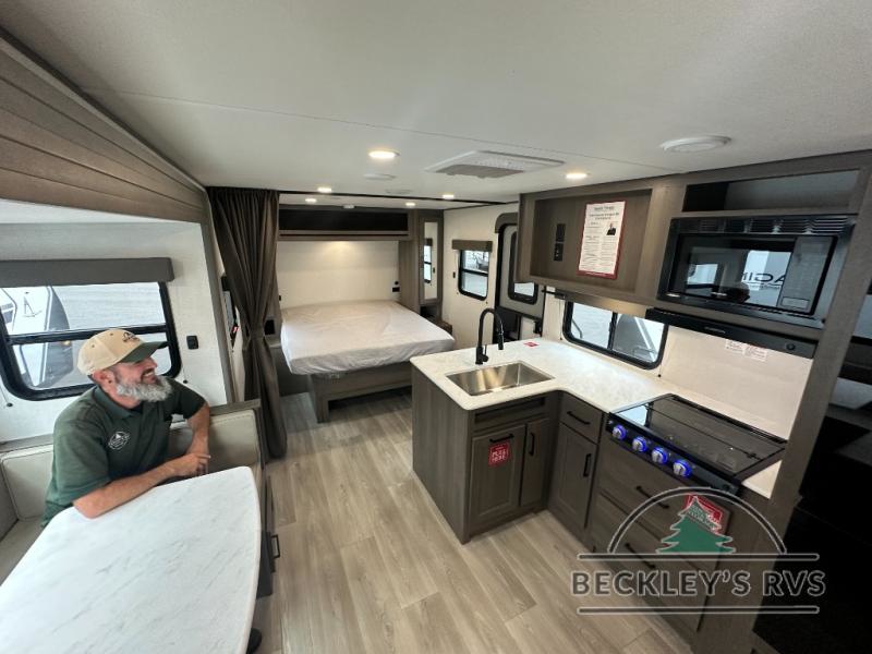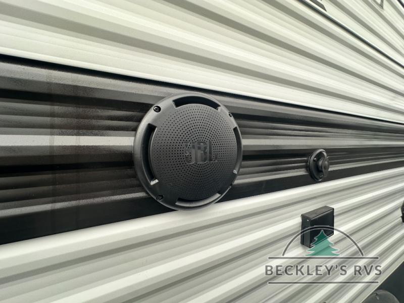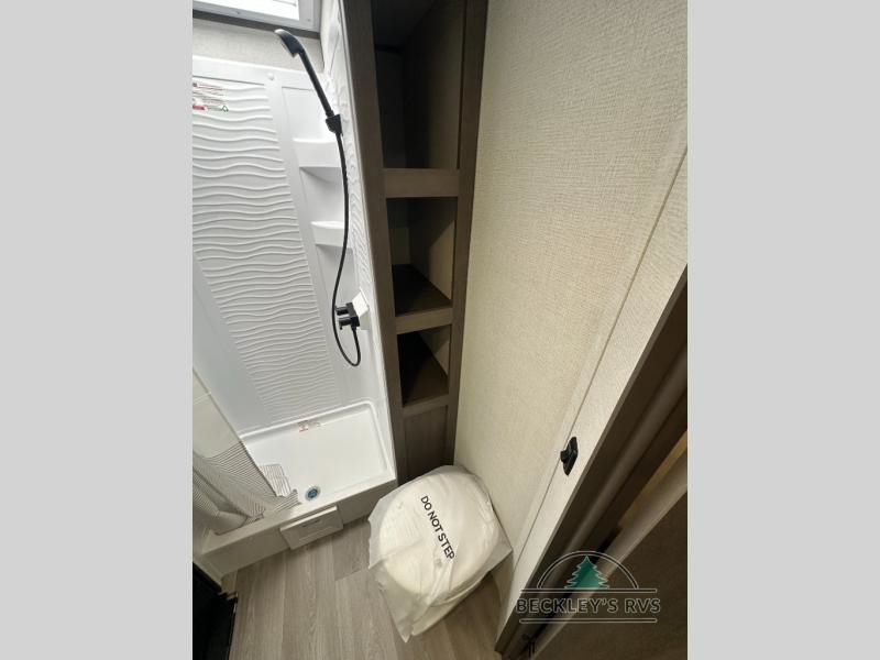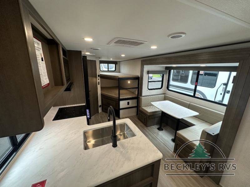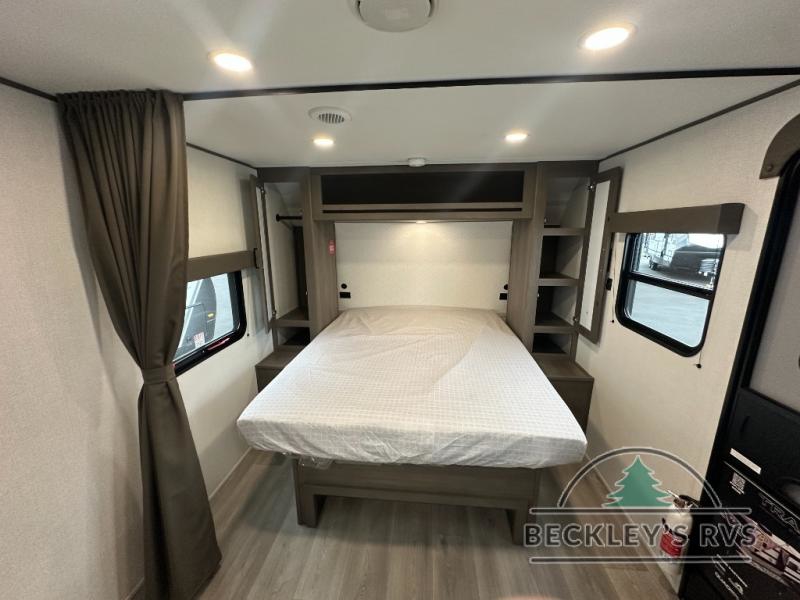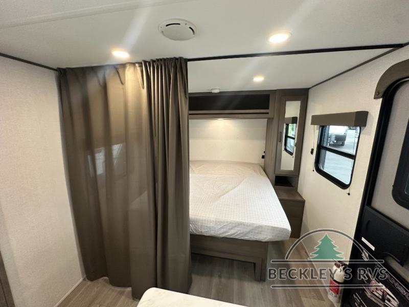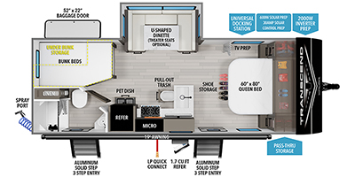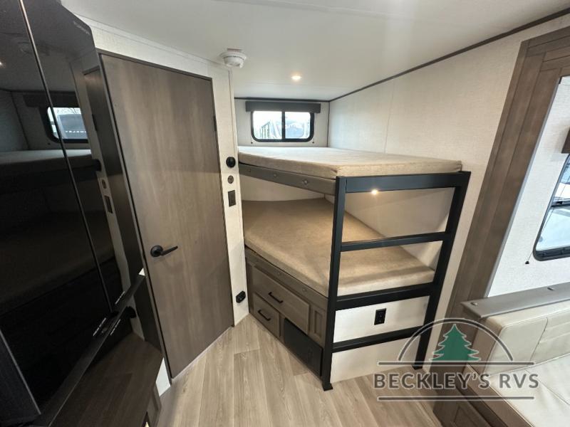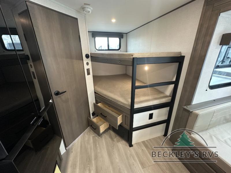 This fantastic travel trailer is designed to provide the ultimate in comfort, convenience, and adventure! The double-size bunk beds are perfect for kids, providing ample sleeping space and an under-bed storage space for all your belongings. The full bathroom features a linen closet, providing convenient storage for towels and toiletries. In the kitchen area, the U-shaped dinette is a great spot for creating memories that will last a lifetime, the refrigerator keeps your food and drinks fresh, while the microwave provides a quick and easy way to prepare meals. And for major convenience, the pull-out trash makes cleaning up a simple task. Take a nap in the comfortable front queen bed, which is a serene retreat, providing a comfortable spot to rest and relax. Jump to the exterior in a comfortable way with the double entry/exit door providing added convenience and flexibility, while the exterior awning provides shade and protection from the elements. The pass-through storage offers ample space for your outdoor gear and equipment.
