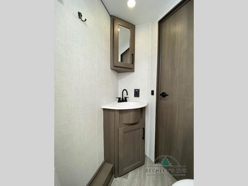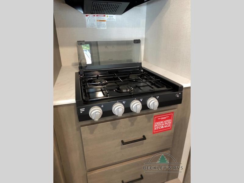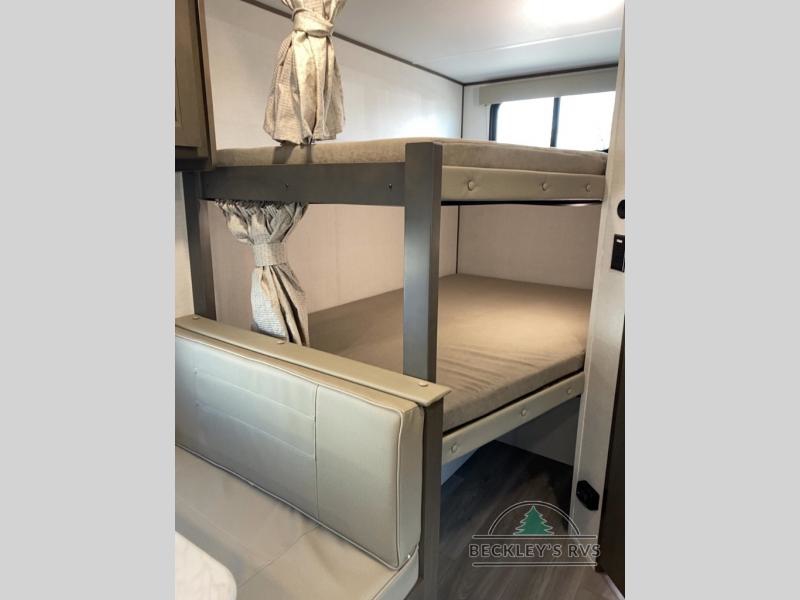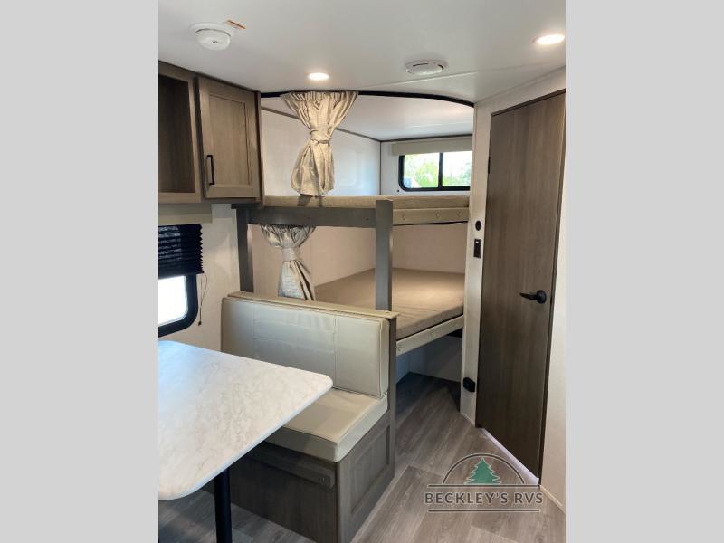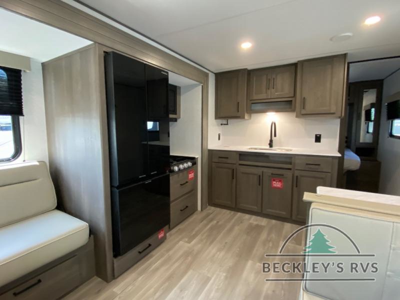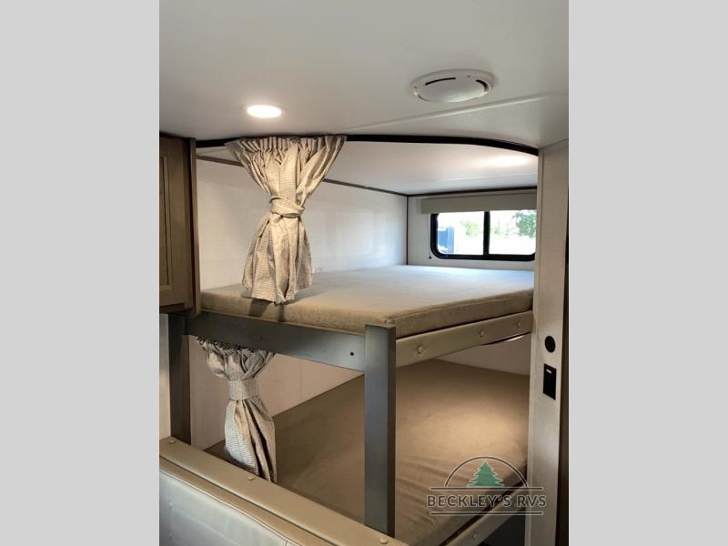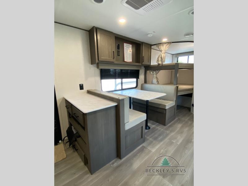 Camping with your larger family or when you want to take along a few extra friends is easy with this trailer. This unit sleeps nine with the double-size bunks in the rear corner, the 60" roll over sofa, and the queen bed in the front semi-private bedroom. The booth dinette can also be used to sleep a guest or two little ones at night once converted. Prepare your meals on the three-burner cooktop indoors, or out on the two-burner cooktop at the outside kitchen! You'll also find a handy exterior spray port and an outdoor refrigerator for cold drinks! It will be so easy to fill the dog's food bowl with the added pet dish under the refrigerator, and the full bath in this model means you don't have to use the camp's facilities. Having a 17' awning outside along with a large unobstructed pass-through compartment allows you extended living outdoors and plenty of space for all of your gear!