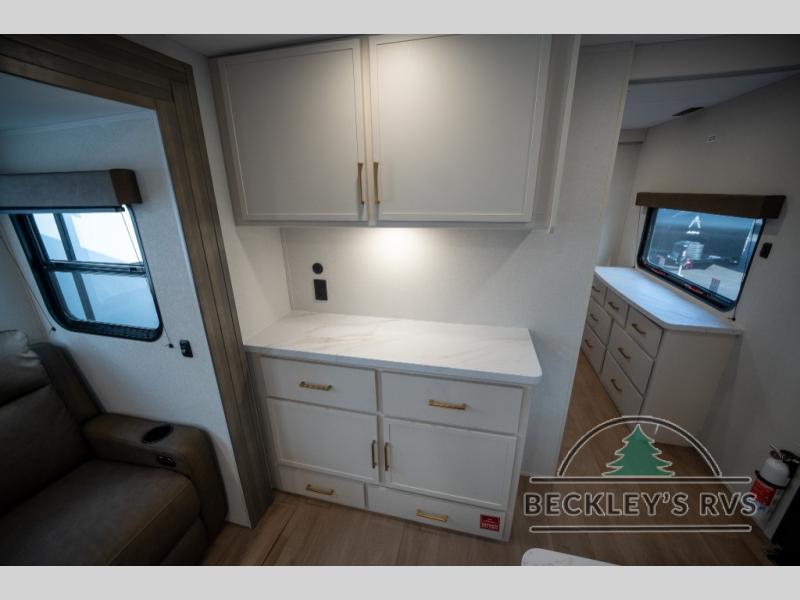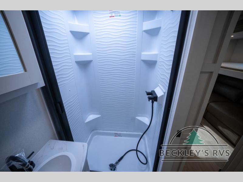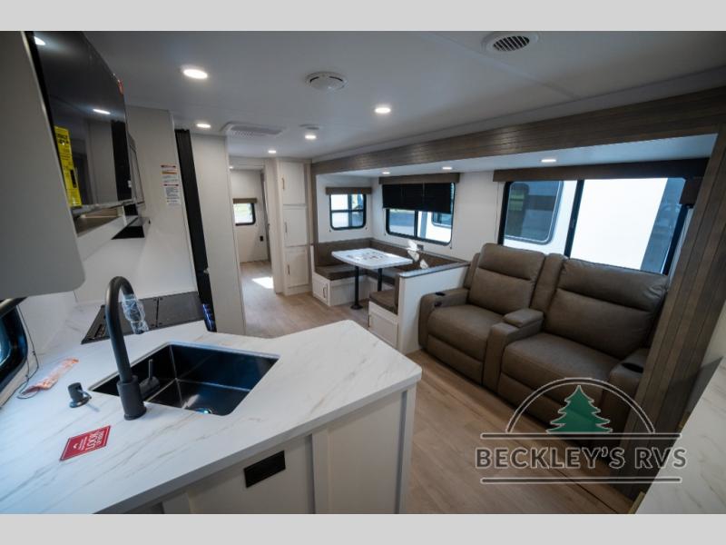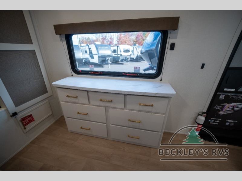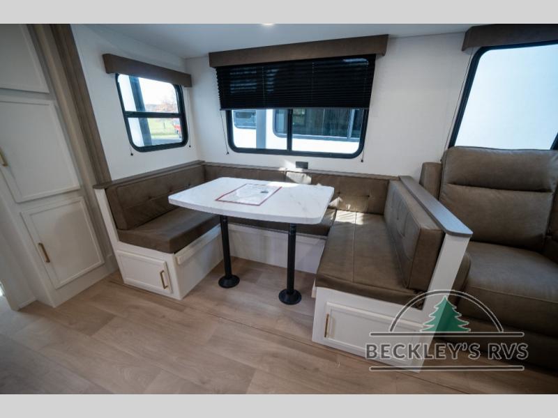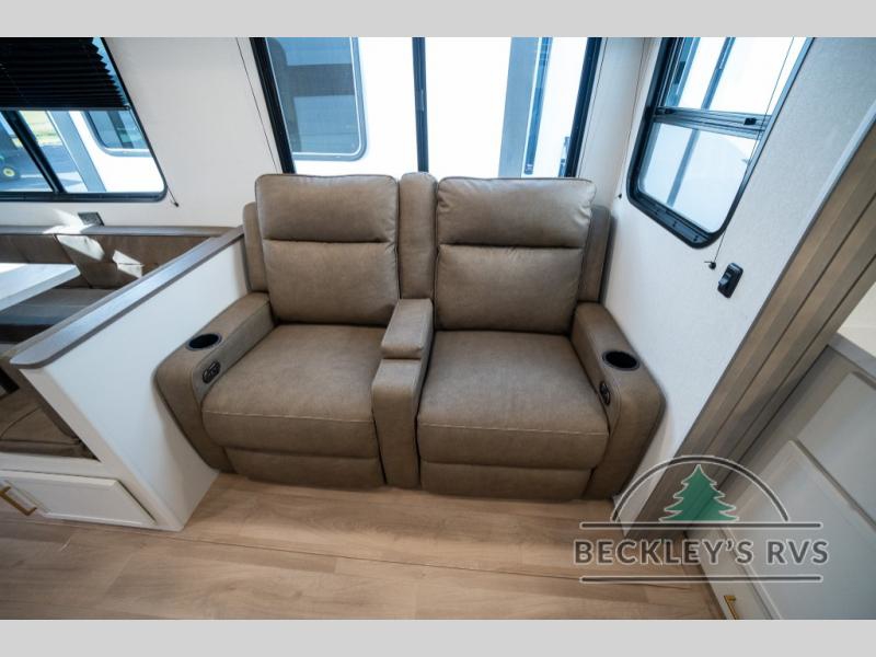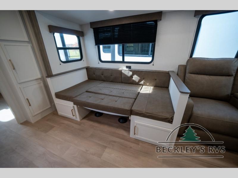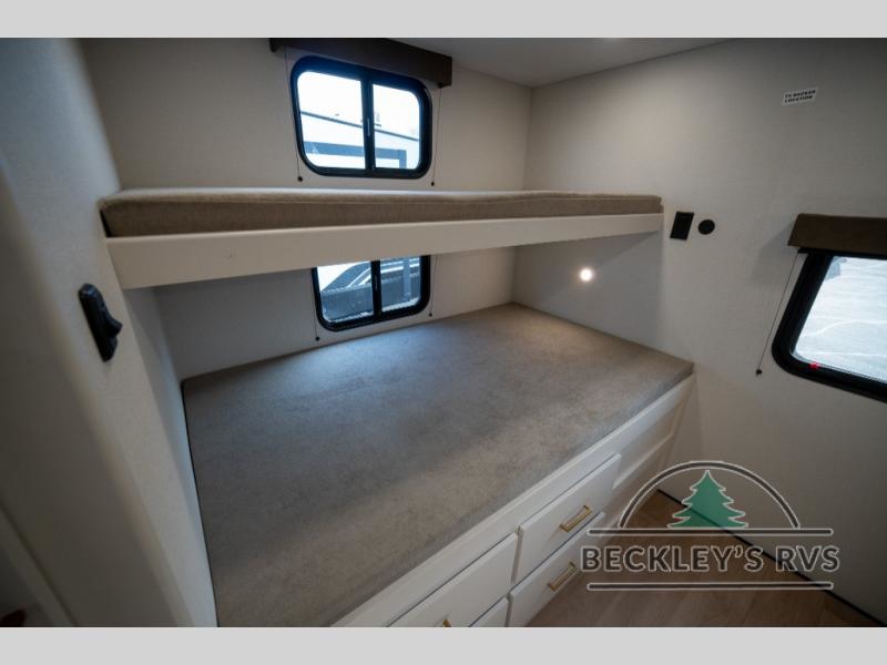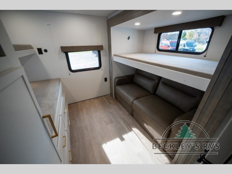 If you're looking for a travel trailer that can house your whole gang, this unit is the one! The rear private bunkhouse can sleep up to five since there is a sleeper sofa and three bunks, plus there are storage drawers for your guests' things. A front private bedroom will be perfect for the owners with a queen bed slide out and spacious front closet with washer and dryer prep! Whether you cook outside on the exterior griddle or inside on the three burner range, you'll be able to make your best meals. There is also a 12V French door refrigerator with a glass front and bottom freezer and a convection microwave/combo air fryer to enjoy some crispy fries! A U-shaped dinette and 60" sleeper sofa within the living room slide provides even more seating and sleeping space, or you can choose the optional theater seating!