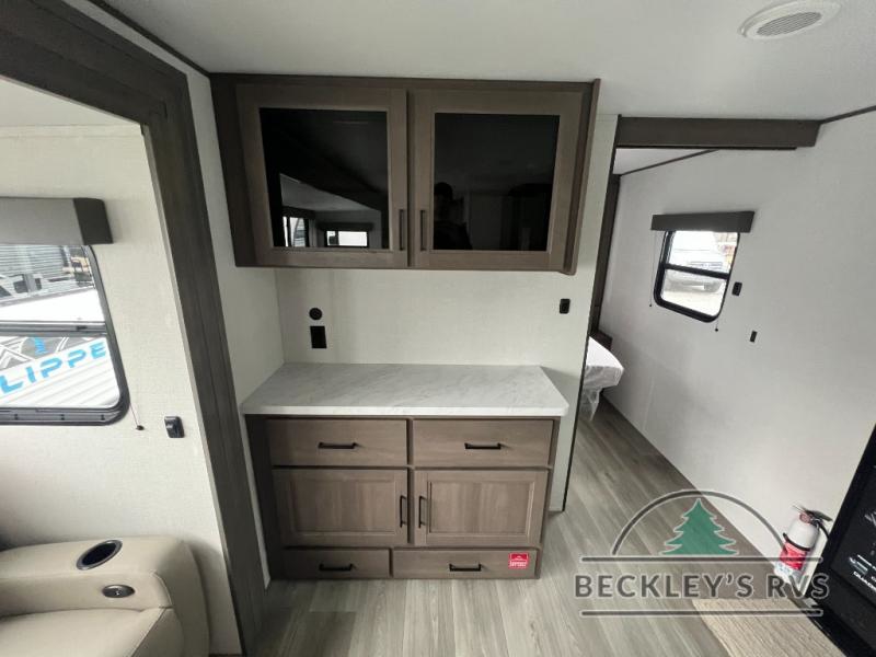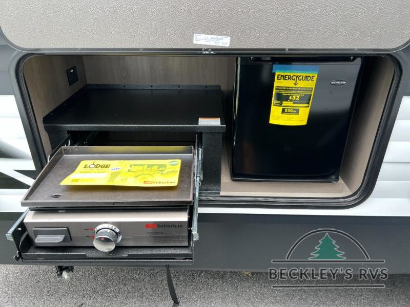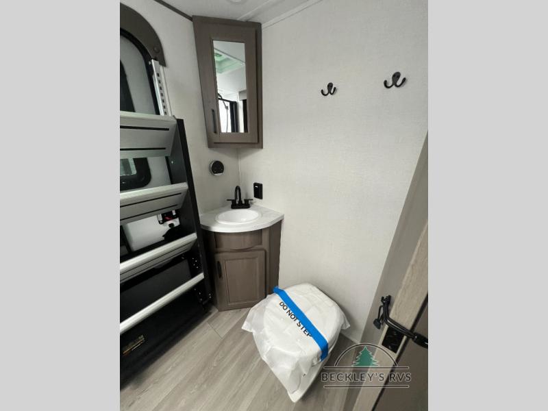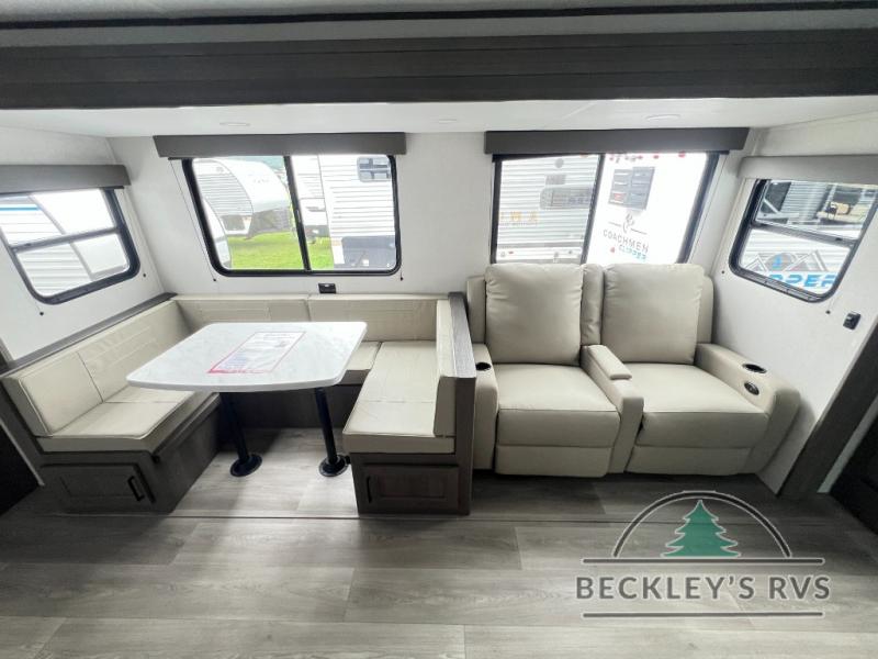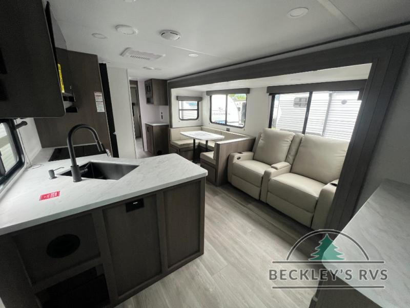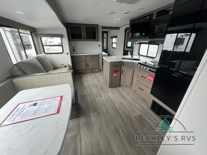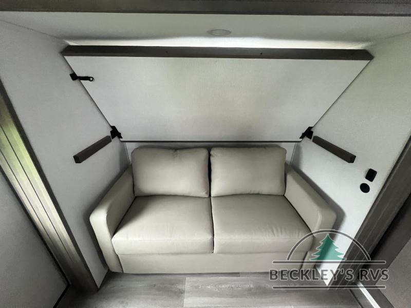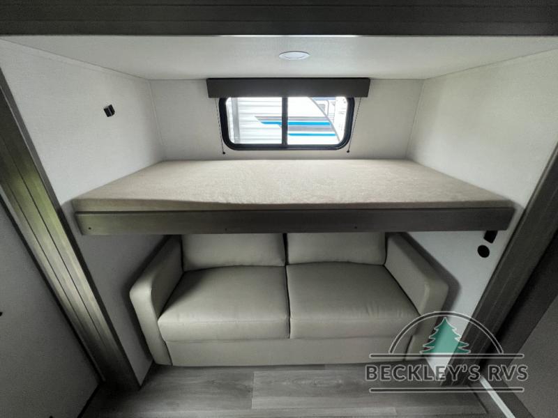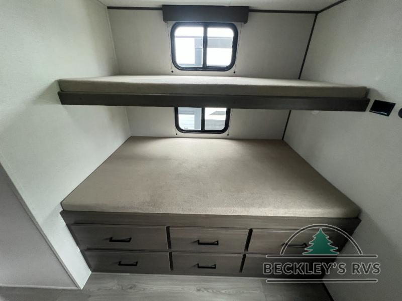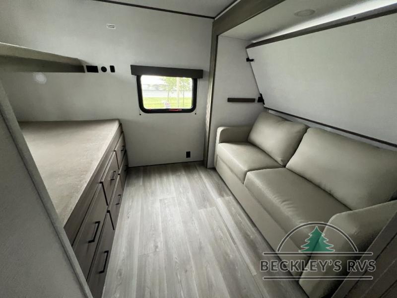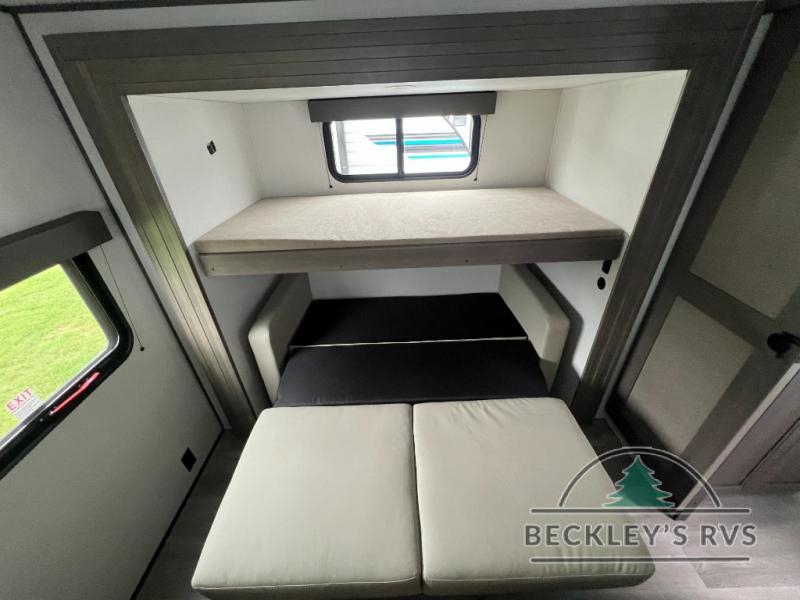 If you're looking for a travel trailer that can house your whole gang, this unit is the one! The rear private bunkhouse can sleep up to five since there is a sleeper sofa and three bunks, plus there are storage drawers for your guests' things. A front private bedroom will be perfect for the owners with a queen bed, storage space, and a convenient laundry chute! Whether you cook outside on the exterior griddle or inside on the three burner range, you'll be able to make your best meals. There is also a 12V French door refrigerator with a glass front and bottom freezer and a convection microwave/combo air fryer for easy meals! A U-shaped dinette and 60" sleeper sofa within the living room slide provides even more seating and sleeping space, or you can choose the optional theater seat in place of the sofa if you're not needing the extra sleeping space!