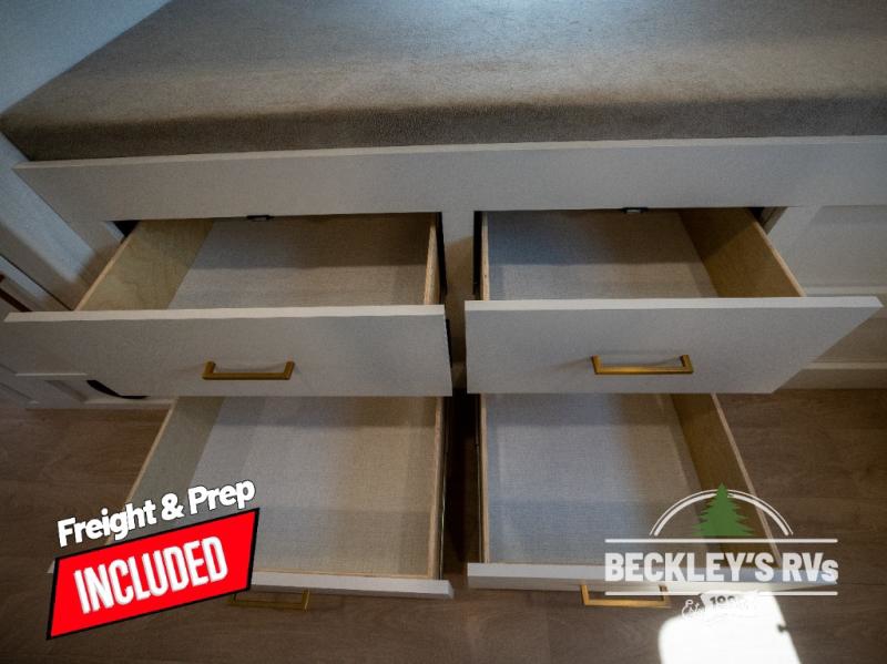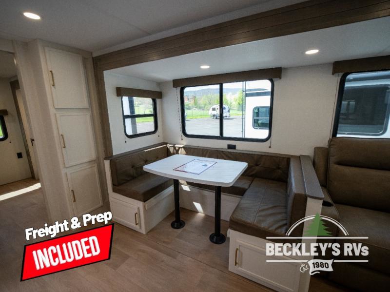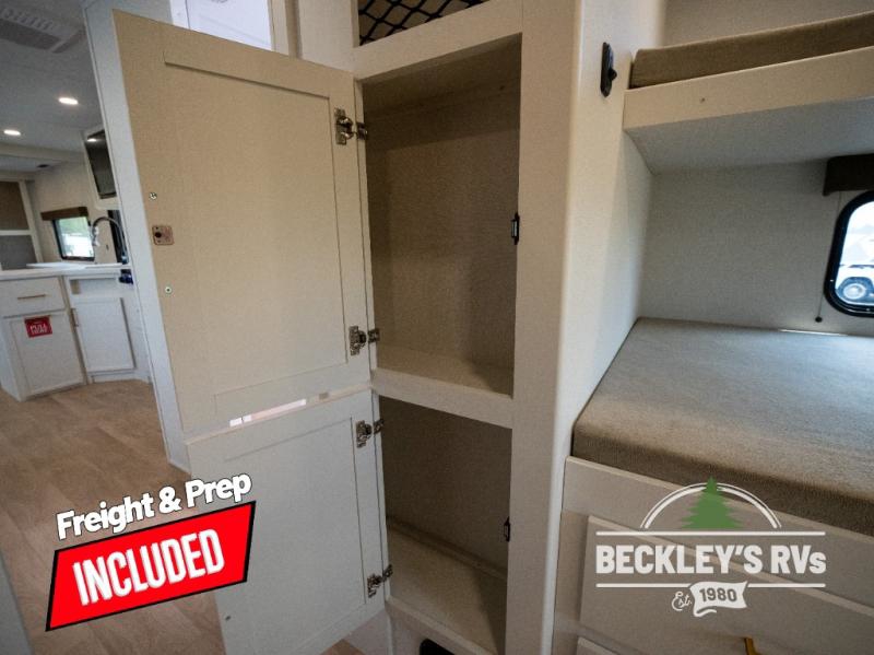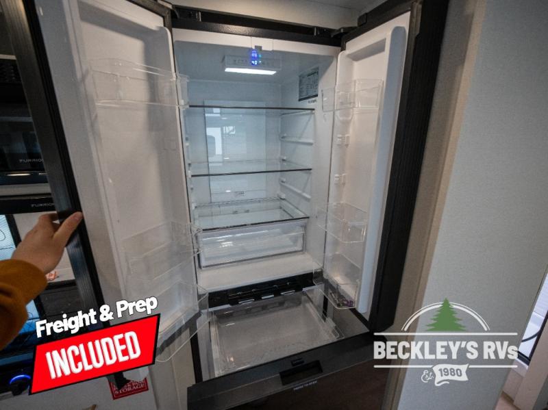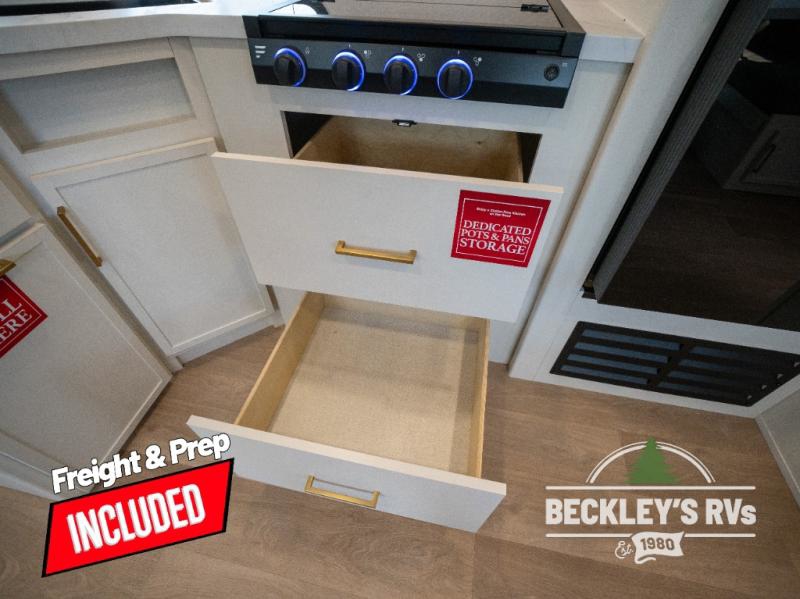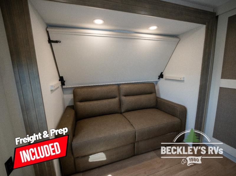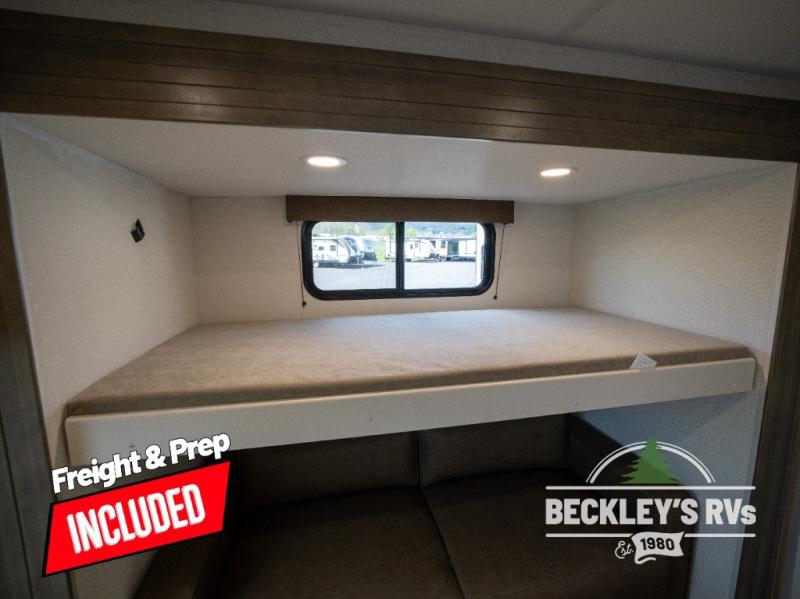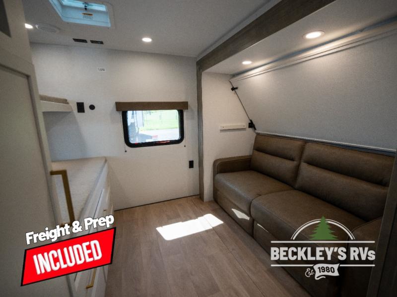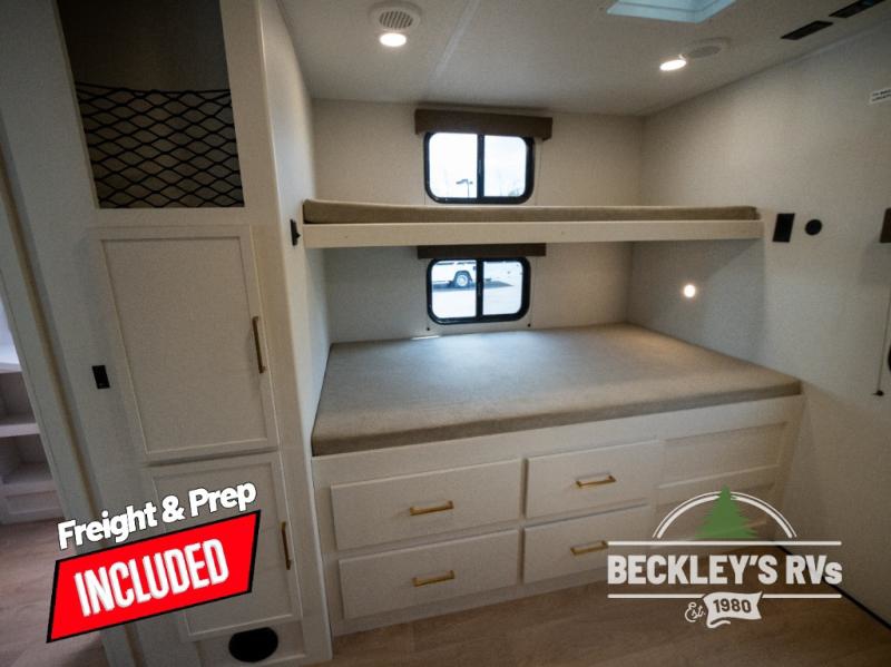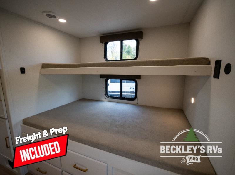 If you're looking for a travel trailer that can house your whole gang, this unit is the one! The rear private bunkhouse can sleep up to five since there is a sleeper sofa and three bunks, plus there are storage drawers for your guests' things. A front private bedroom will be perfect for the owners with a queen bed slide out and spacious front closet with washer and dryer prep! Whether you cook outside on the exterior griddle or inside on the three burner range, you'll be able to make your best meals. There is also a 12V French door refrigerator with a glass front and bottom freezer and a convection microwave/combo air fryer to enjoy some crispy fries! A U-shaped dinette and 60" sleeper sofa within the living room slide provides even more seating and sleeping space, or you can choose the optional theater seating!