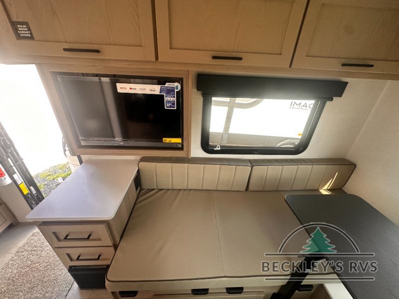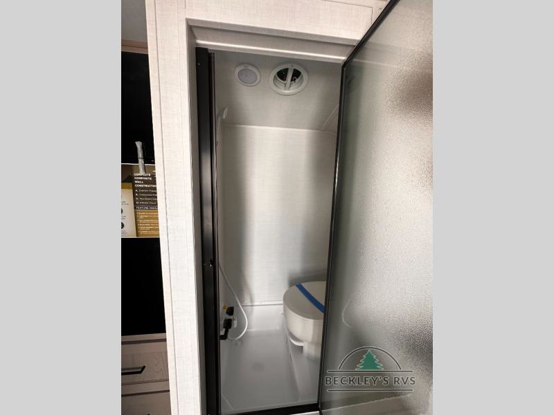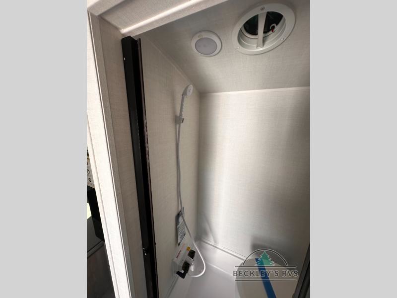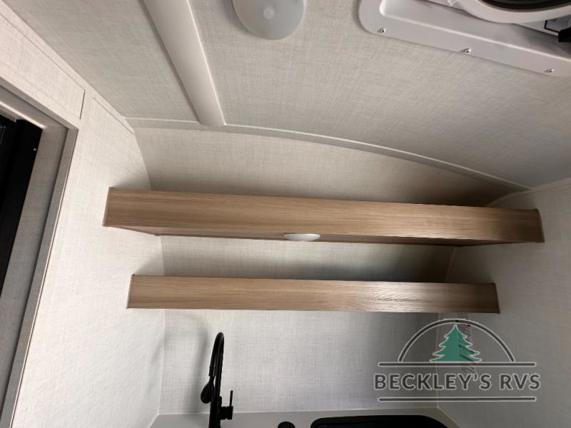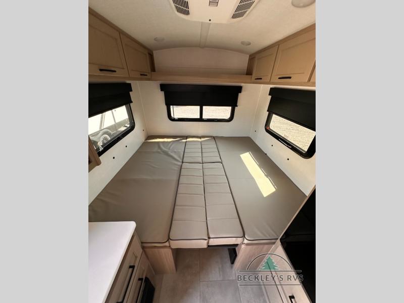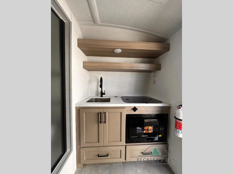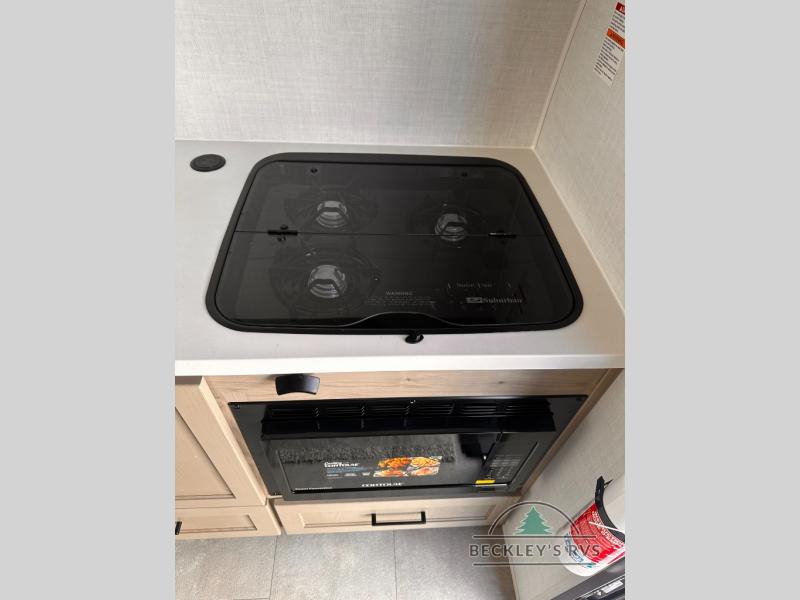 It won't be hard to find comfort in this travel trailer. It may be smaller on size, but it doesn't skim on features. The twin beds convert to a king-size bed for your comfort, and there is even a 32" 12V TV to enjoy in the evenings. The kitchen includes a three burner cooktop, a convection microwave, plus a 12V refrigerator for perishables. You'll find overhead compartments for your valuables and exterior storage for your hiking gear!