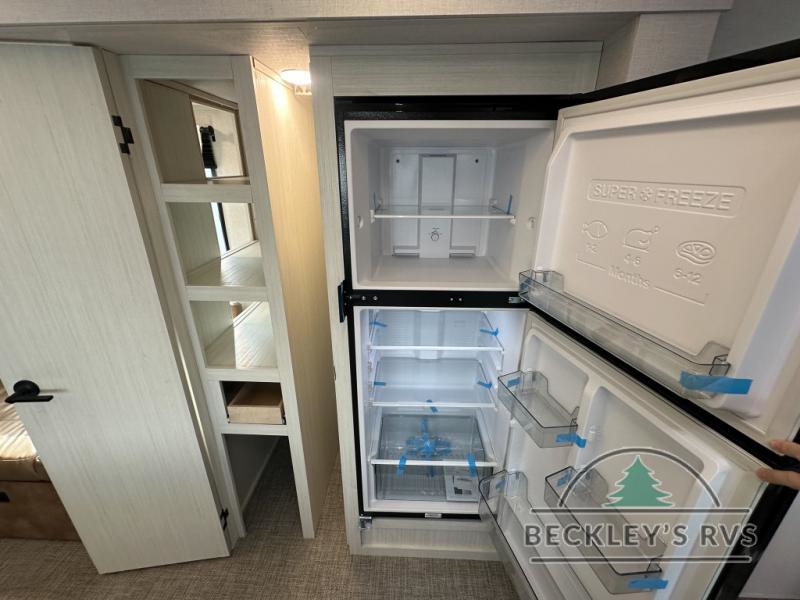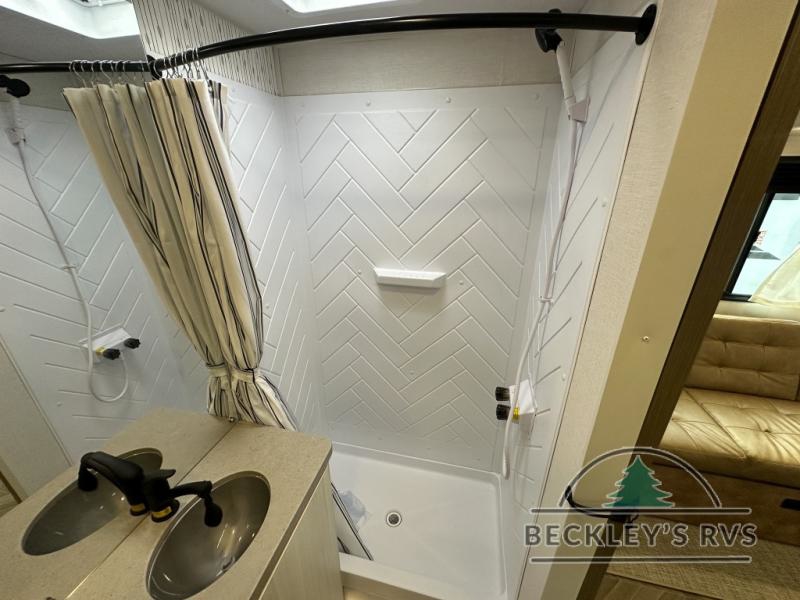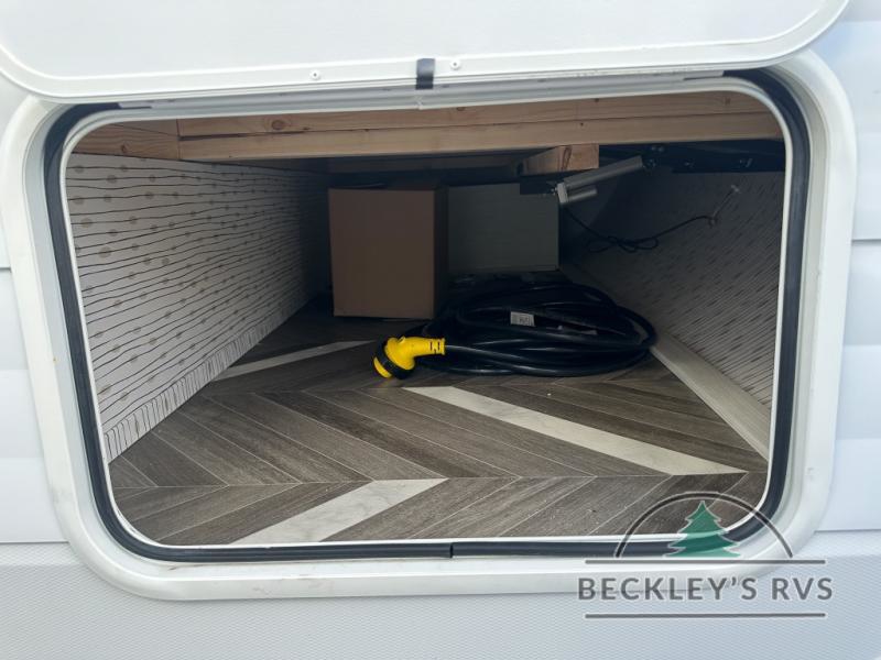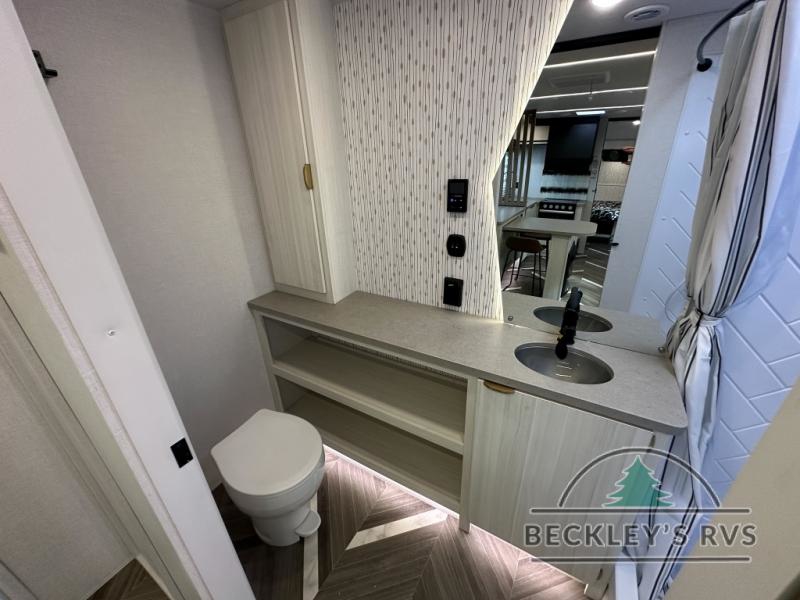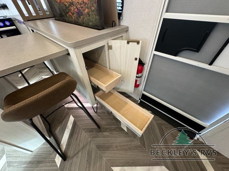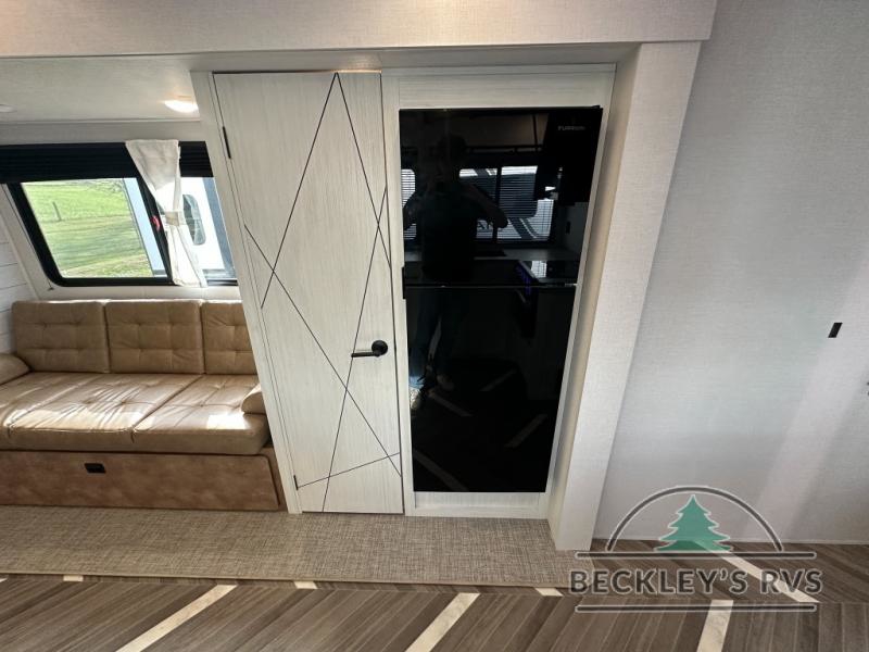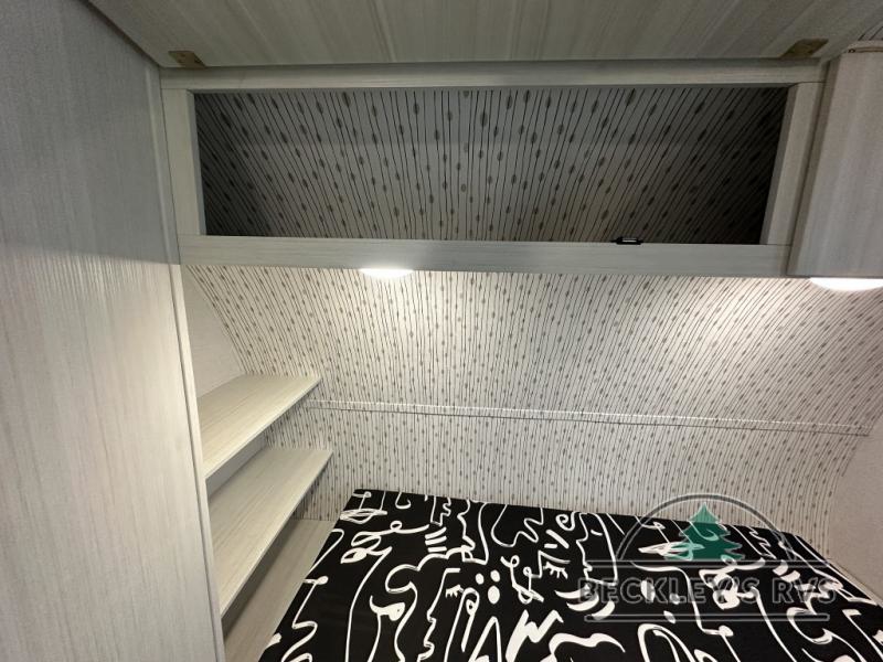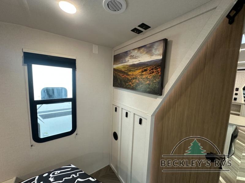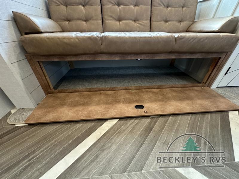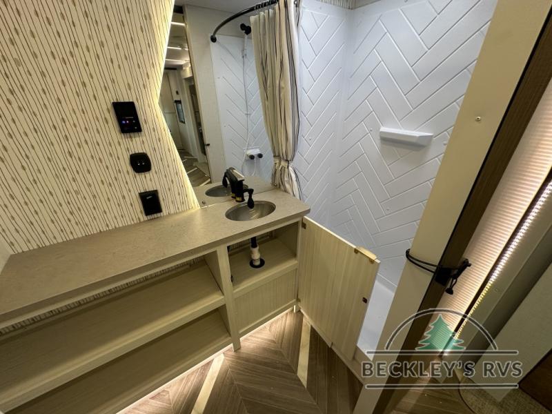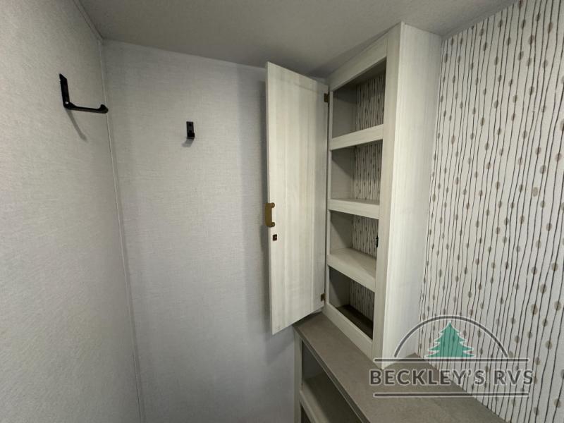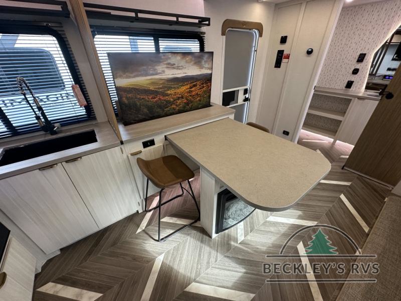 This travel trailer is perfect for two! Ita has a rear bathroom, a convenient and private space, featuring shelves for storing essentials and linens. The living area is a comfortable space, featuring a plush sofa and a televator for easy TV viewing. Plus, a fireplace that will add warmth and ambiance for cold seasons, creating a relaxing atmosphere. A pull-out table provides a convenient spot for meals or snacks. The kitchen is equipped with a microwave for quick reheating and a refrigerator for keeping drinks and ingredients fresh. In the main bedroom, you will find a king-sized bed for ultimate comfort and relaxation, and a wardrobe for storing your clothes.