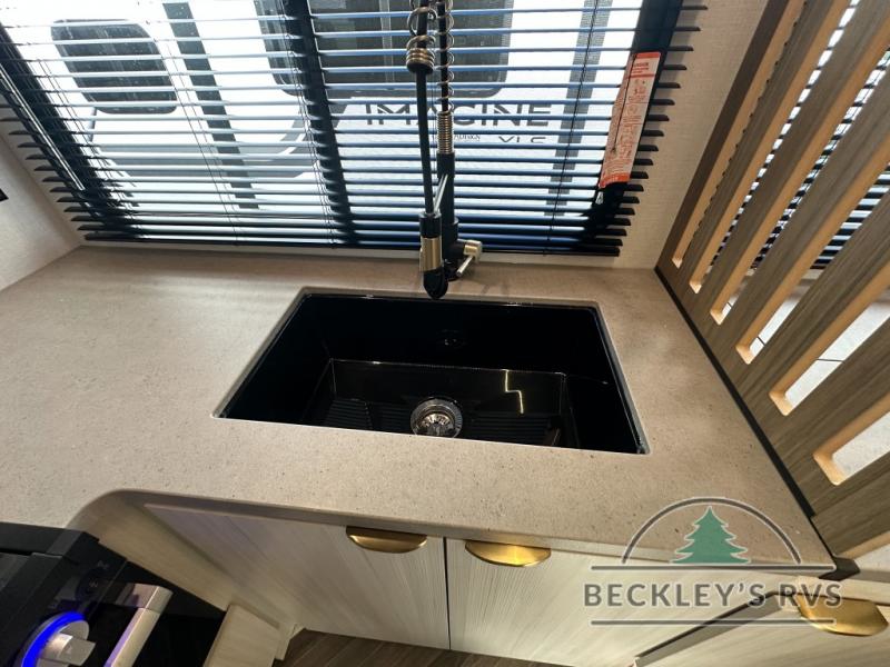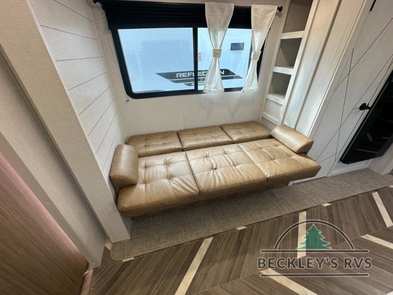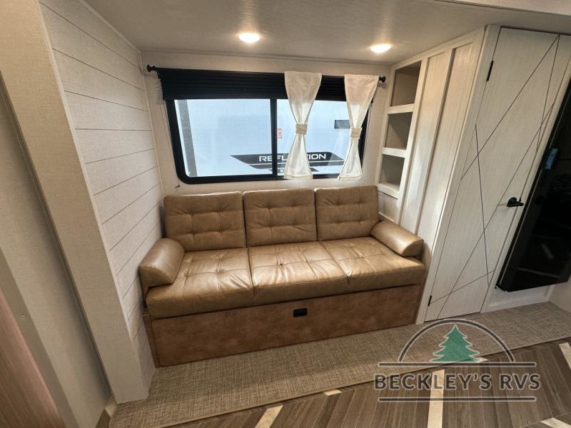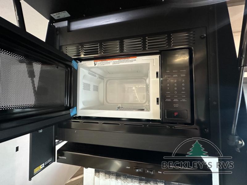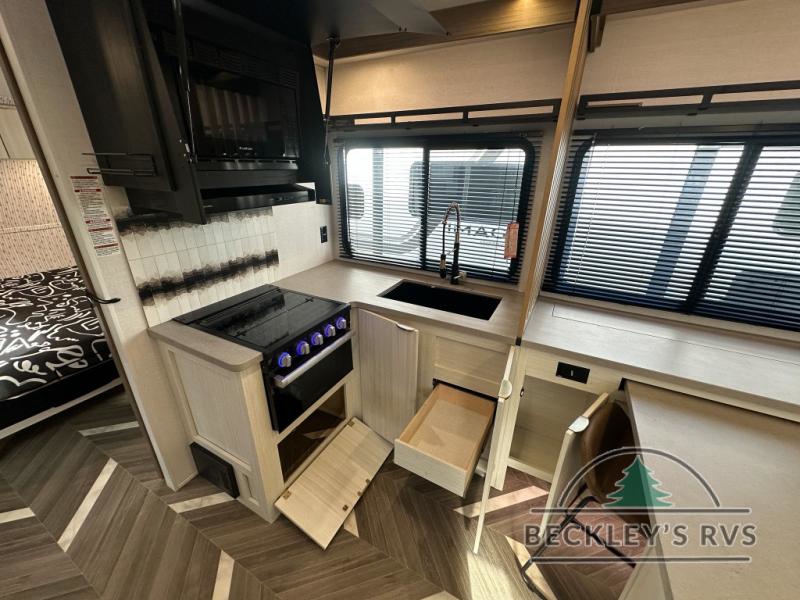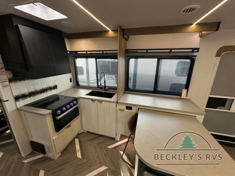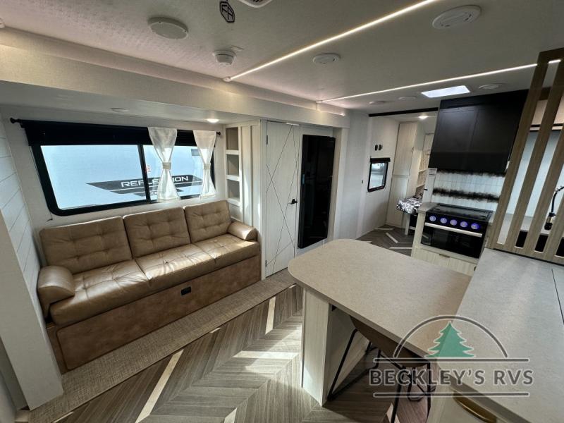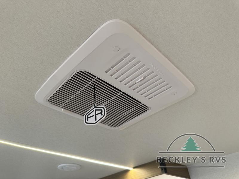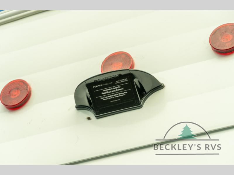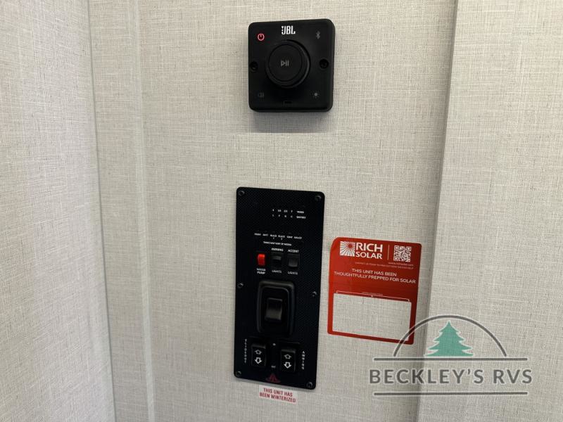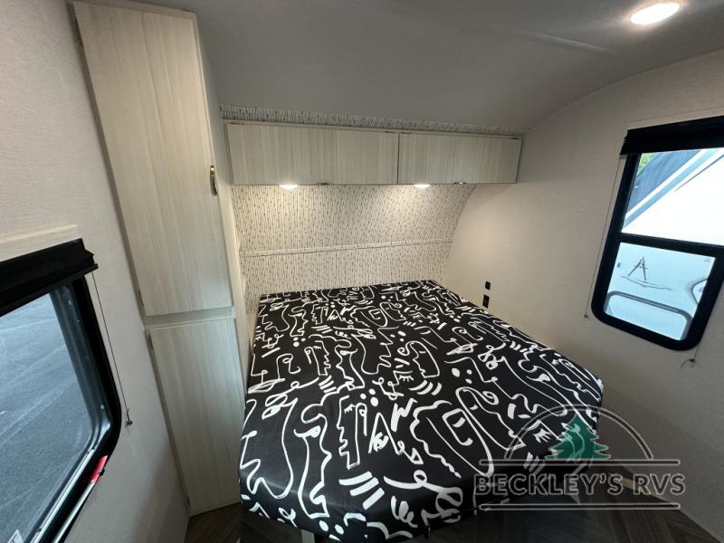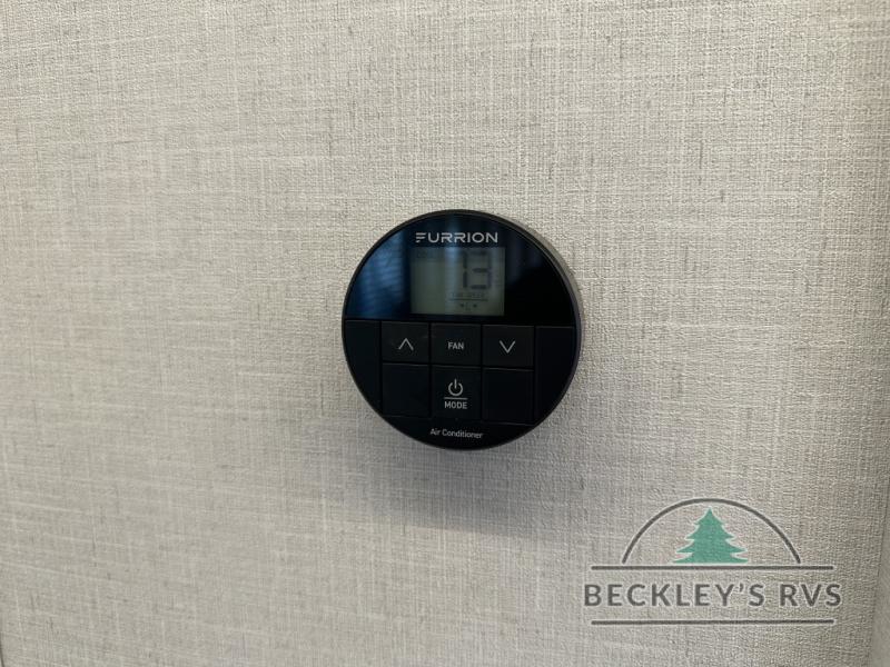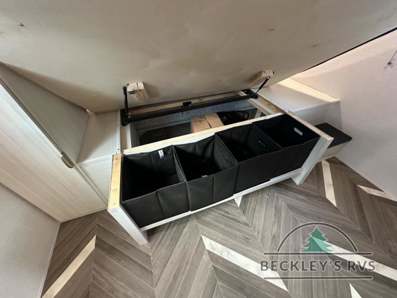 This travel trailer is perfect for two! Ita has a rear bathroom, a convenient and private space, featuring shelves for storing essentials and linens. The living area is a comfortable space, featuring a plush sofa and a televator for easy TV viewing. Plus, a fireplace that will add warmth and ambiance for cold seasons, creating a relaxing atmosphere. A pull-out table provides a convenient spot for meals or snacks. The kitchen is equipped with a microwave for quick reheating and a refrigerator for keeping drinks and ingredients fresh. In the main bedroom, you will find a king-sized bed for ultimate comfort and relaxation, and a wardrobe for storing your clothes.